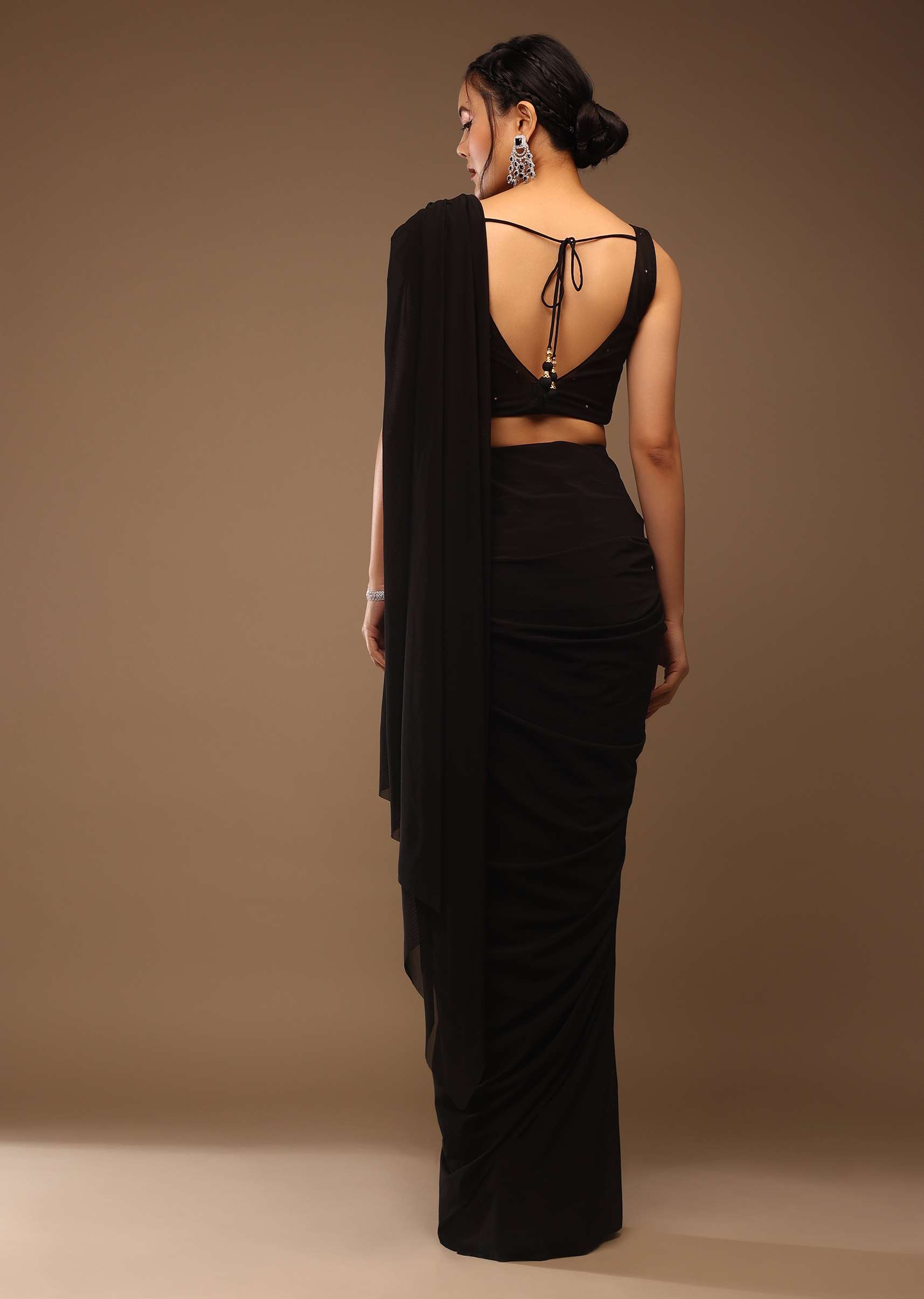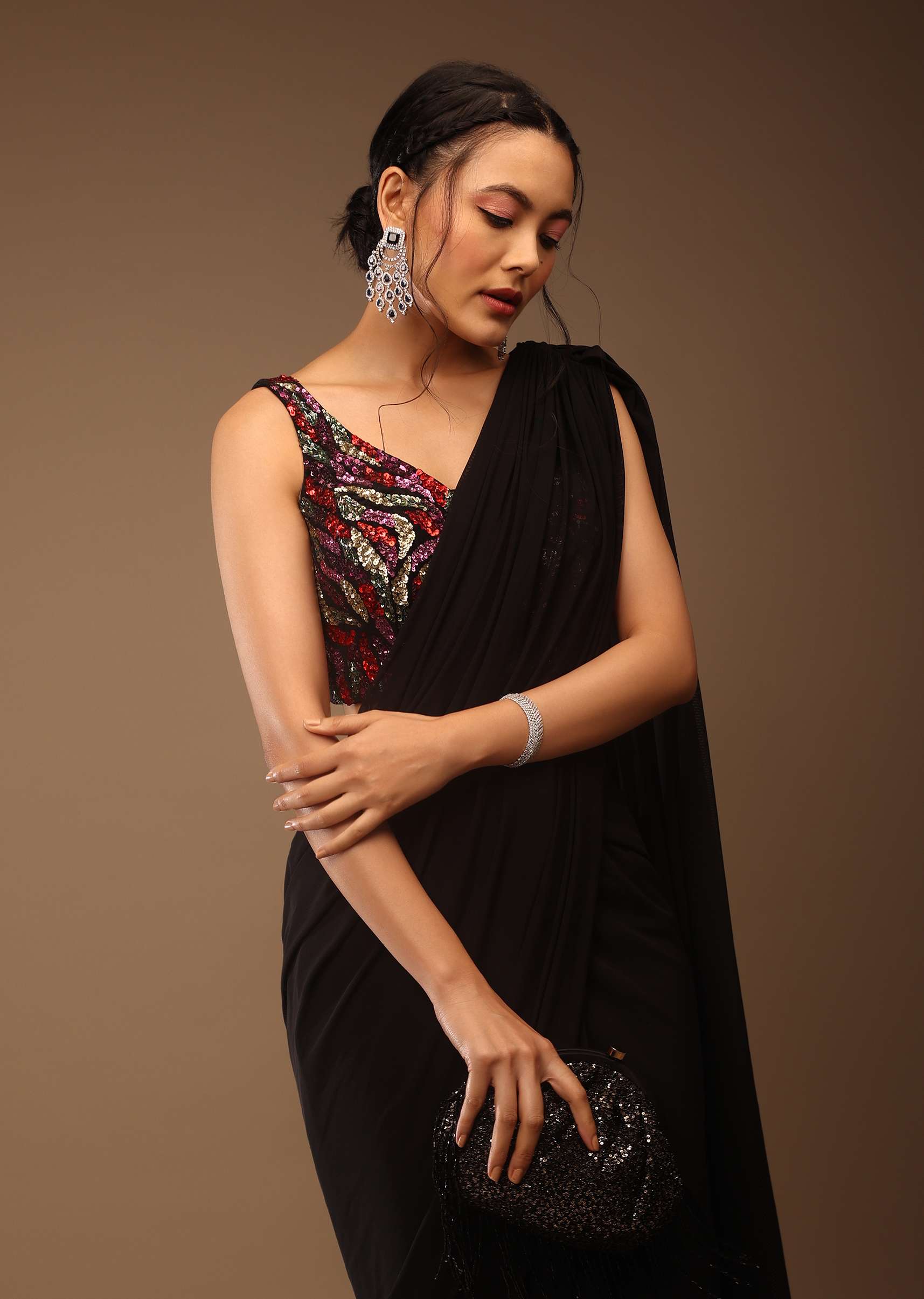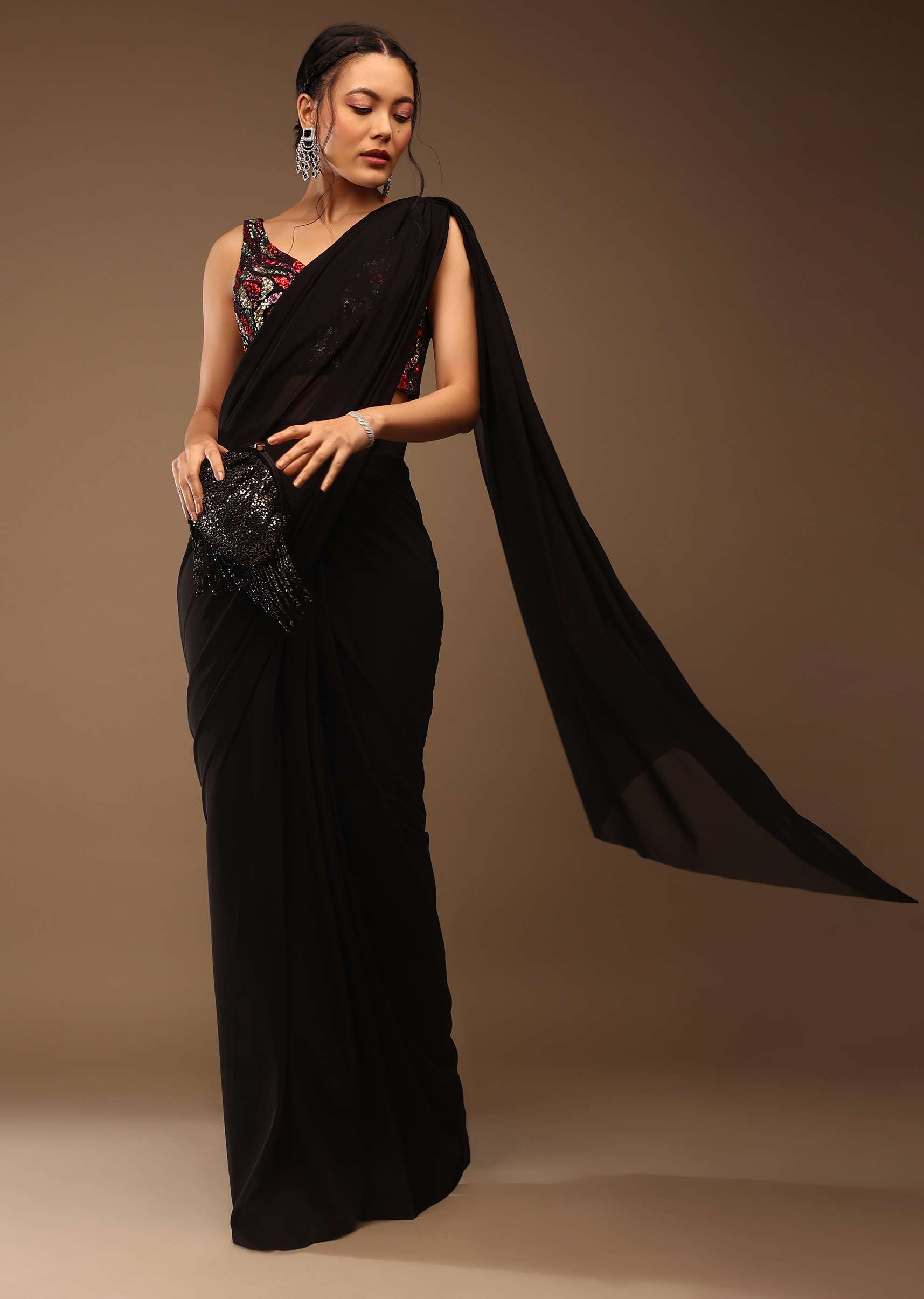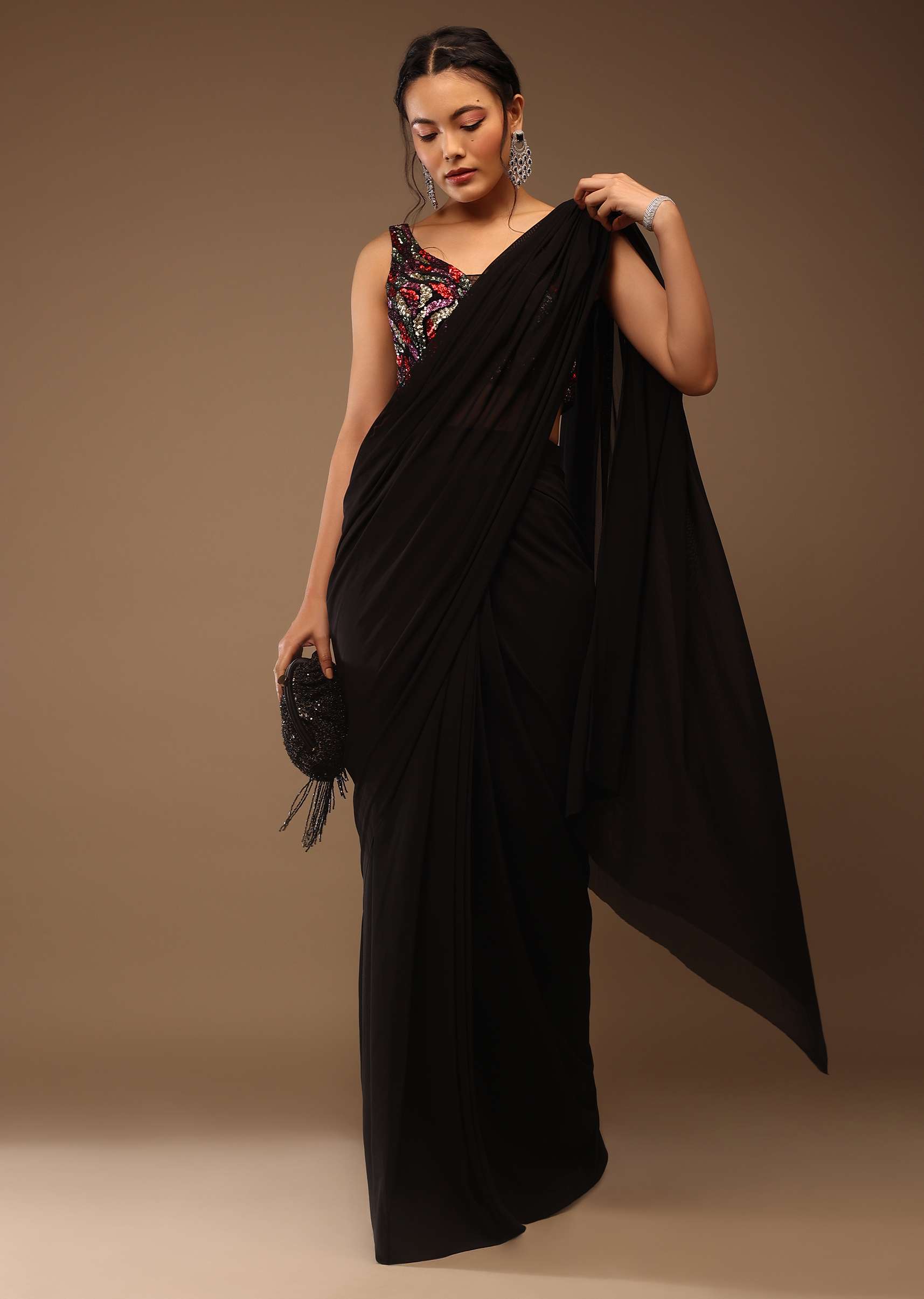 Black saree with a crop top in multi-colored sequins embellishment. The crop top is crafted in sleeveless and boat neckline in multicolored sequins front and back. It comes in padded, tie-up tassel Dori at the back and hooks closure. You can drape this ready-pleated saree for a summer backyard dinner party. Adorn it with dangling diamond earrings and a handwoven purse. Get a comfy yet dazzling look by draping this stunner at a pool or drinking party. NOTE - The tassles may vary. Planning for a The saree is crafted in lycra with side hooks closure. The length of the blouse comes in 16 inches and the saree comes in the 47 inches. Model height - 5'10 bust - 32 inches wearing size Small. Awarded As The Most Trusted Brand We'Re Delivering Styles You Love Just As Promised.