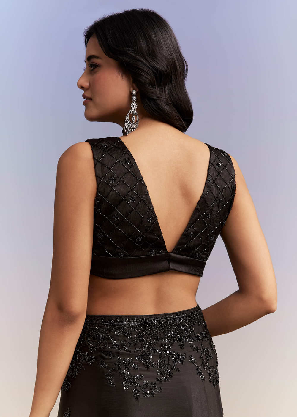 Black Satin Chinon Saree With Heavy Hand Embroidery