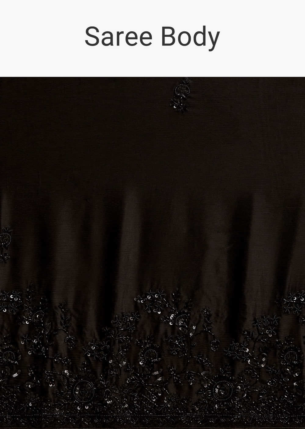 If evening drama is the goal, this black satin chinon saree blends fluid drape with tone-on-tone richness. Heavy black floral embroidery with sequins, cutdana and beads runs all over, complemented... More Product Details
