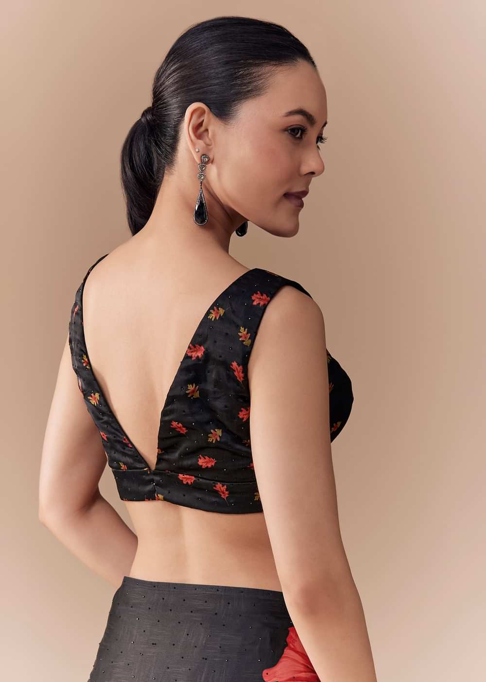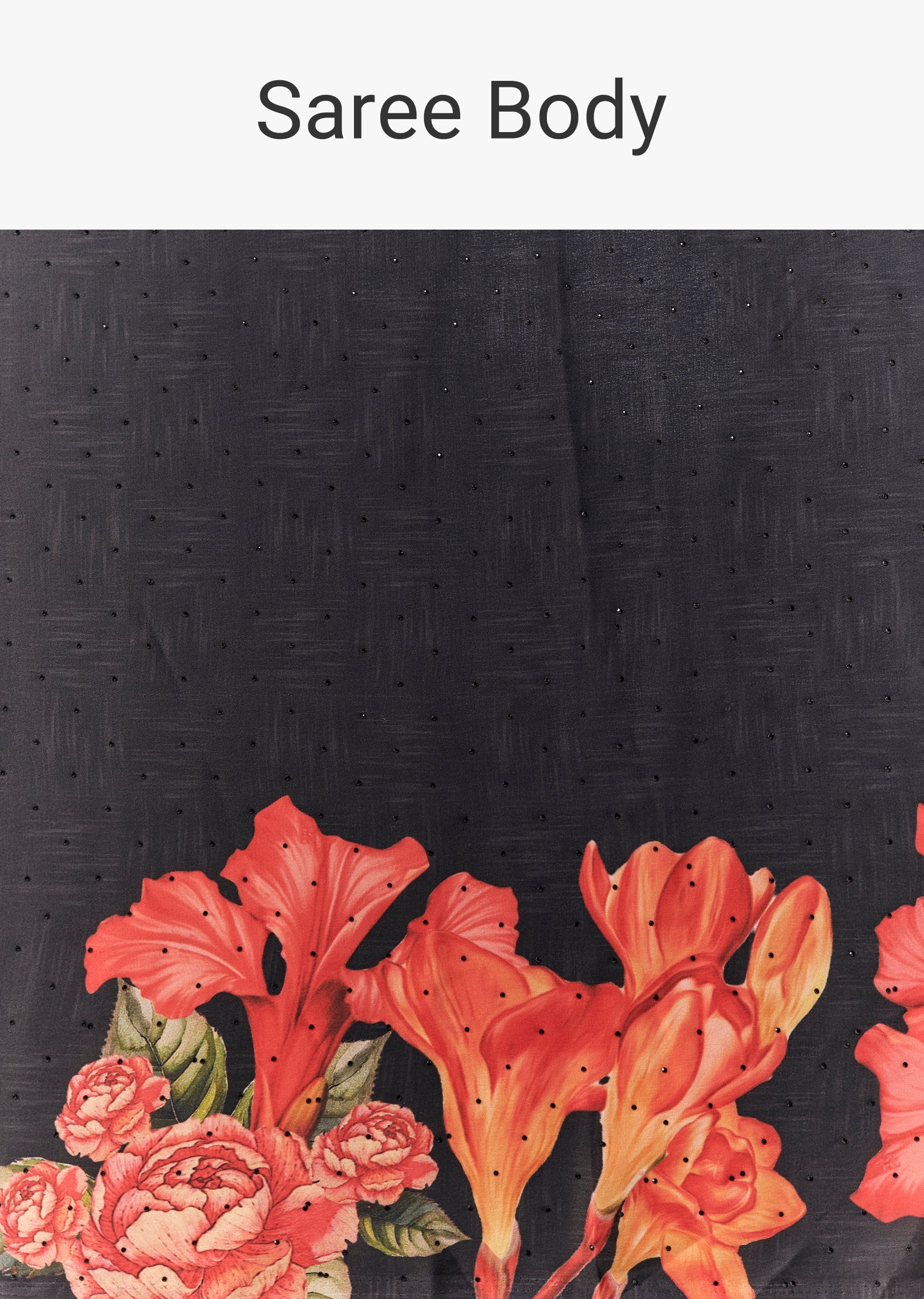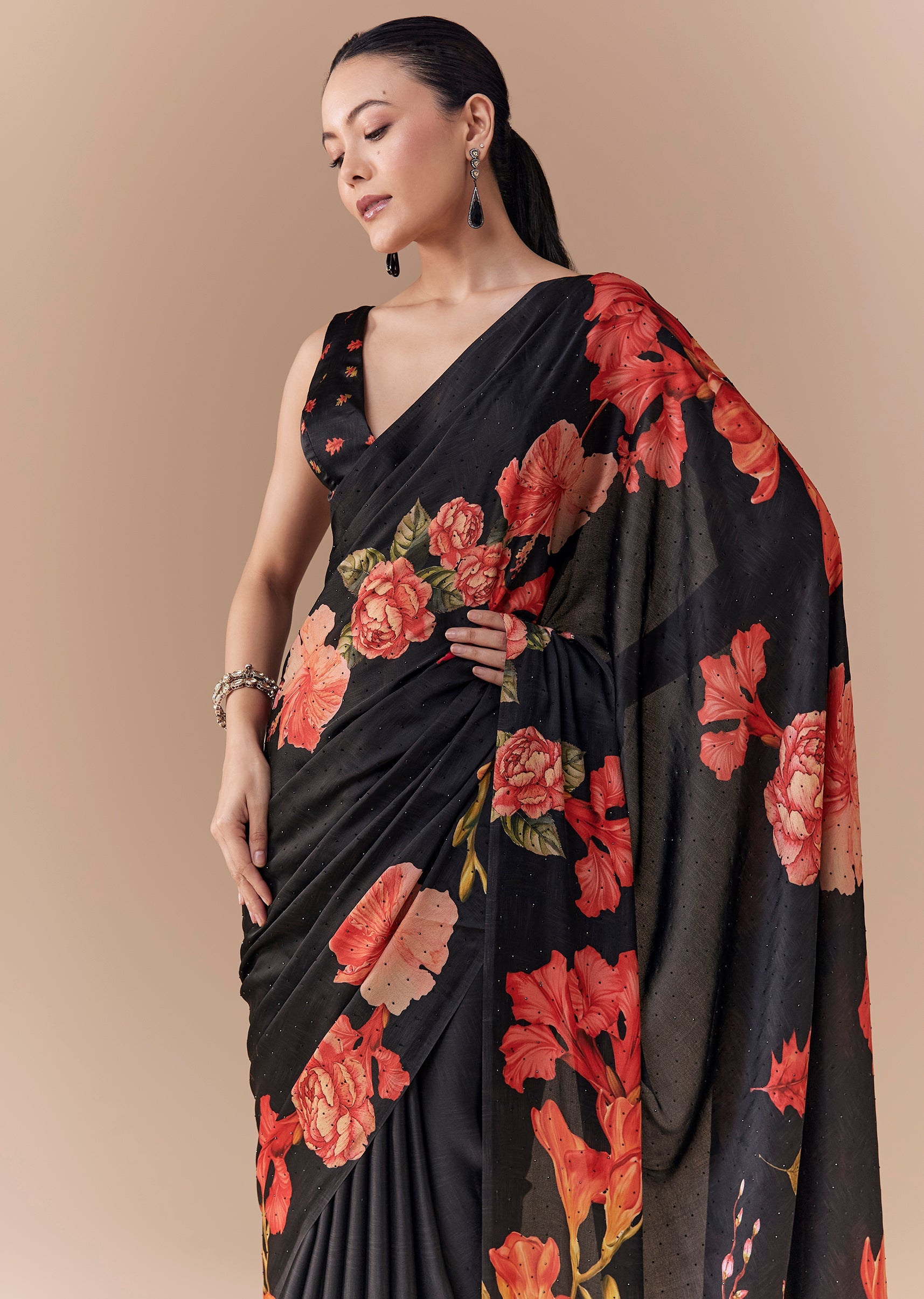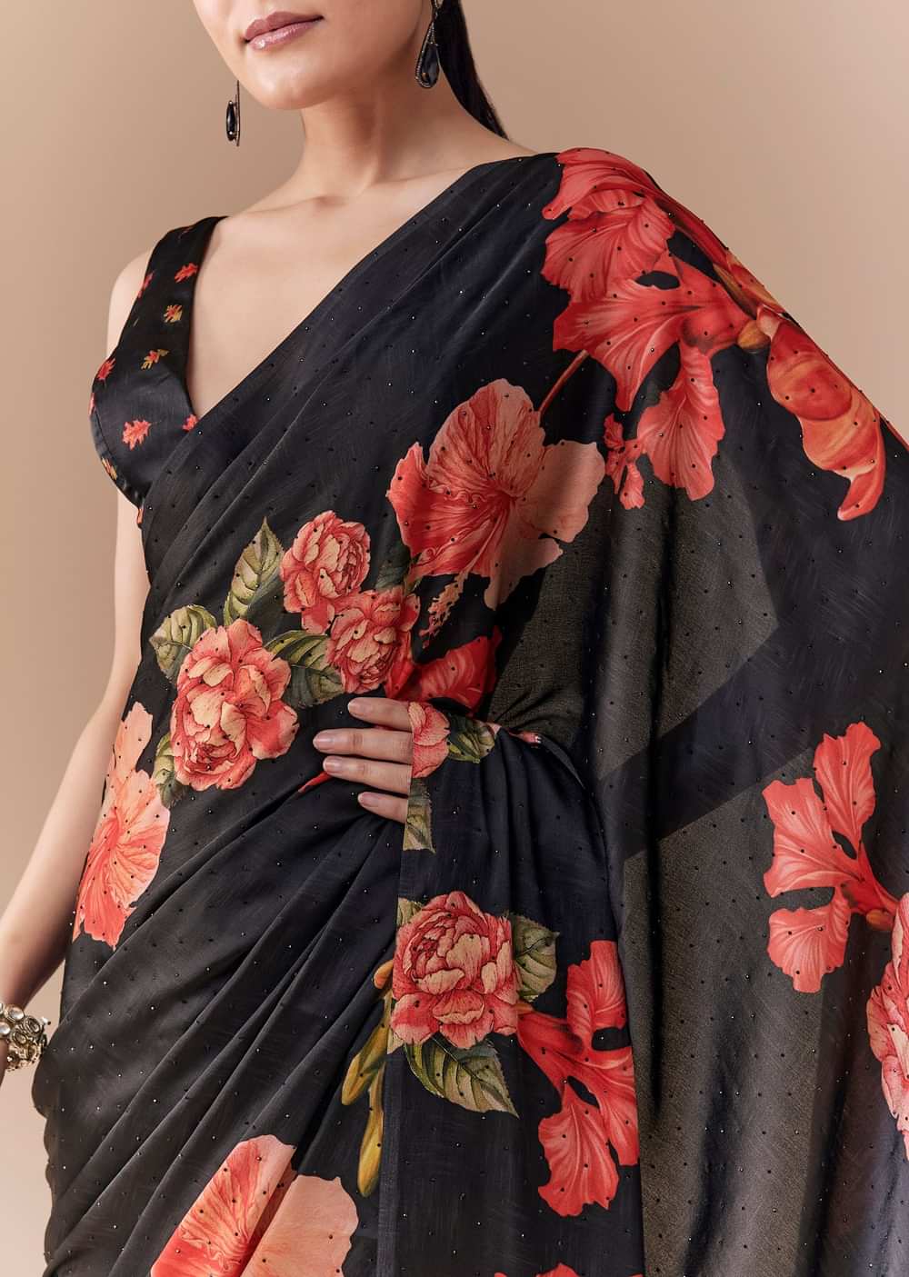 Enhance your elegant charm with this black satin saree, adorned with striking red multi-shaded floral prints all over. The saree is beautifully embellished with delicate stones, adding a touch of shimmer to its rich, smooth drape. Crafted from luxurious satin fabric, it exudes sophistication and timeless appeal. Perfect for festive occasions, evening gatherings, or special celebrations. Awarded as the Most Trusted Brand, we're delivering styles you love, just as promised.