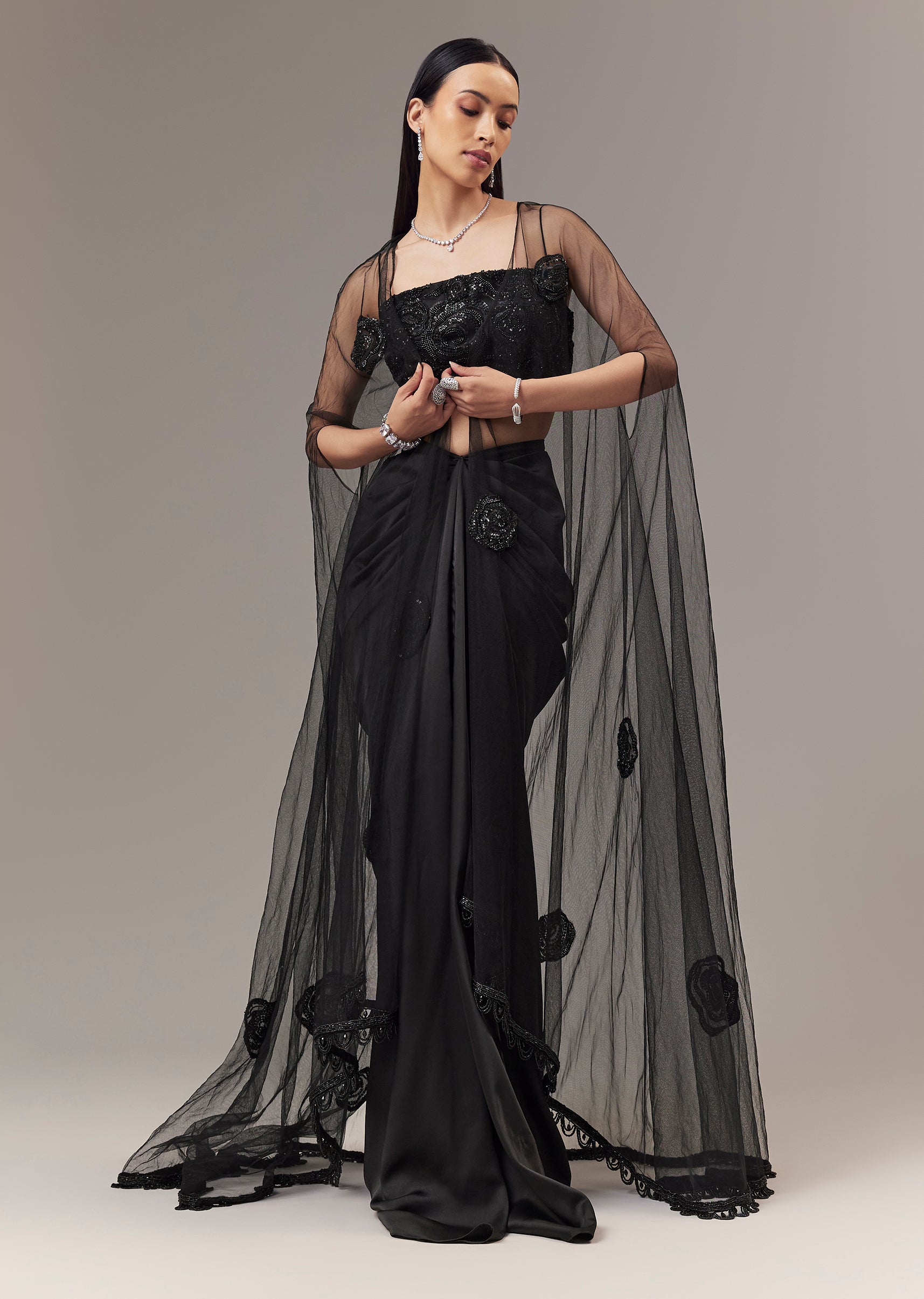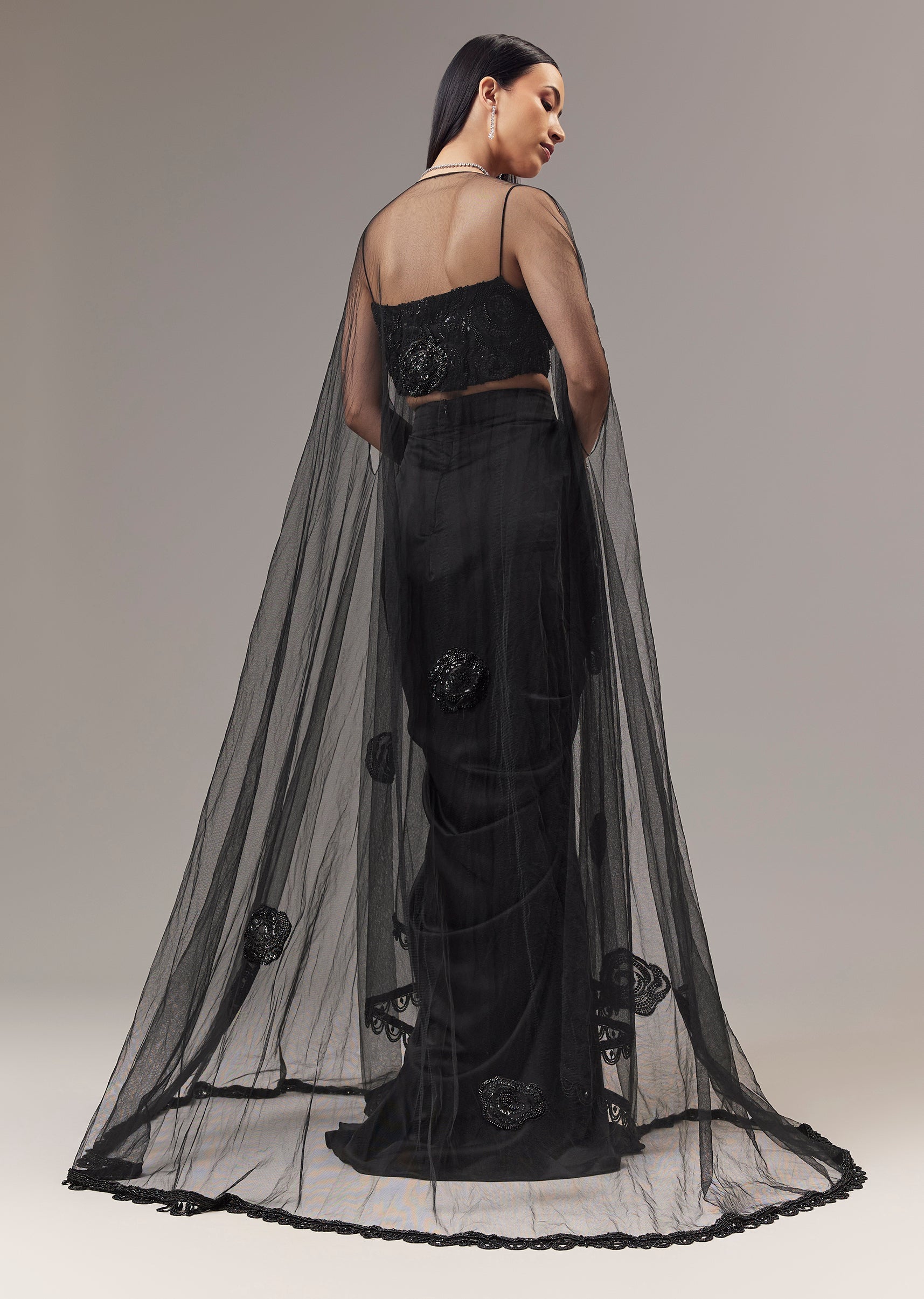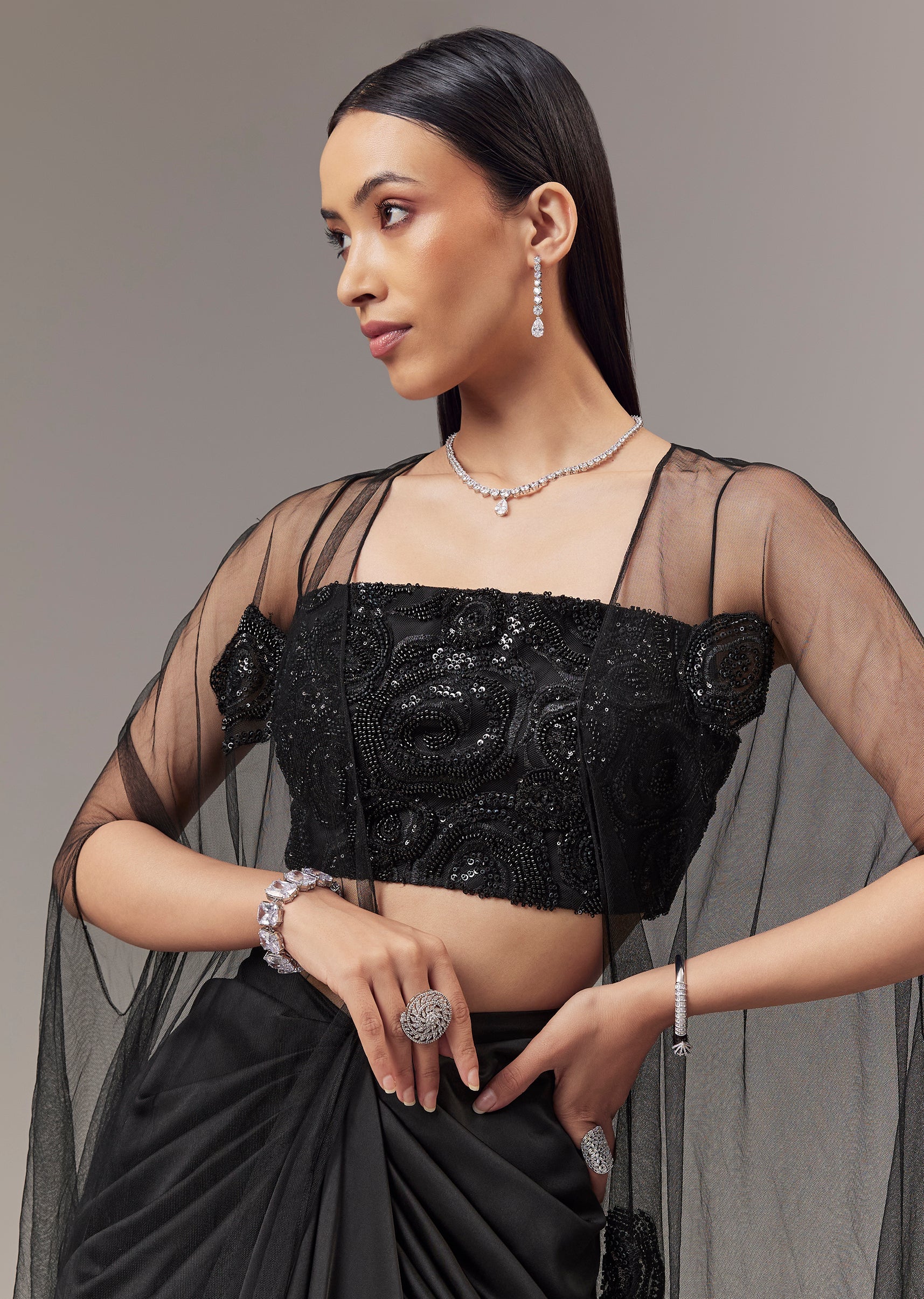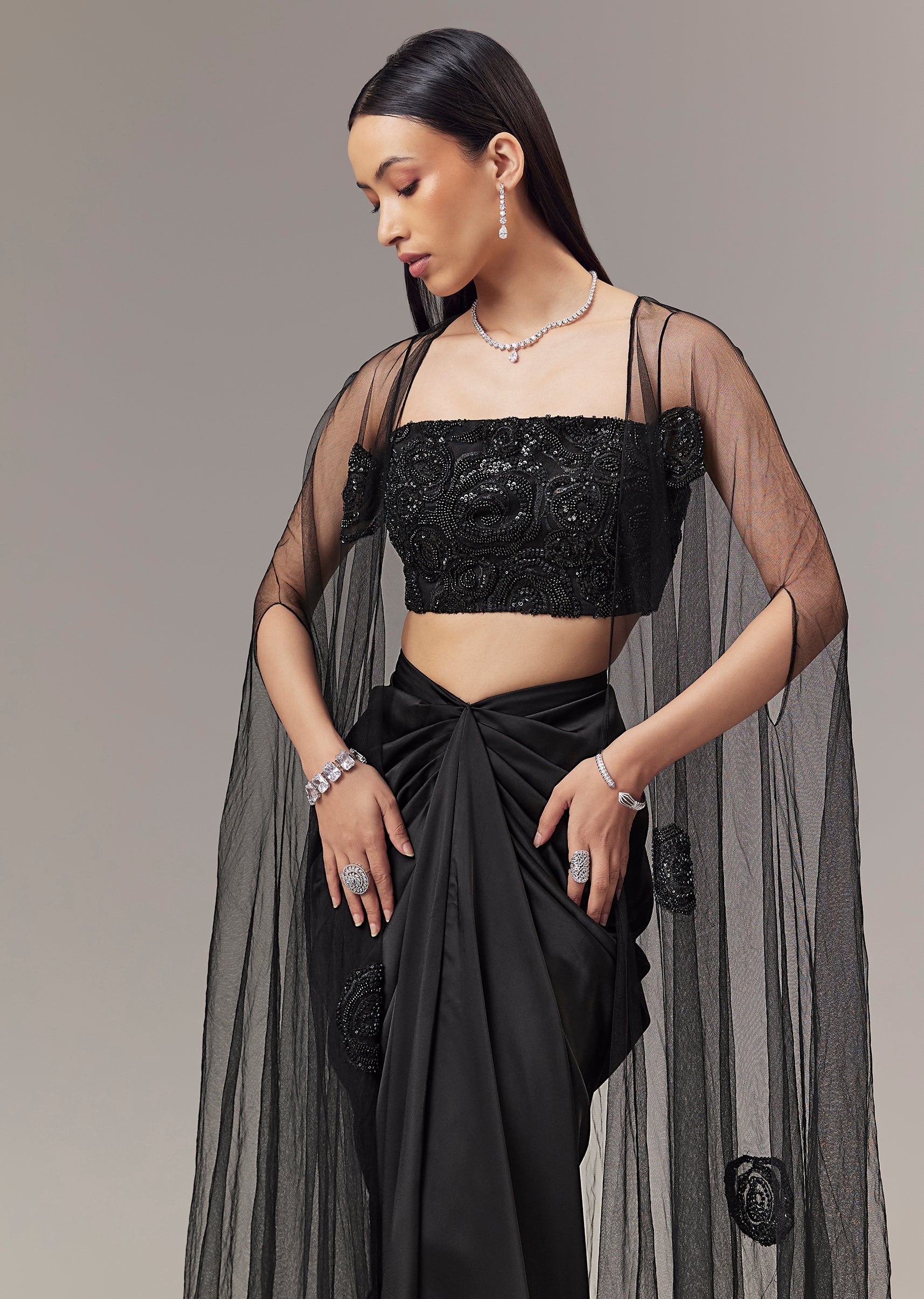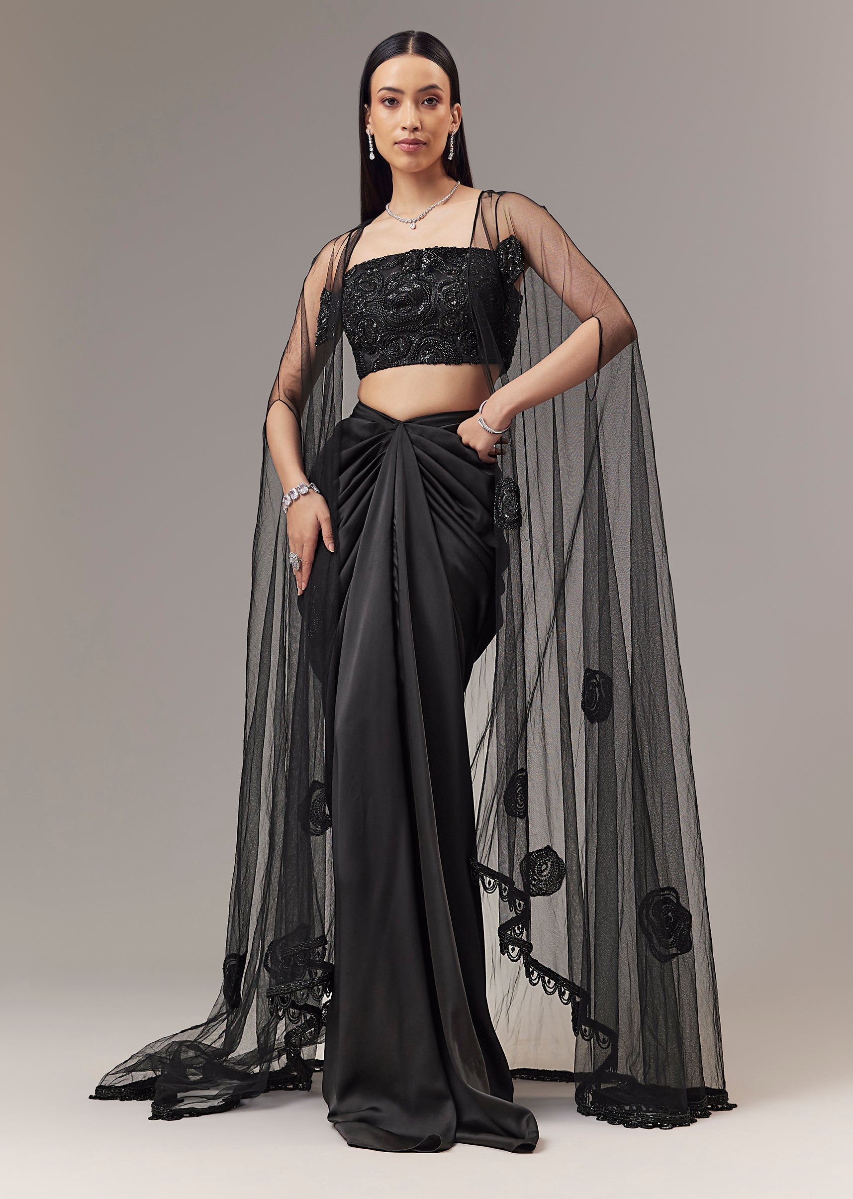 Black Satin Indo Western Crop Top And Draped Skirt Set With Cape