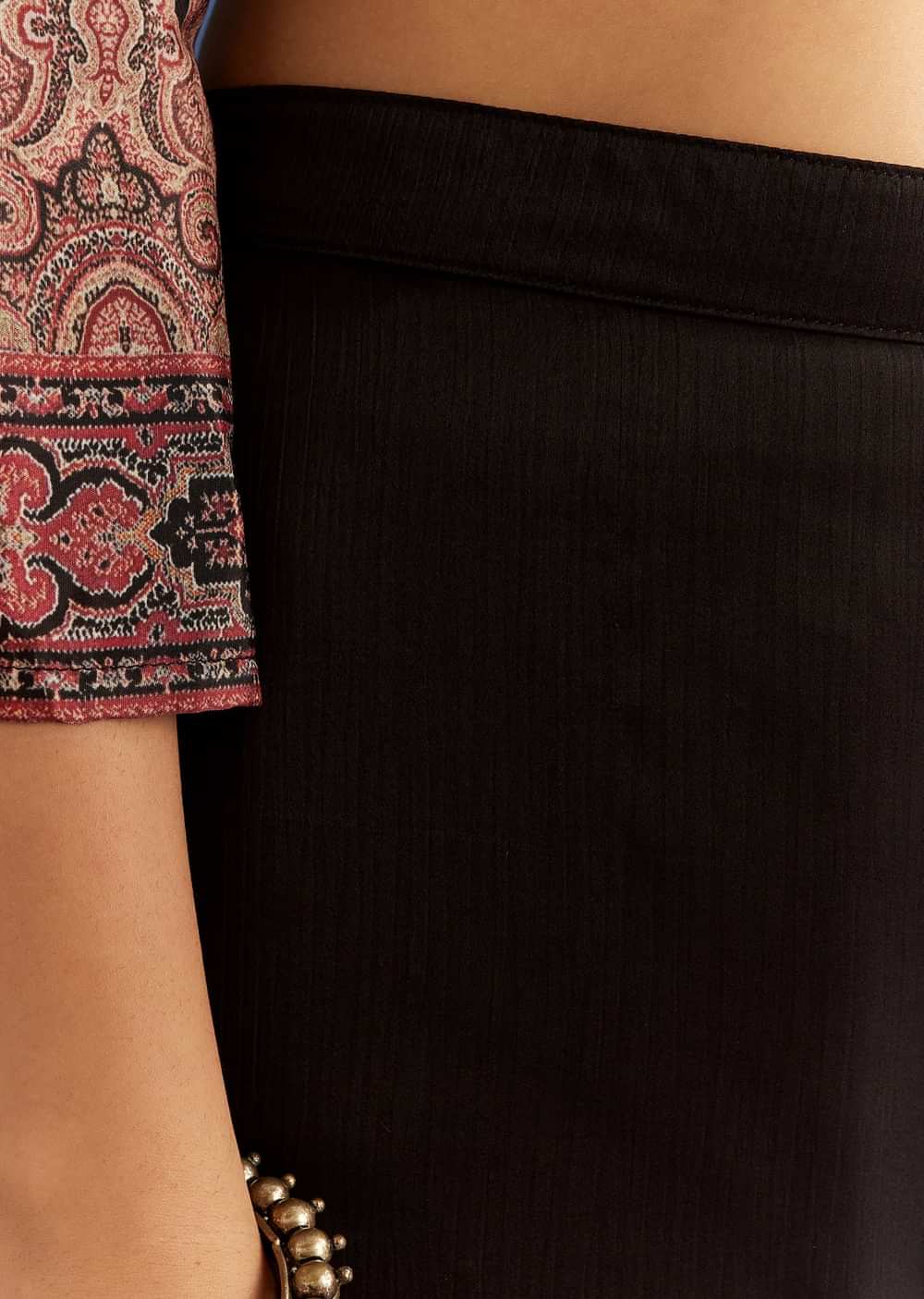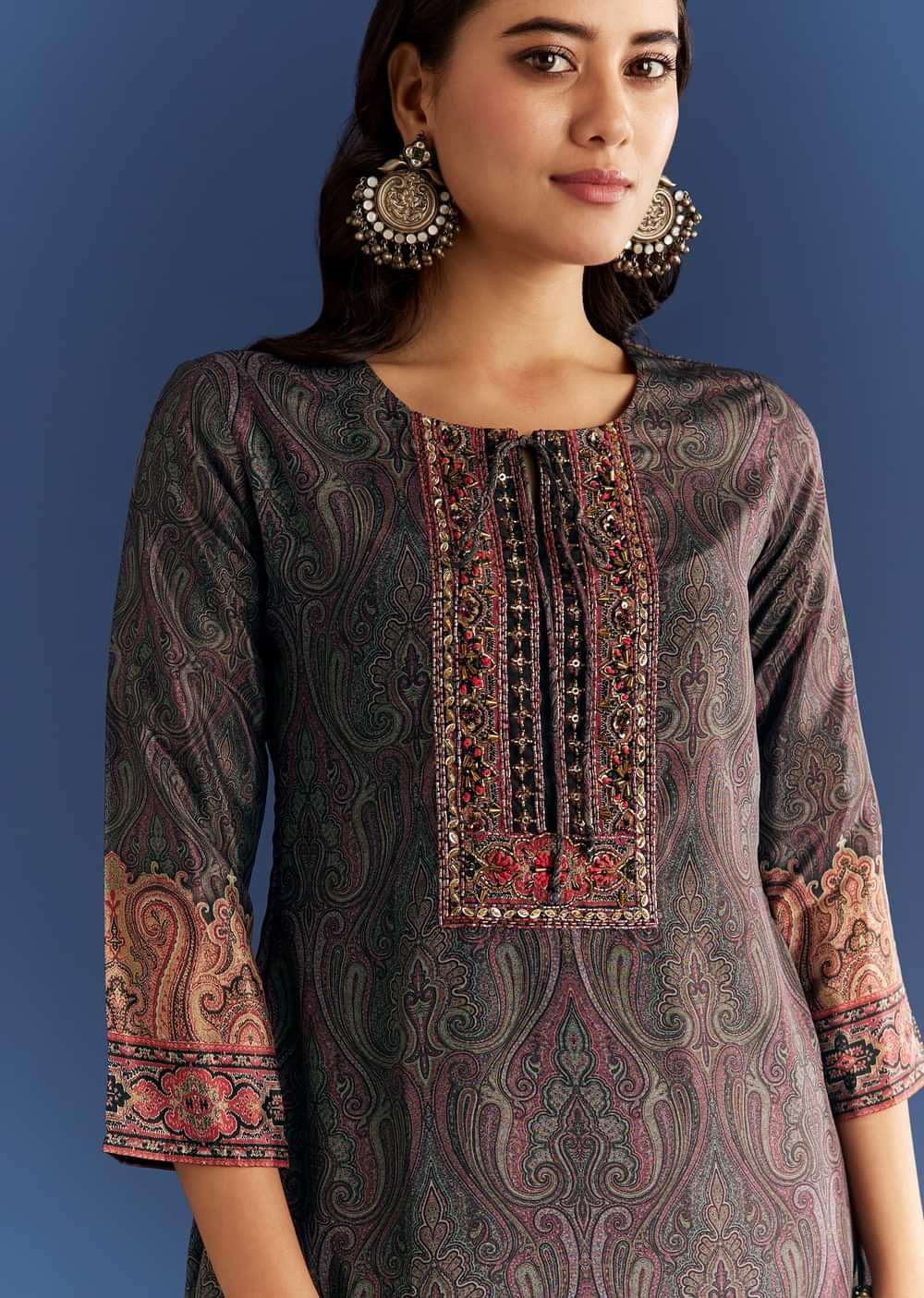 A bold black paisley print kurta in satin fabric, featuring dazzling cut dana and sequins work at the neckline—perfect for sleek, festive styling.