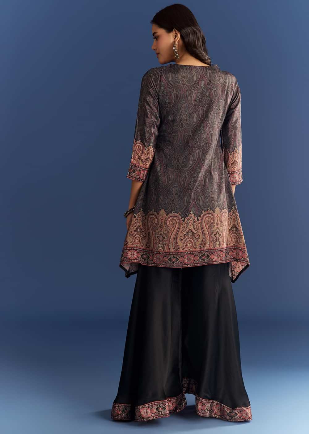 Black Satin Paisley Print Kurta Sharara With Cut Dana Embroidery