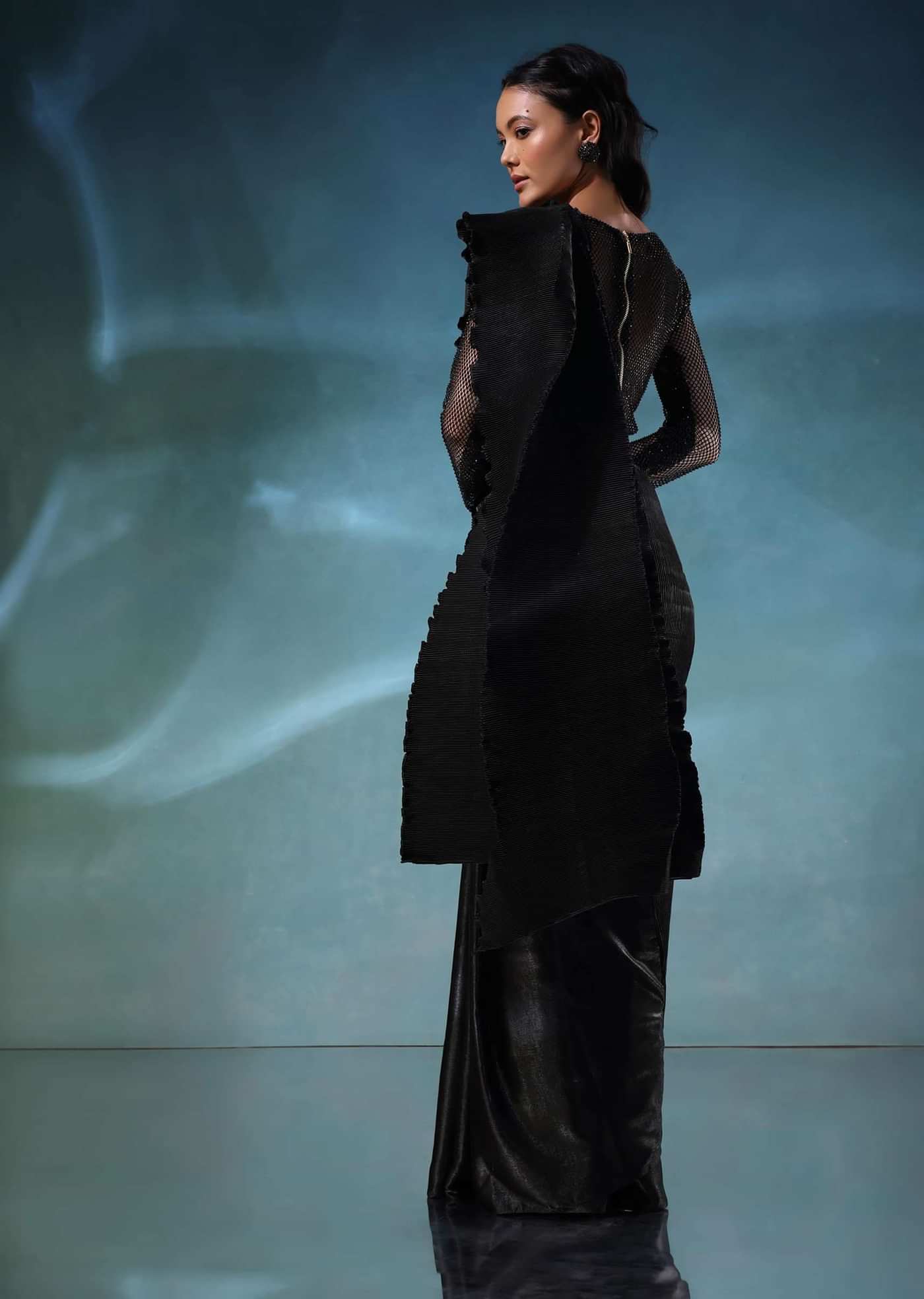 Black Satin Polyester Crush Saree With Mesh Blouse
