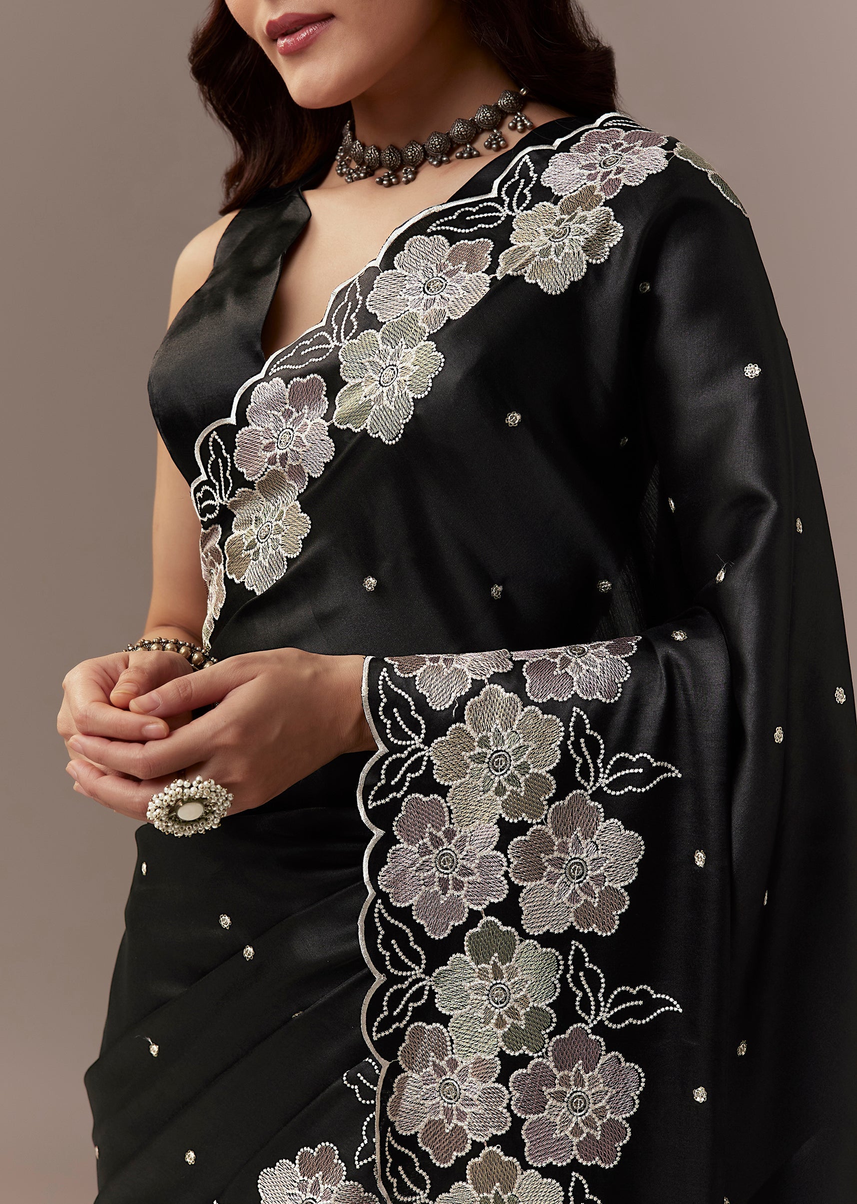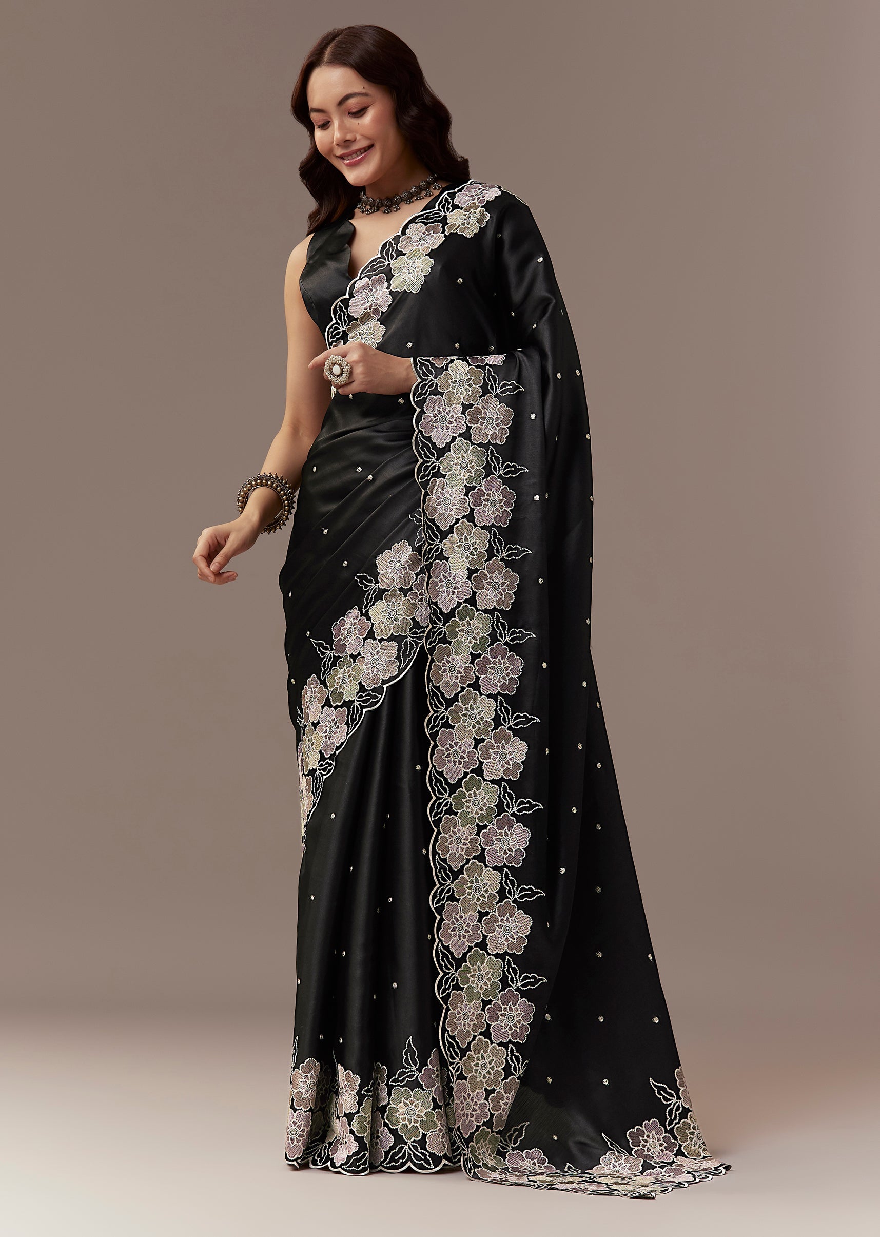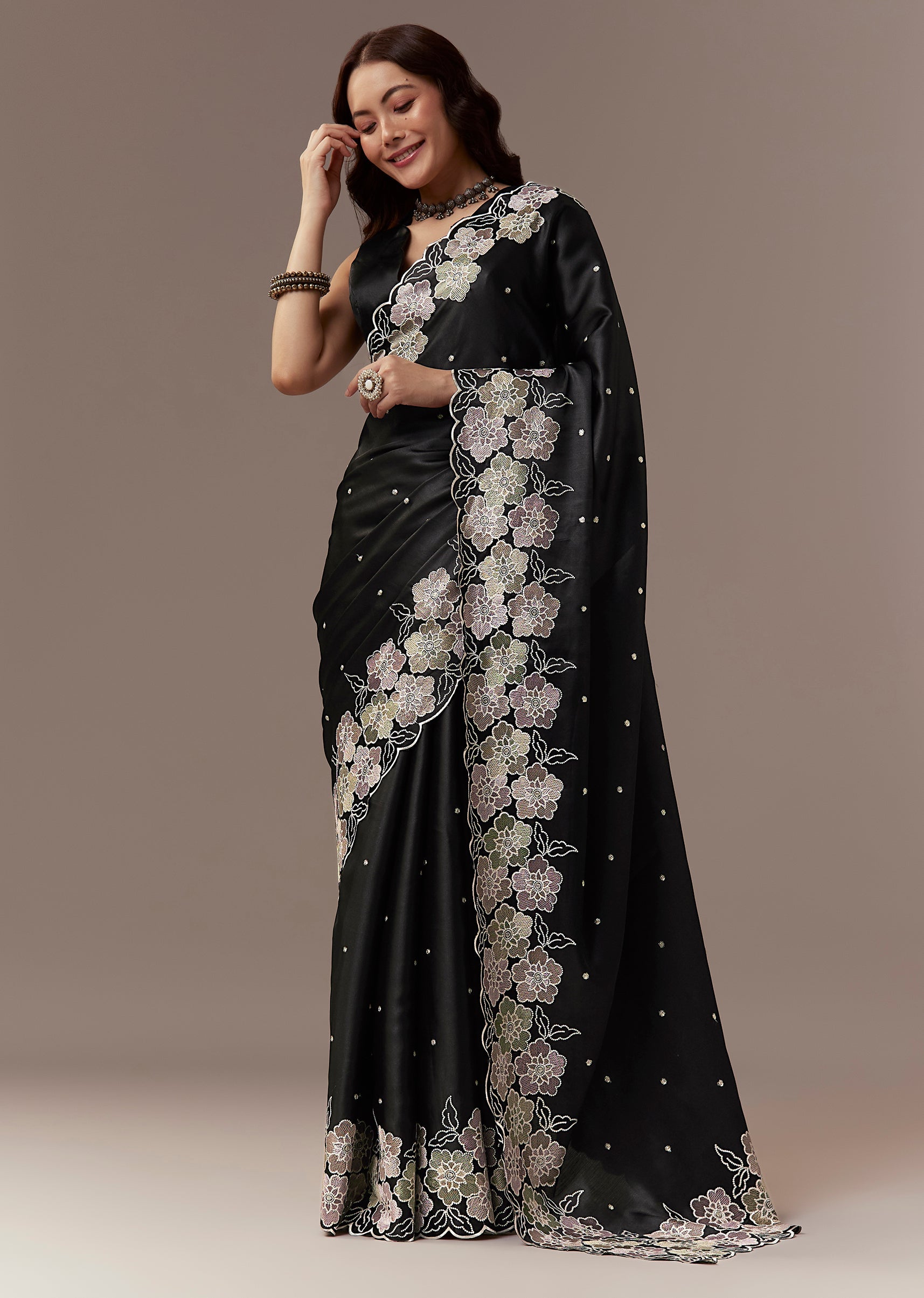 Elegant and striking this black satin saree is perfect for casual wedding celebrations or evening functions. The saree features a broad floral embroidered border and small butti all over detailed with resham thread creating a refined and stylish look. It comes with unstitched blouse fabric allowing a customized and comfortable fit. Ideal for both daytime and evening events it exudes sophistication charm and celebration ready style. Awarded as the Most Trusted Brand, we're delivering styles you love, just as promised.