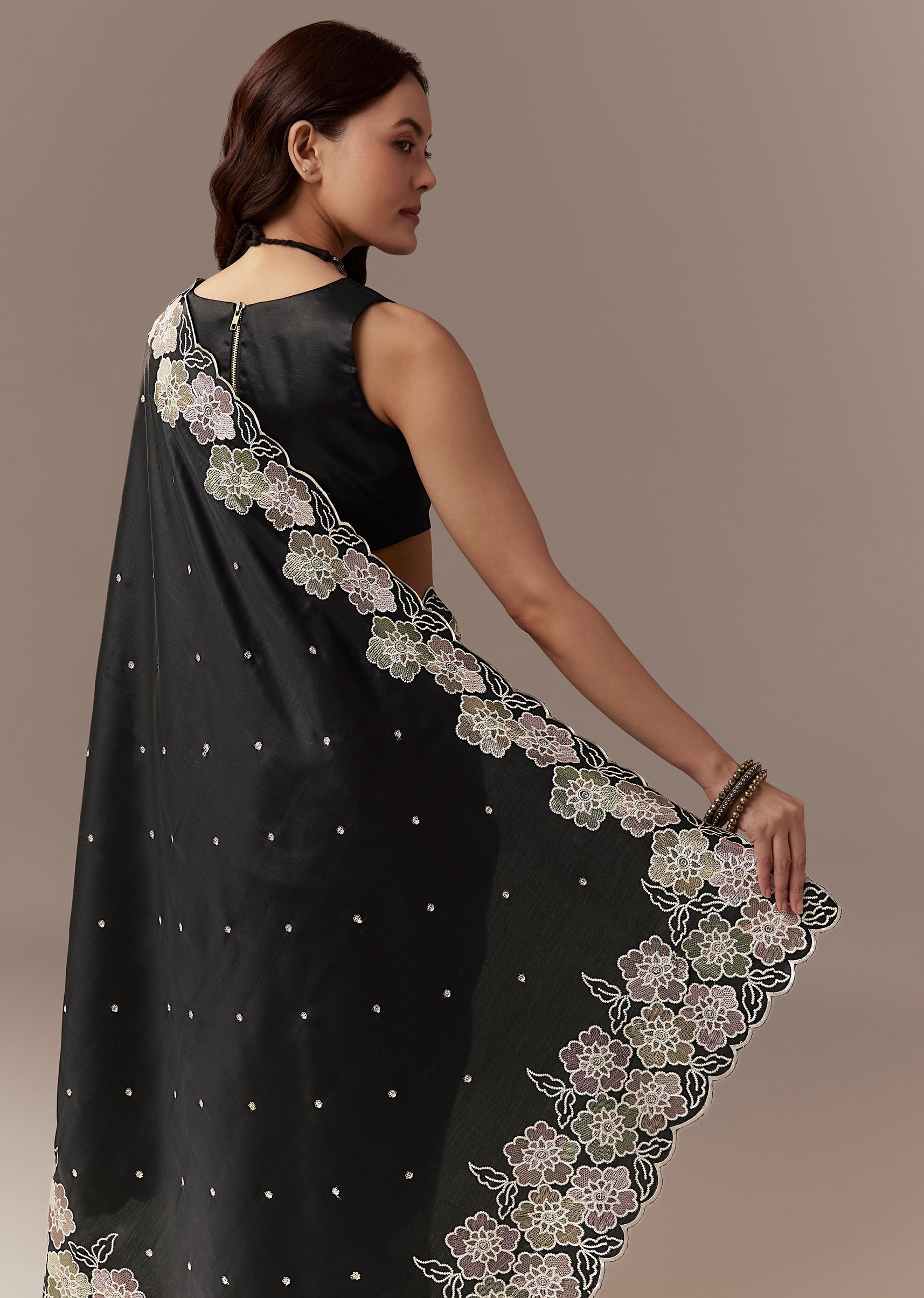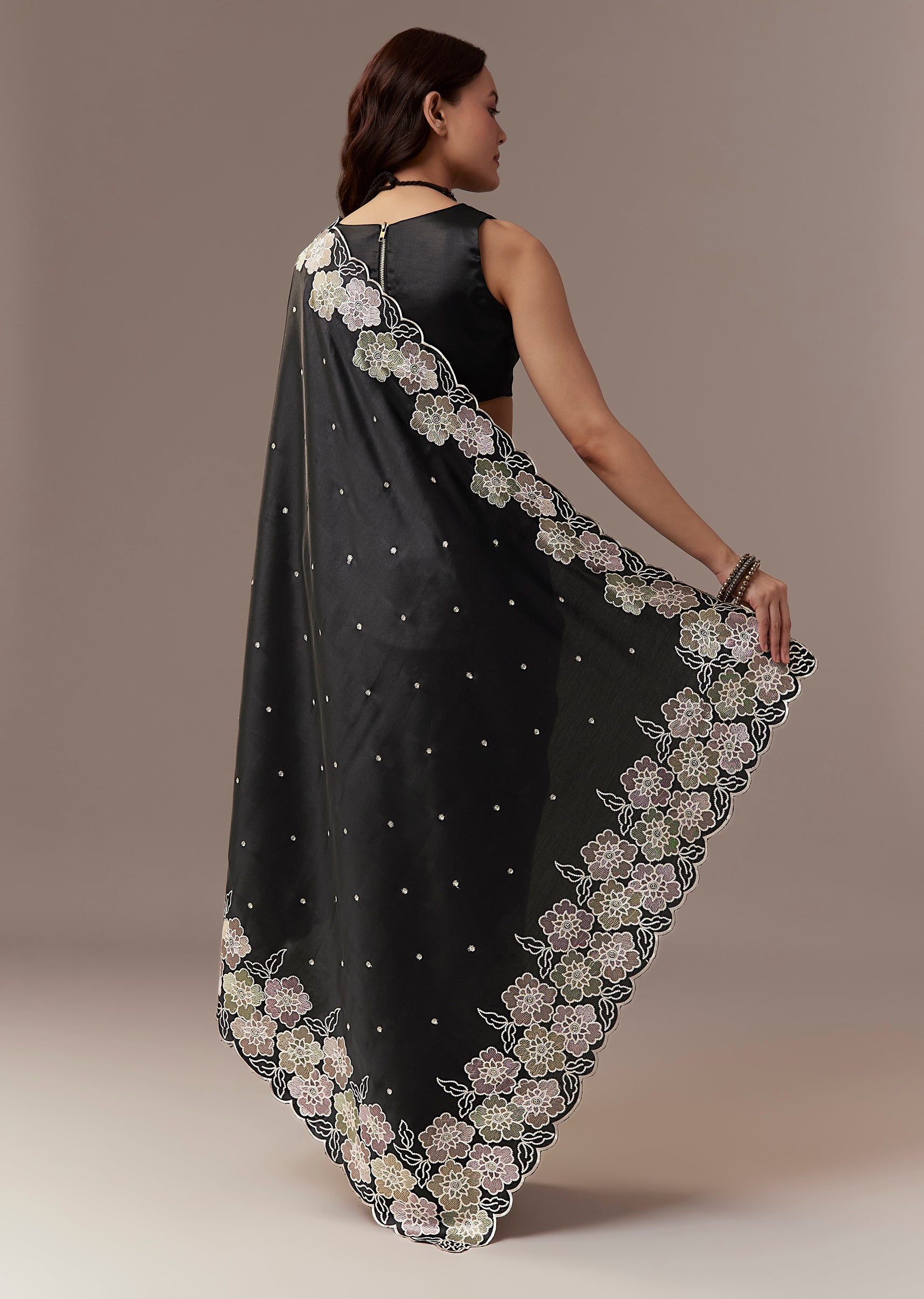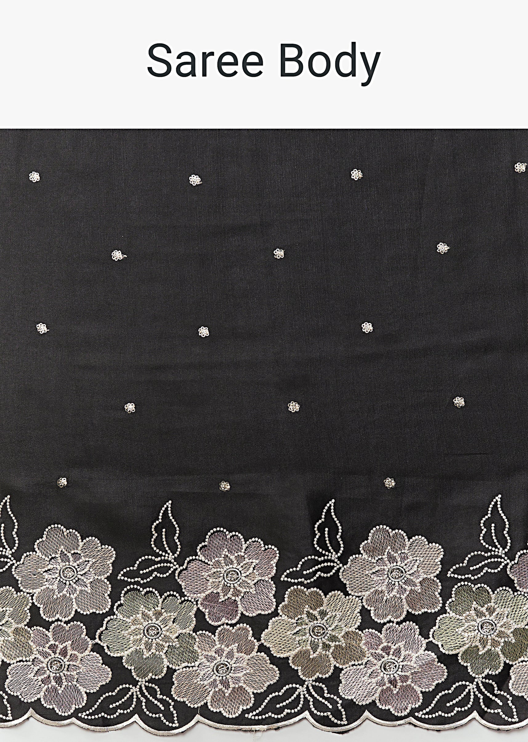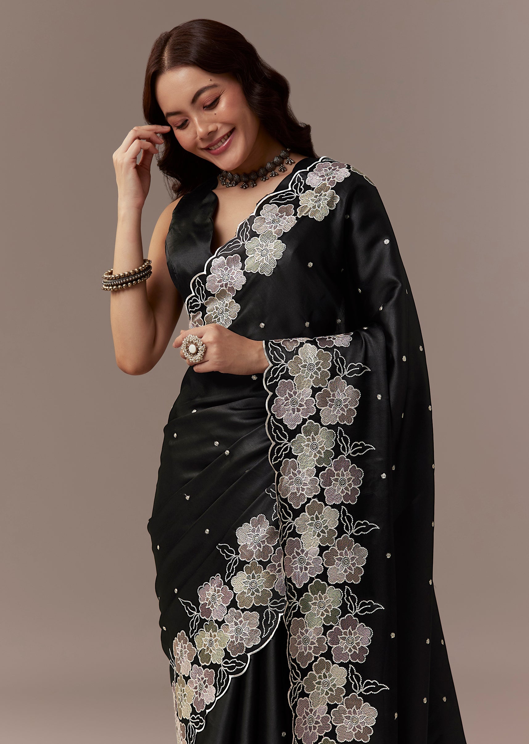 Elegant and striking this black satin saree is perfect for casual wedding celebrations or evening functions. The saree features a broad floral embroidered border and small butti all over detailed with resham thread creating a refined and stylish look. It comes with unstitched blouse fabric allowing a customized and comfortable fit. Ideal for both daytime and evening events it exudes sophistication charm and celebration ready style. Awarded as the Most Trusted Brand, we're delivering styles you love, just as promised.