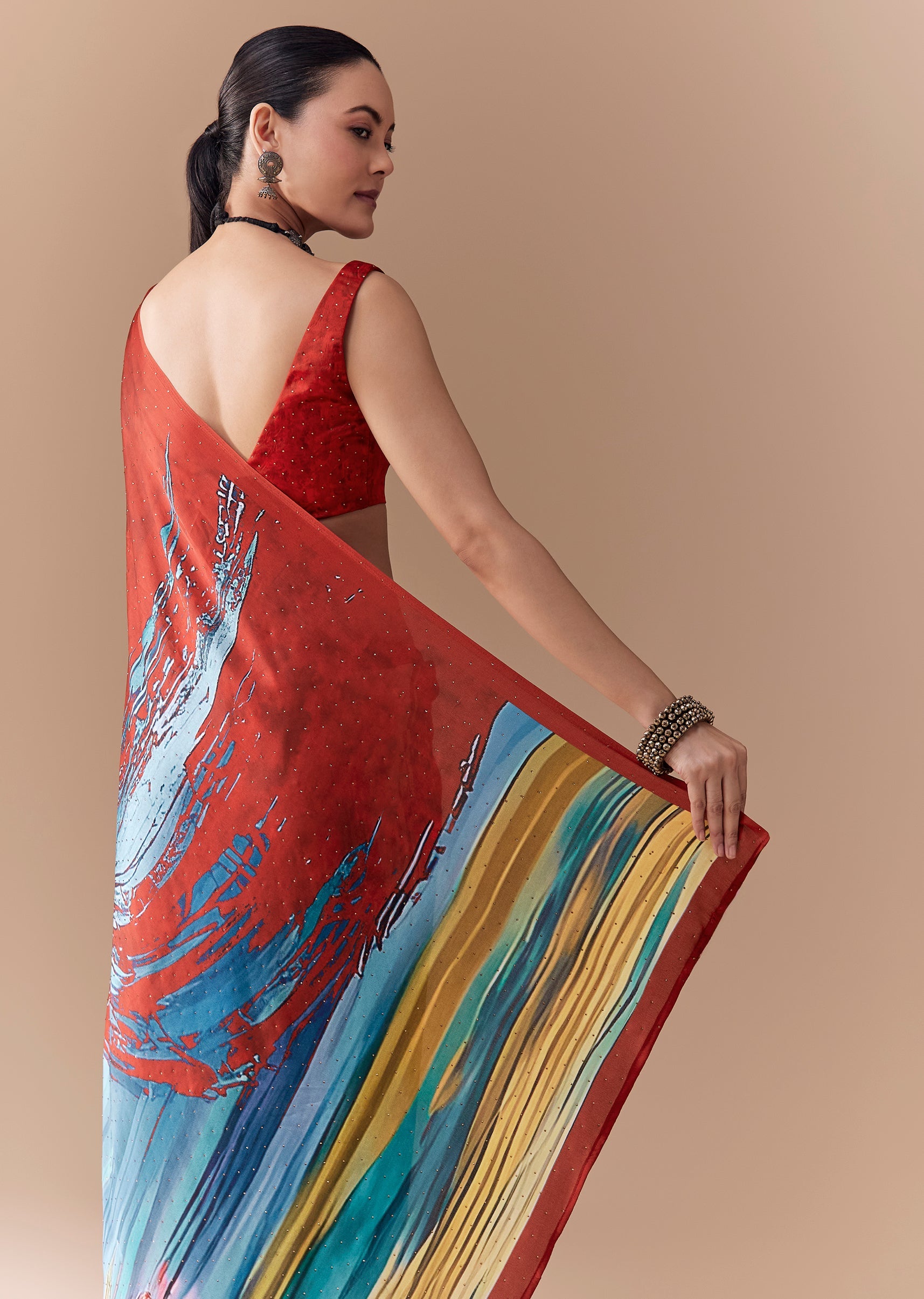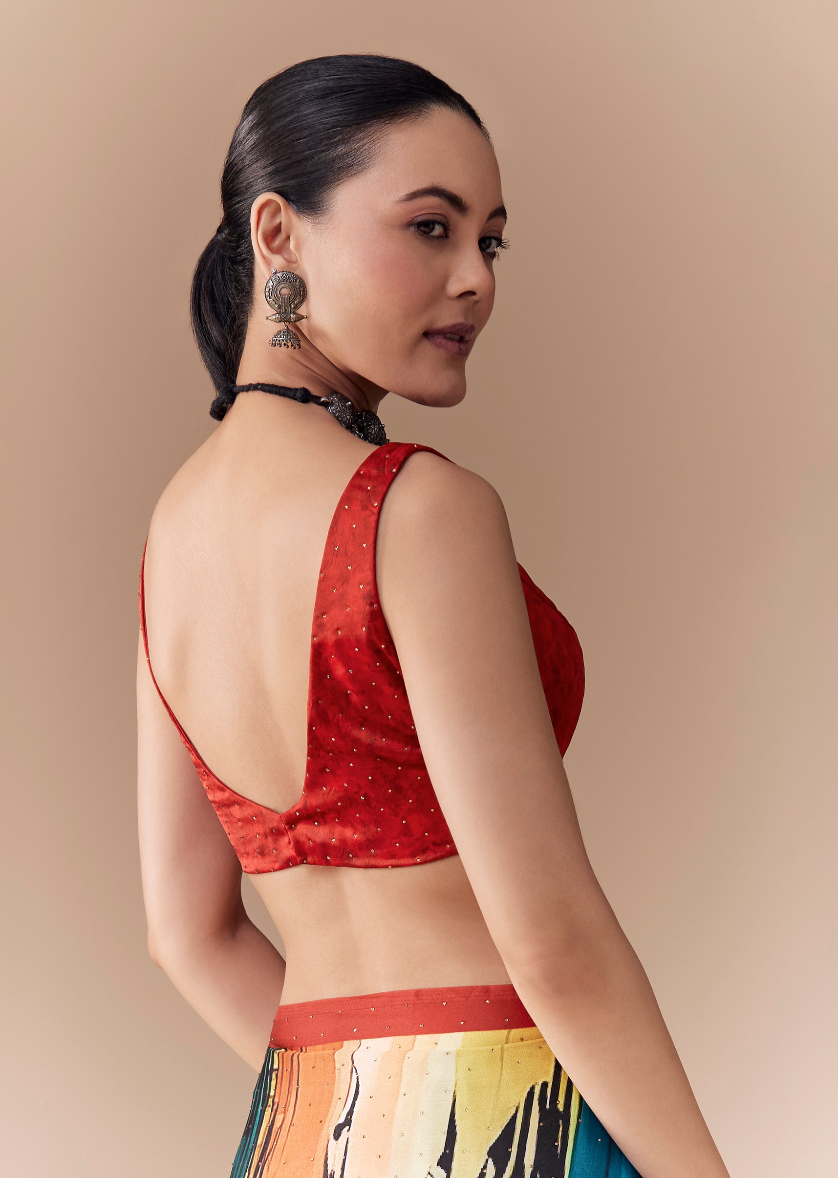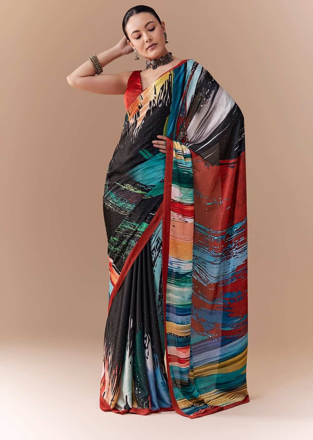 Make a bold statement with this black satin saree, featuring vibrant multicolor printed stripes all over and delicate stone embellishments that add a touch of shimmer. The smooth satin fabric drapes beautifully, offering a luxurious sheen, while the contrasting red blouse fabric provides a striking accent. Perfect for festive events, evening parties, or special celebrations, this saree effortlessly blends modern flair with classic elegance. Awarded as the Most Trusted Brand, we're delivering styles you love, just as promised.