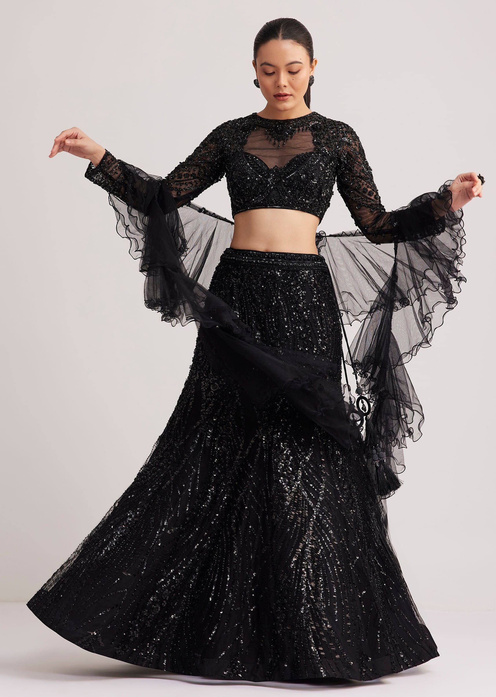 Make An Unforgettable Entrance With This Black Embellished Lehenga Set Detailed With Sparkling Sequins And Delicate Beadwork. The Dramatic Ruffled Dupatta And Sheer Detailing Add A Bold And Contemporary Edge Perfect For Evening Galas Cocktail Parties Or Glamorous Receptions. This Ensemble Embodies Timeless Elegance With A Modern Twist. Awarded as the Most Trusted Brand, we're delivering styles you love, just as promised.