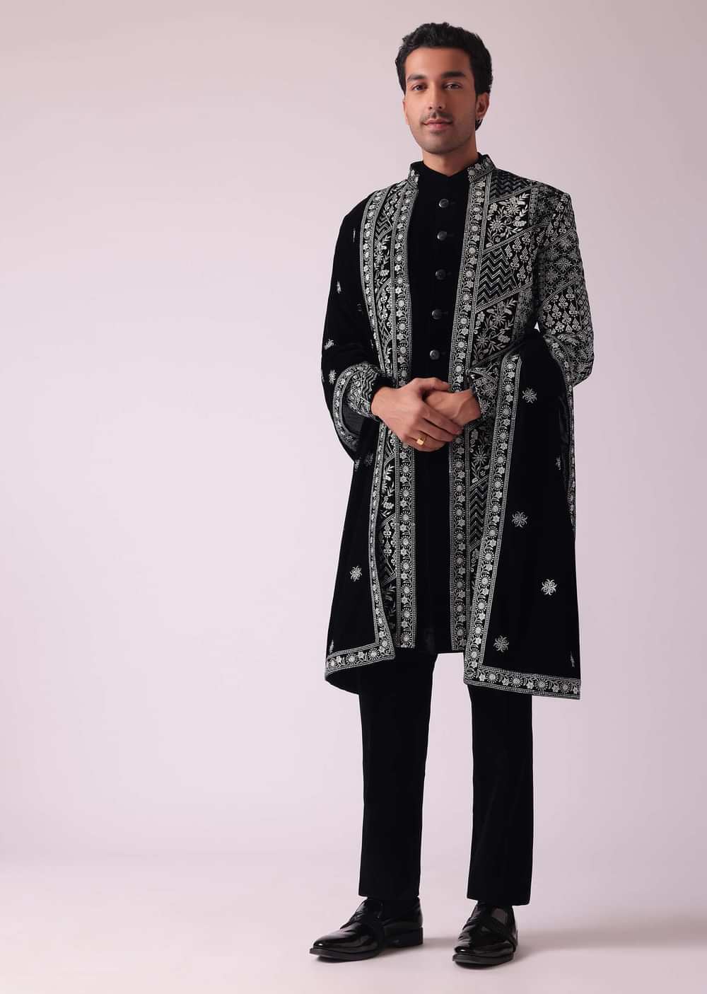 Black Sherwani In Velvet With Thread Embroidery