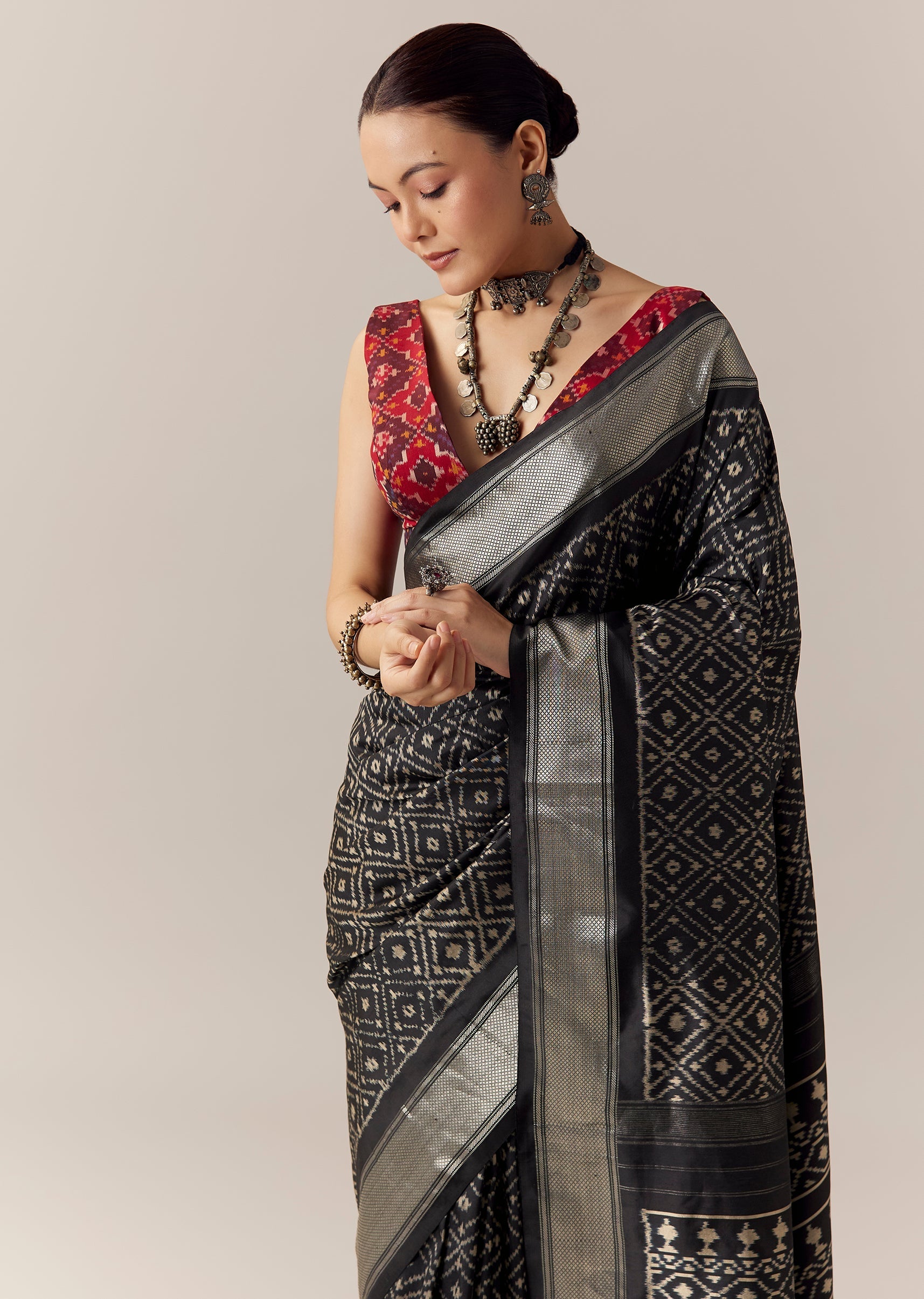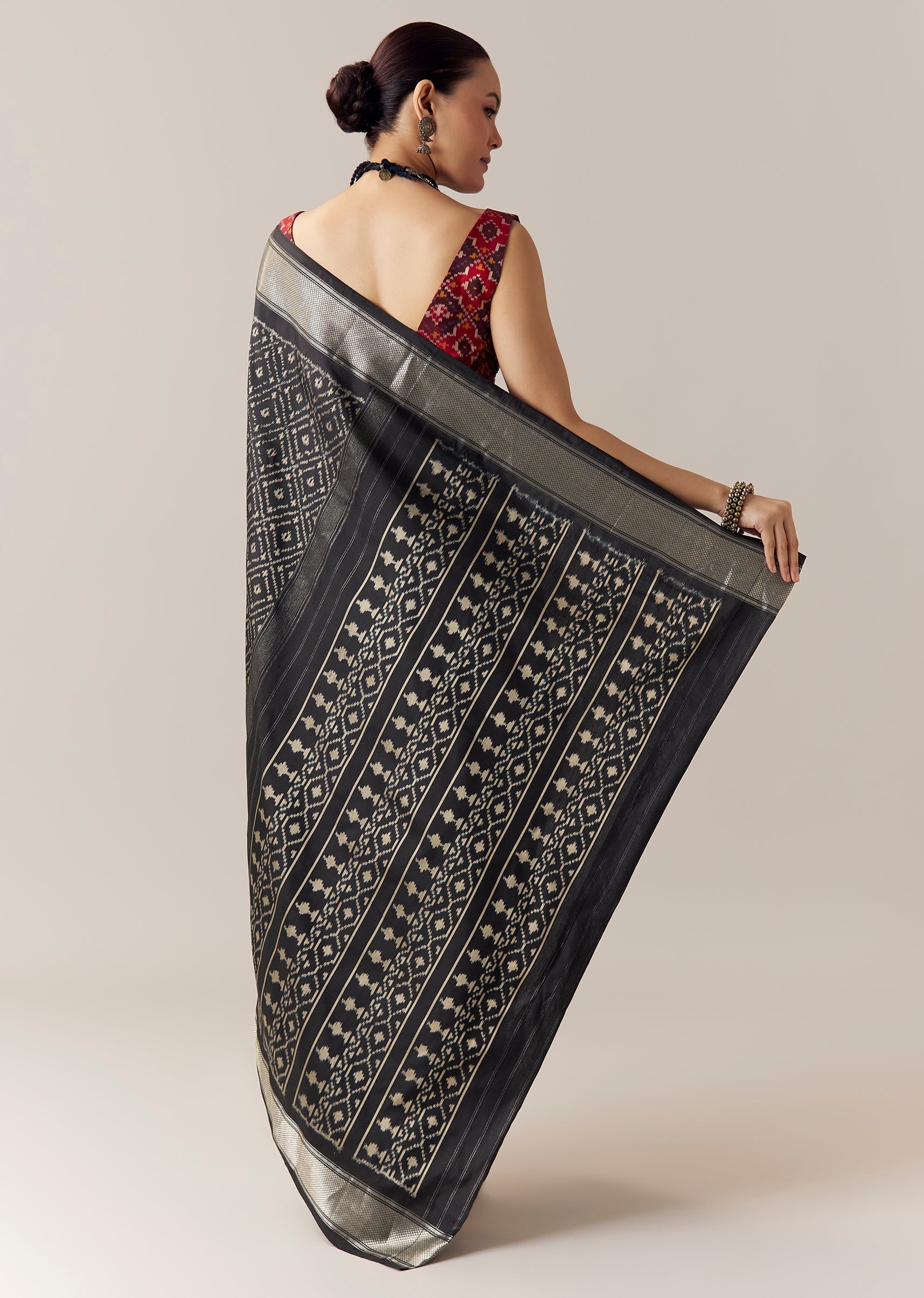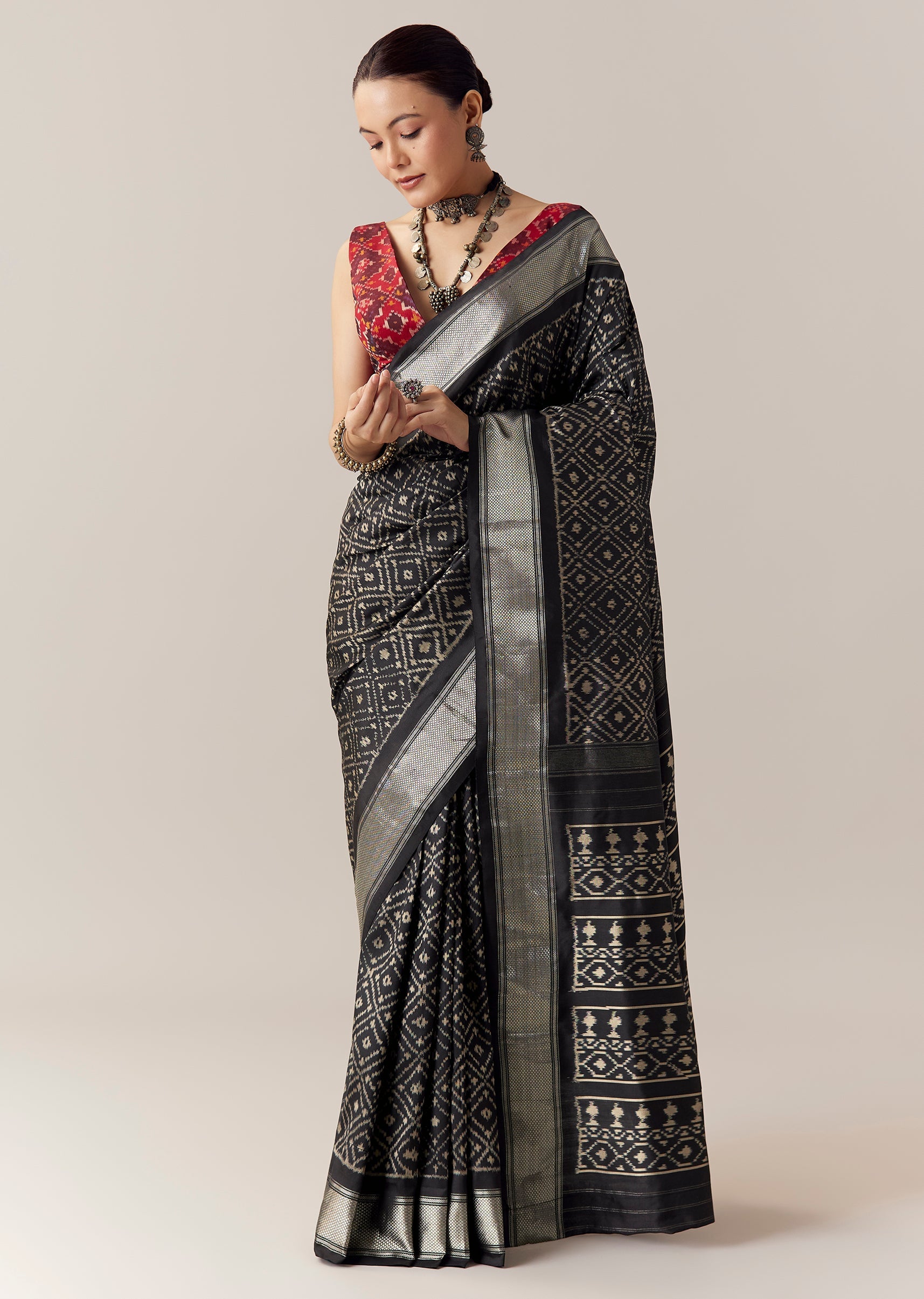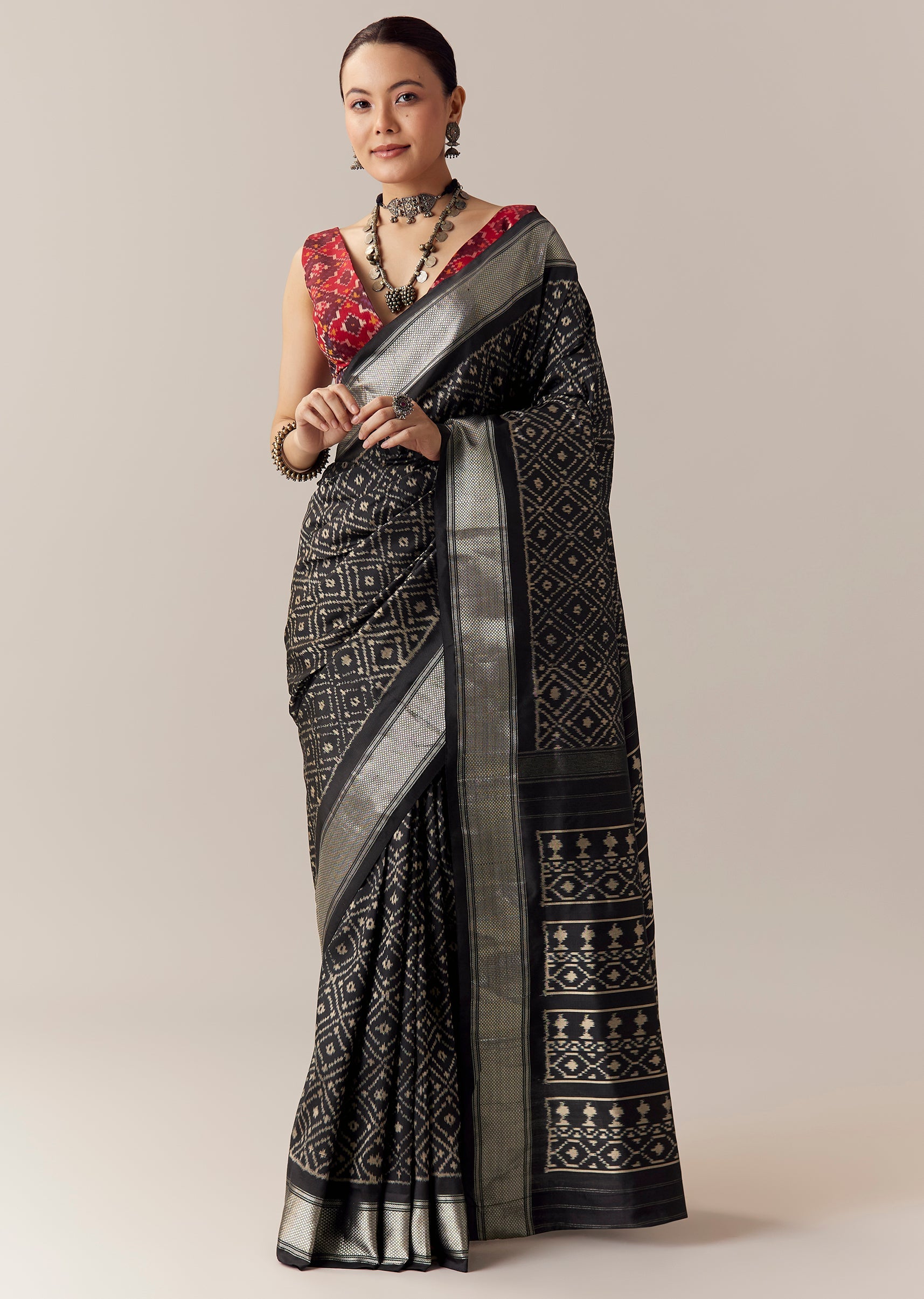 Bold elegance defines this black Patola silk saree featuring authentic single ikat weaving with geometric patterns highlighted in silver zari for a striking contemporary touch. The rich golden kaddi border adds a regal frame to the drape, while the contrast ikkat blouse fabric completes the look with traditional depth and balance. Crafted in luxurious silk, the set includes one saree and one unstitched blouse fabric, making it an ideal choice for weddings, evening functions, and cultural occasions. Awarded as the Most Trusted Brand, we're delivering styles you love, just as promised.