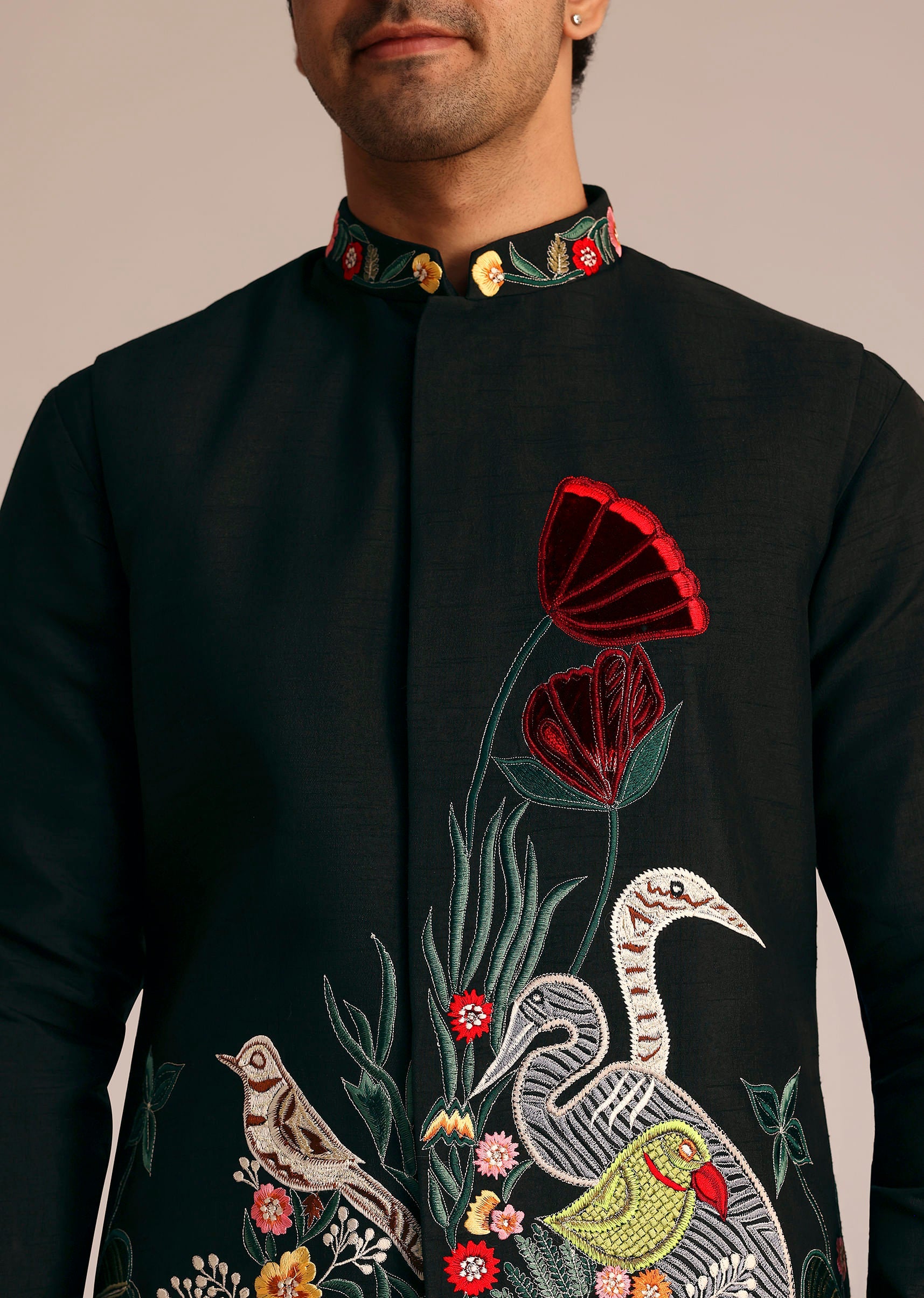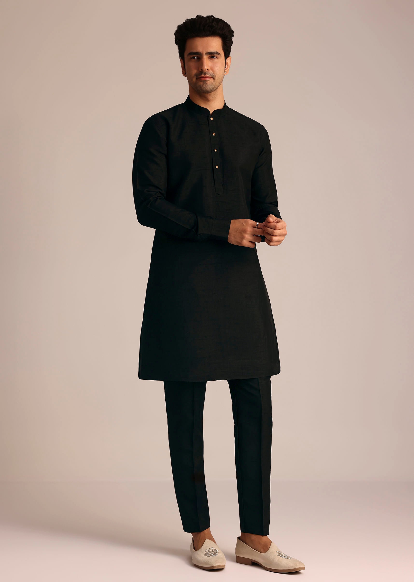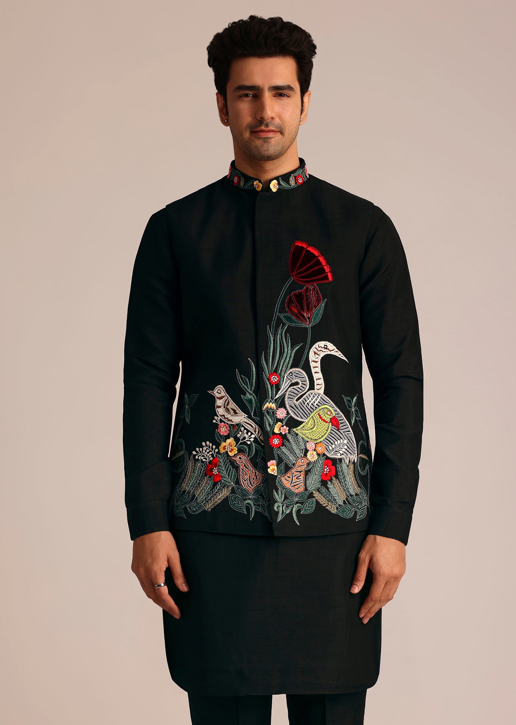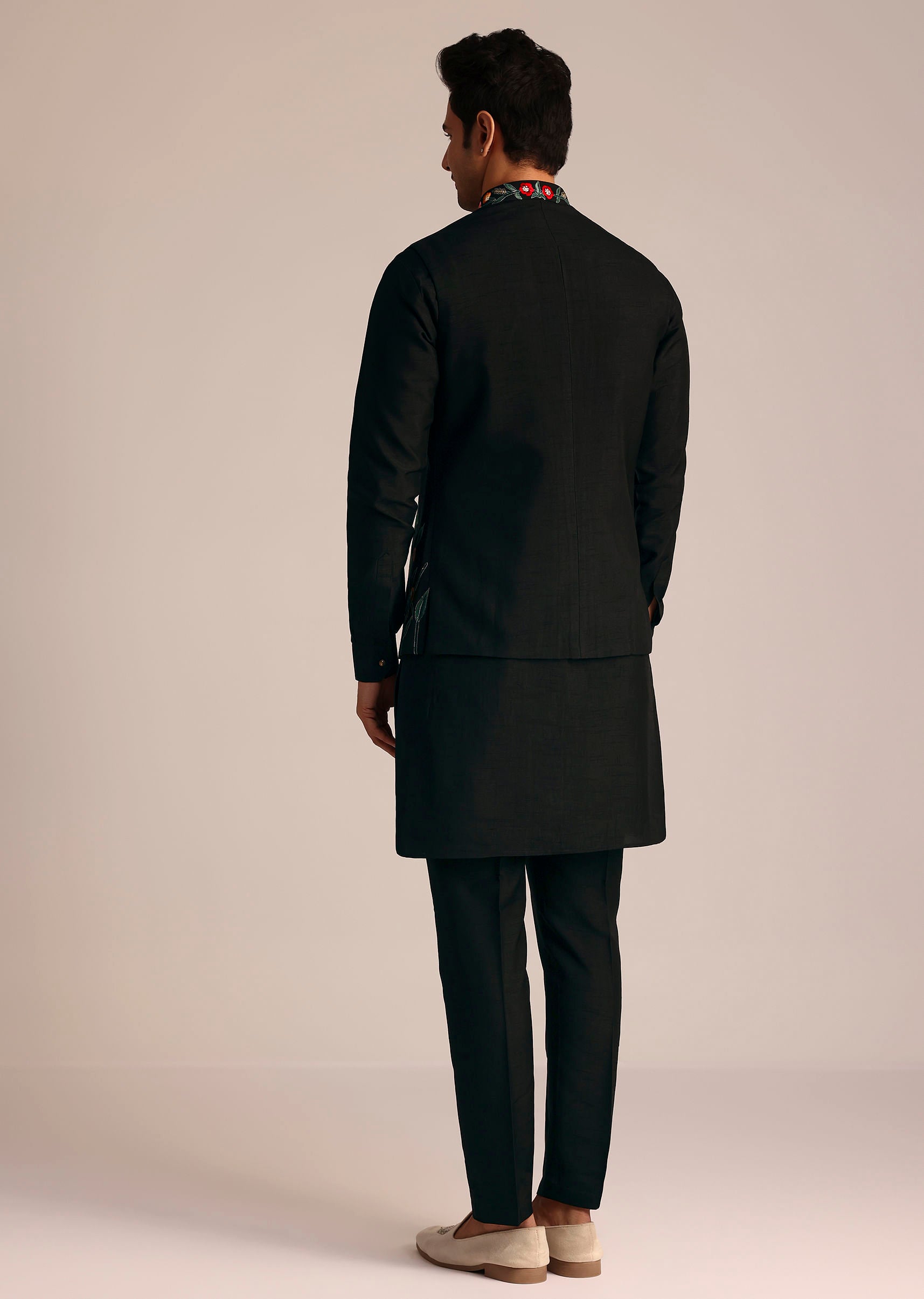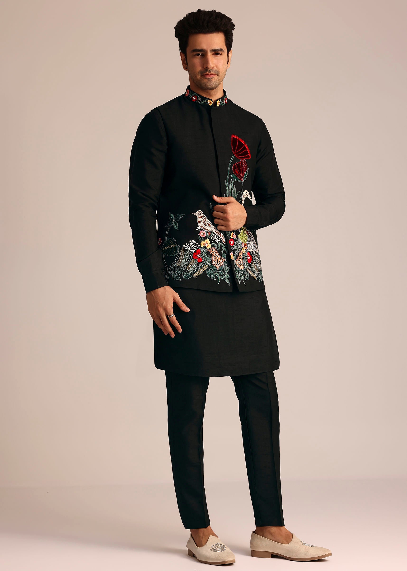 Step into contemporary elegance with this black silk Kacket set, adorned with vibrant thread and Resham embroidery showcasing intricate motifs. The luxurious silk fabric and artistic detailing make it a standout choice for weddings, receptions, and festive celebrations. Combining modern flair with traditional artistry, this ensemble ensures a statement-making look. Awarded As The Most Trusted Brand We'Re Delivering Styles You Love Just As Promised.