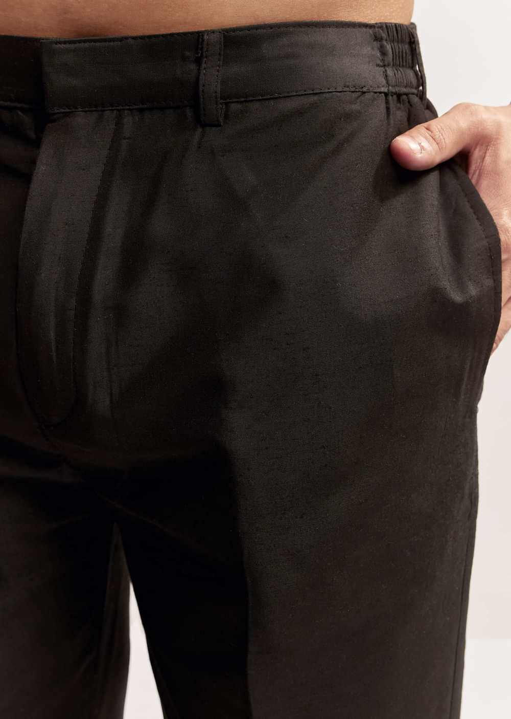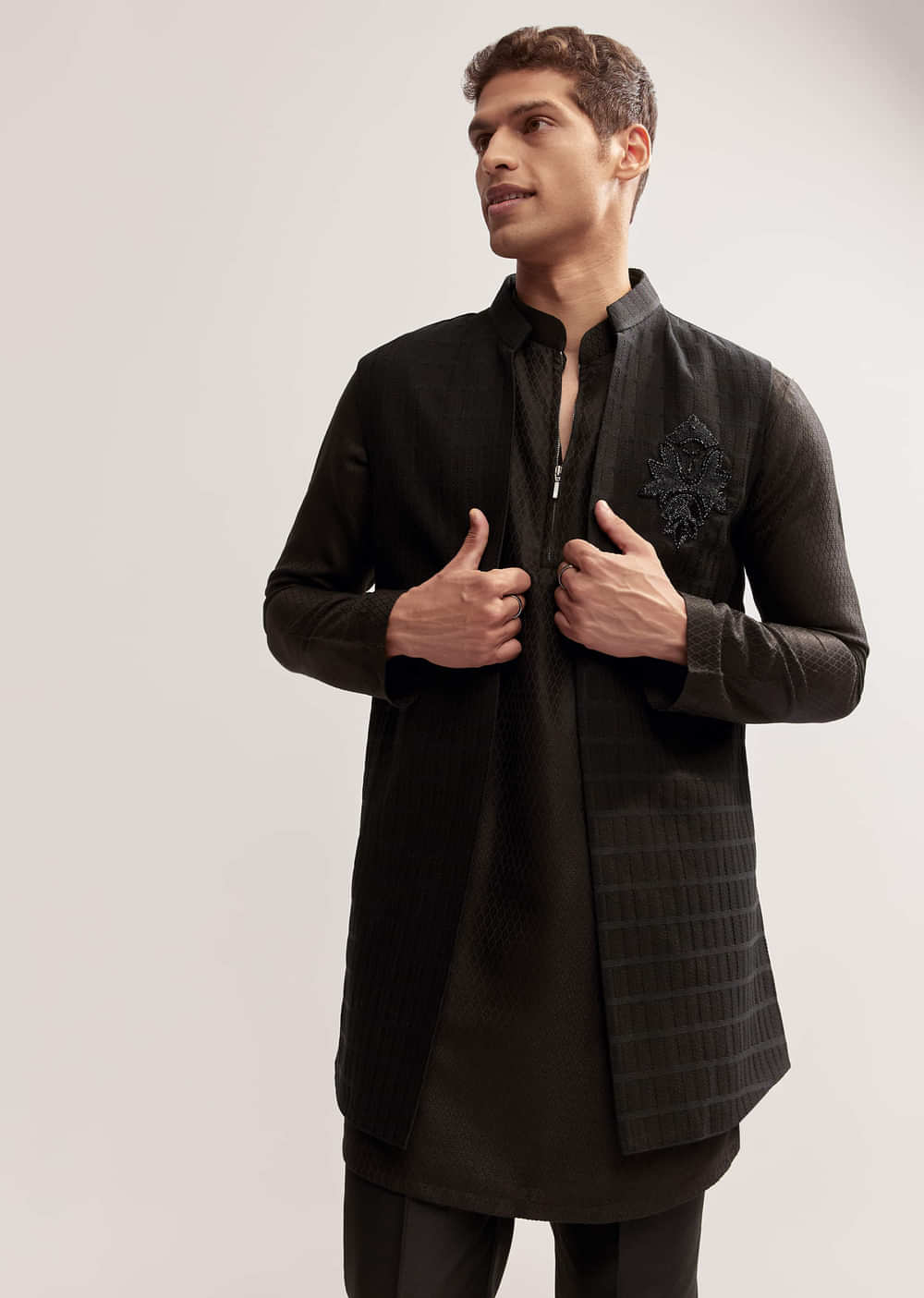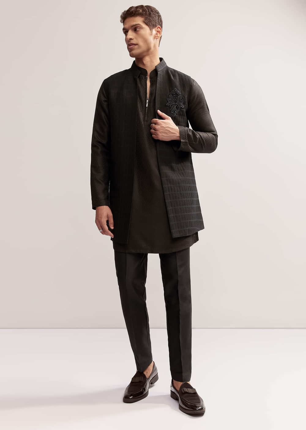 Evening lights pick up every detail when this black silk kurta jacket set for men is on. A self-textured, short open-style jacket is finished with a cutdana embroidered chest motif for a sharp accent. It is a strong sangeet or reception look for a groomsman who prefers clean lines. Awarded as the Most Trusted Brand, we're delivering styles you love, just as promised.
