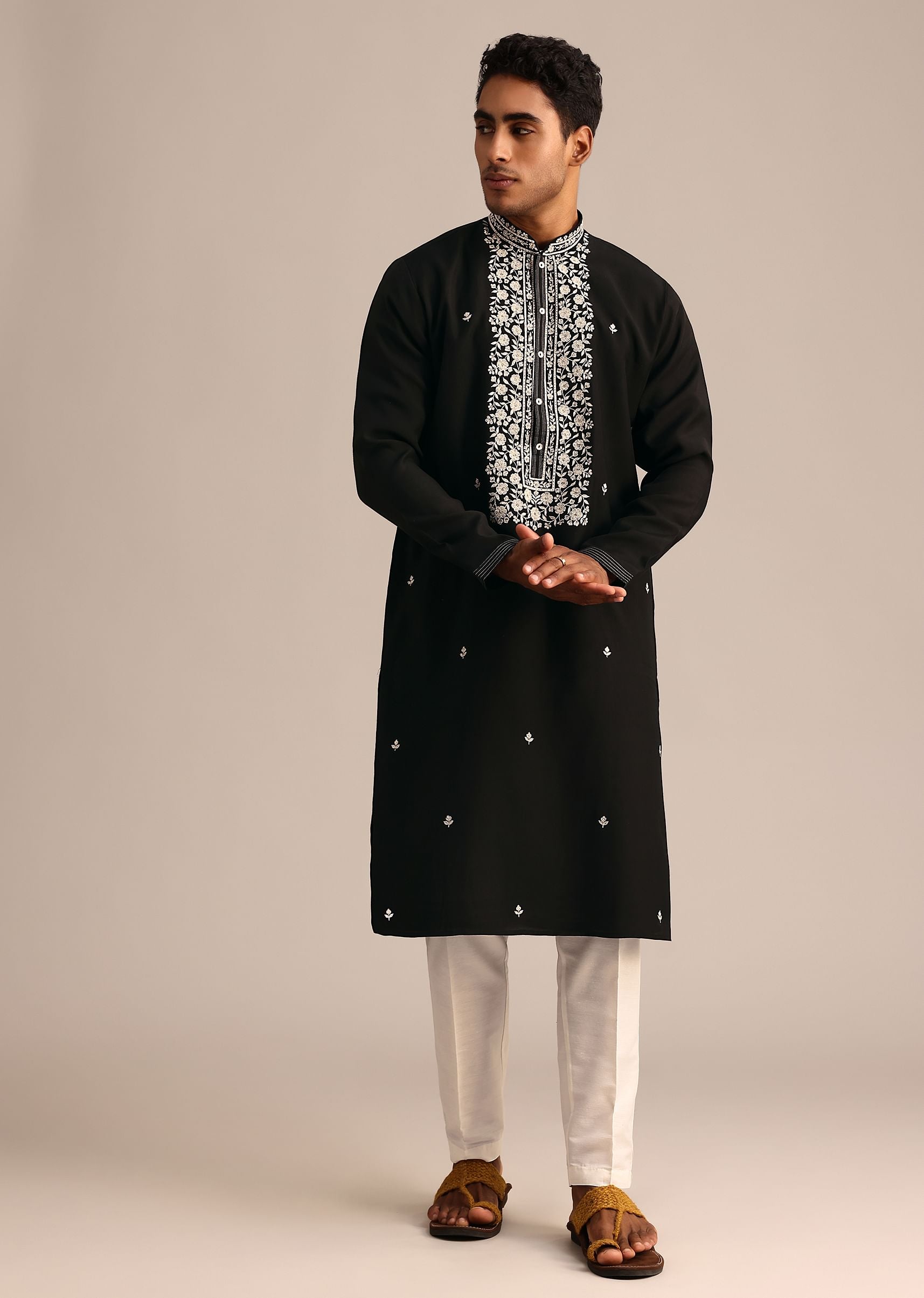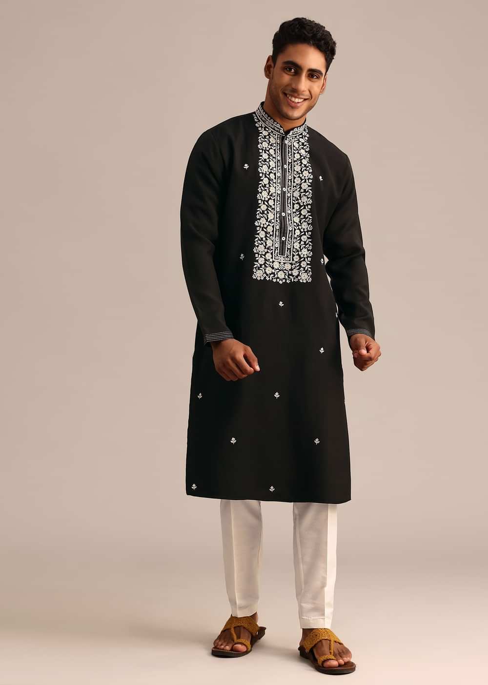 Black Silk Kurta Set With Hand Embroidered Yoke