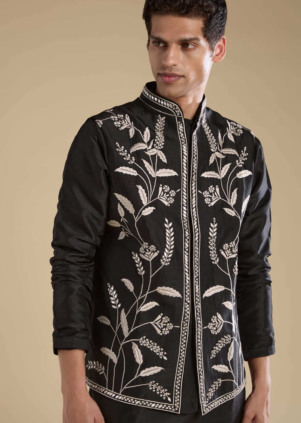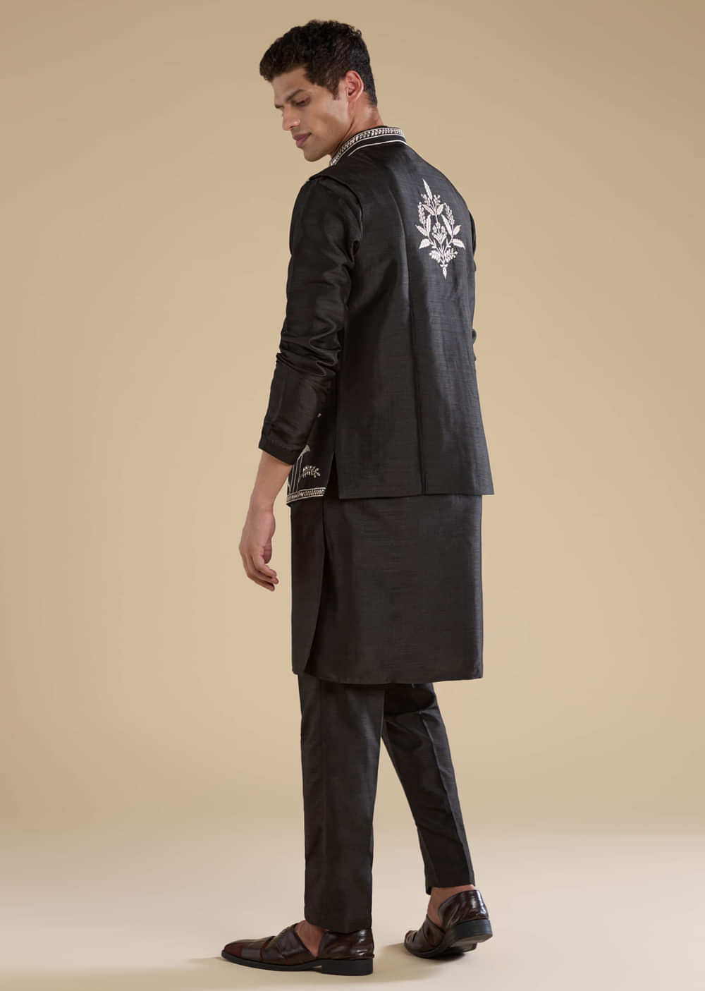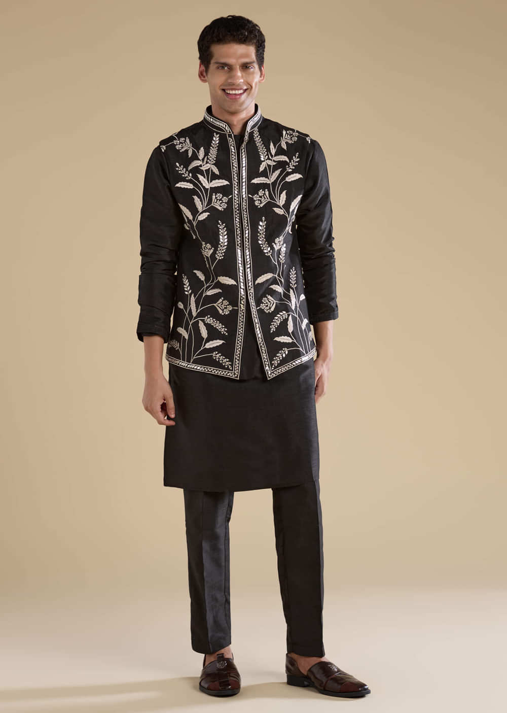 Black Silk Mirror Work Mens Jacket Kurta and Pant Set