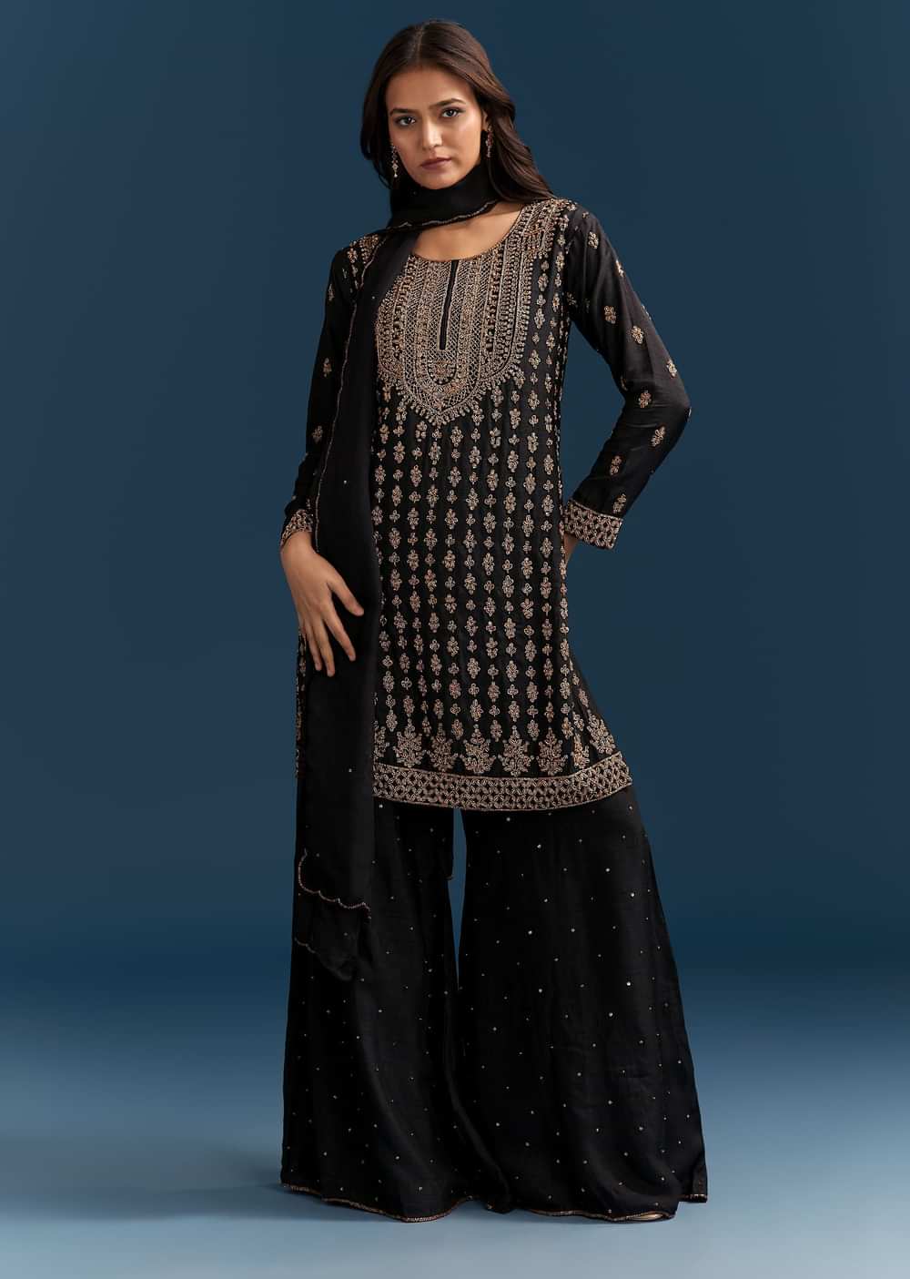 Black Silk Palazzo Suit With Embroidered Cut Dana Work And Dupatta