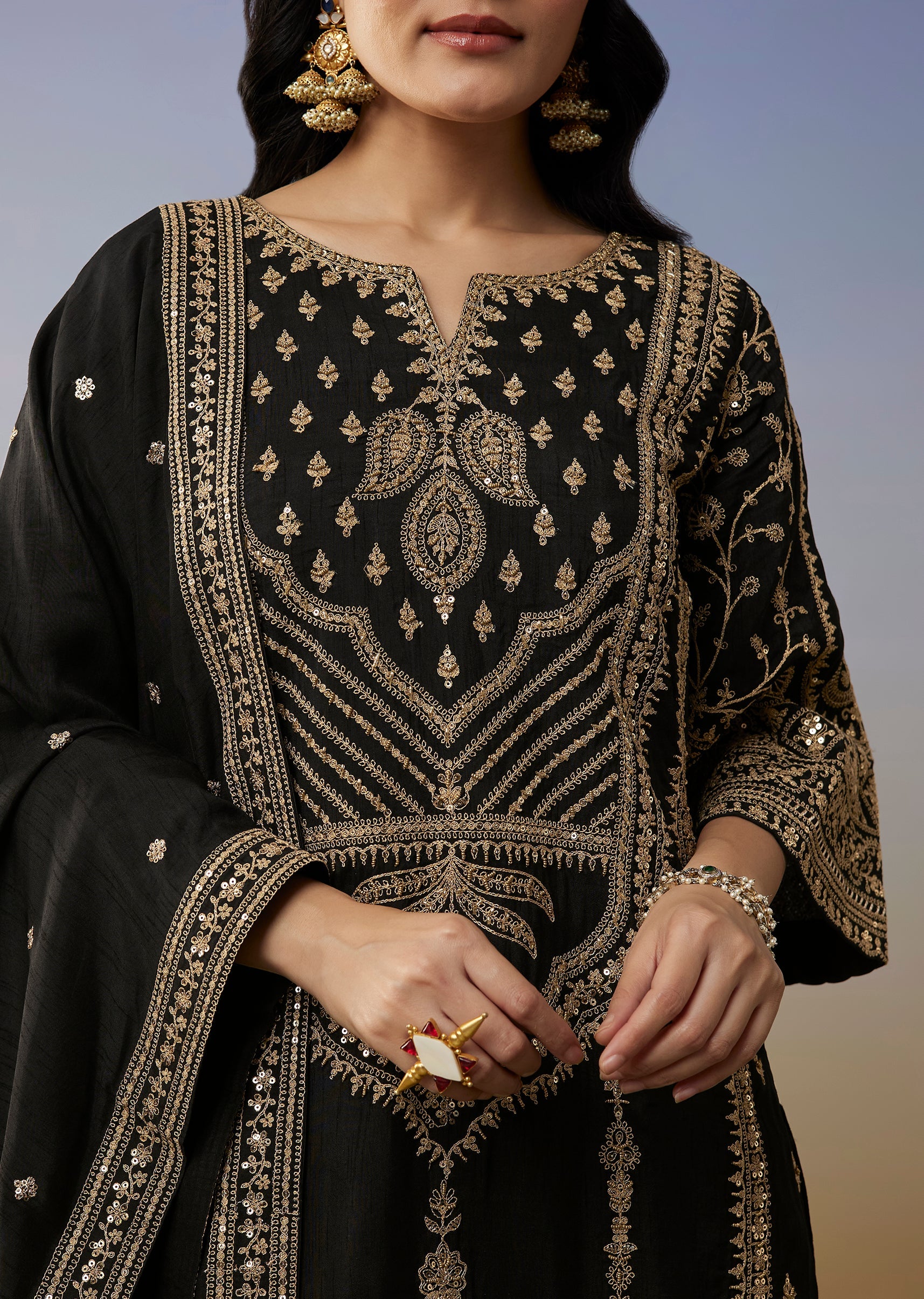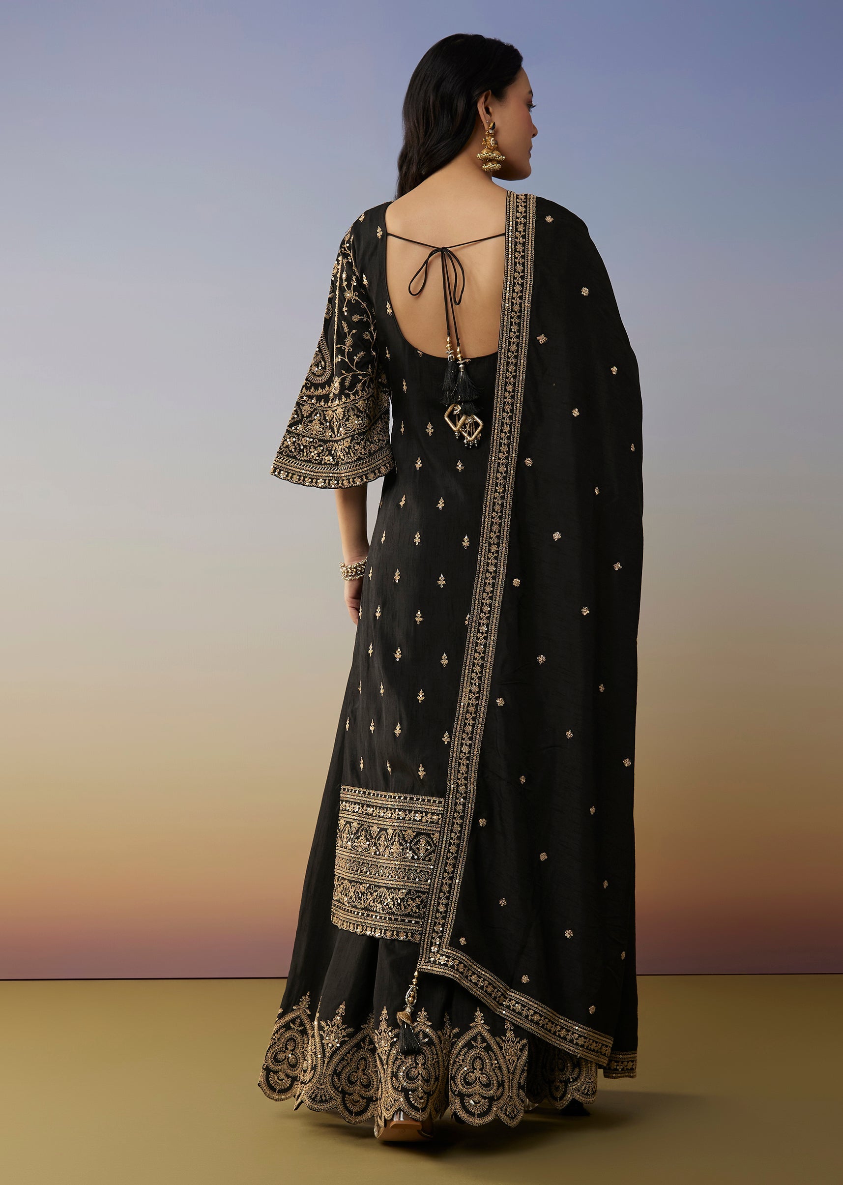 Black Silk Palazzo Suits with Zari Thread and Sequins Work