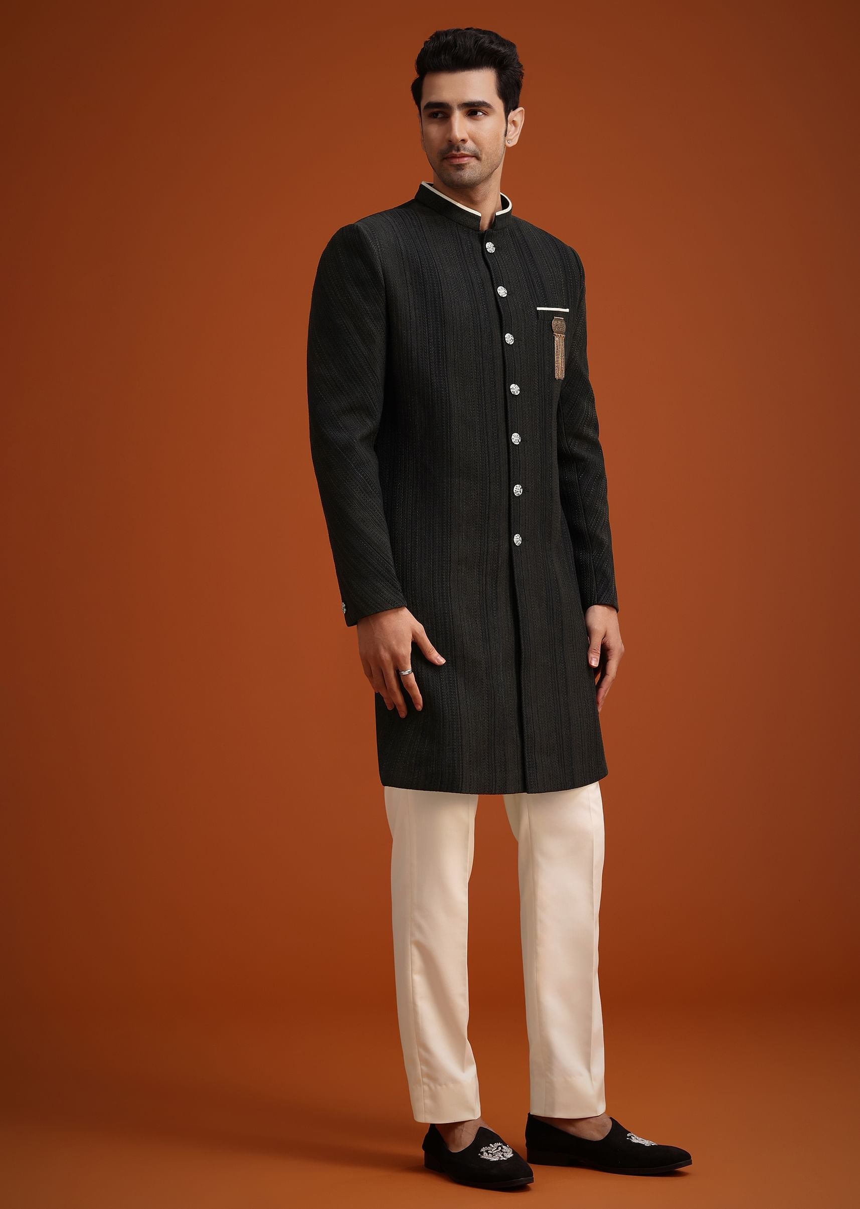 - This black sherwani set will help you dance through your favorite celebrations in style.