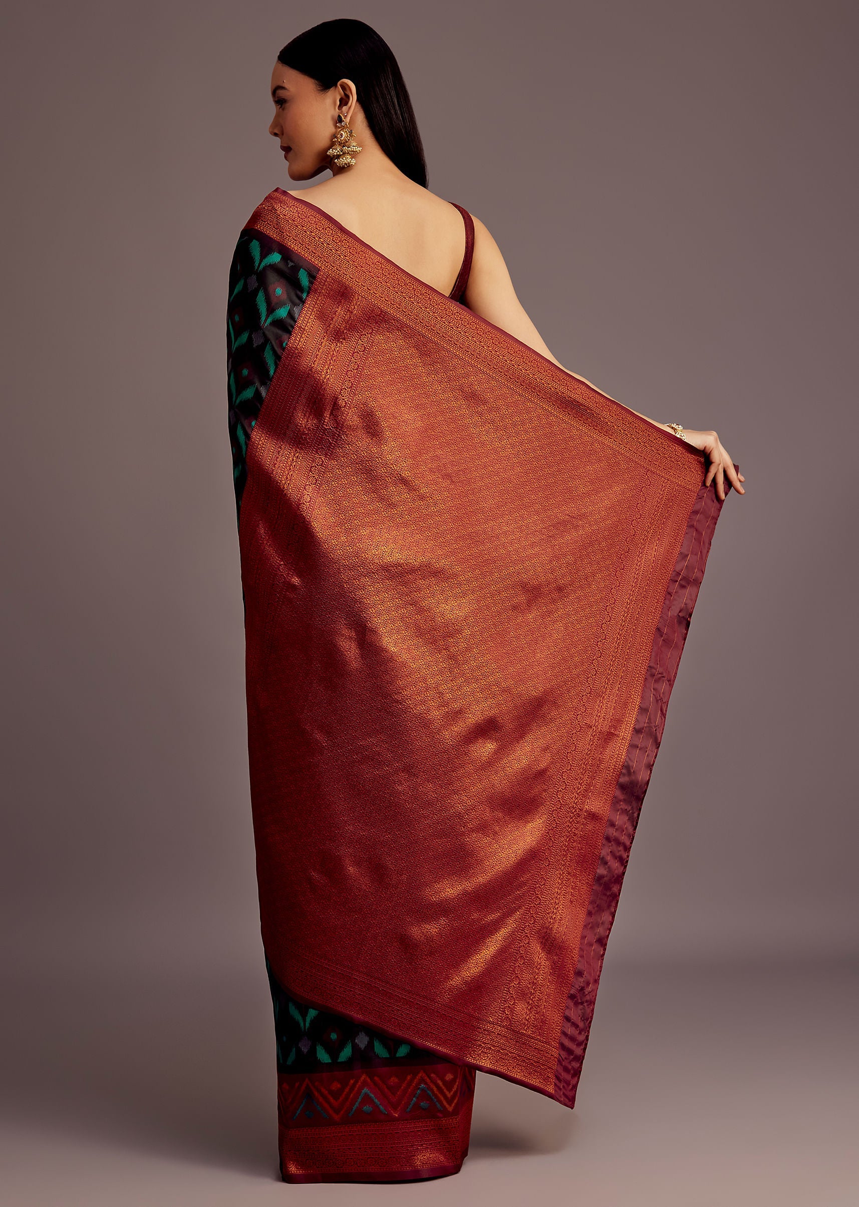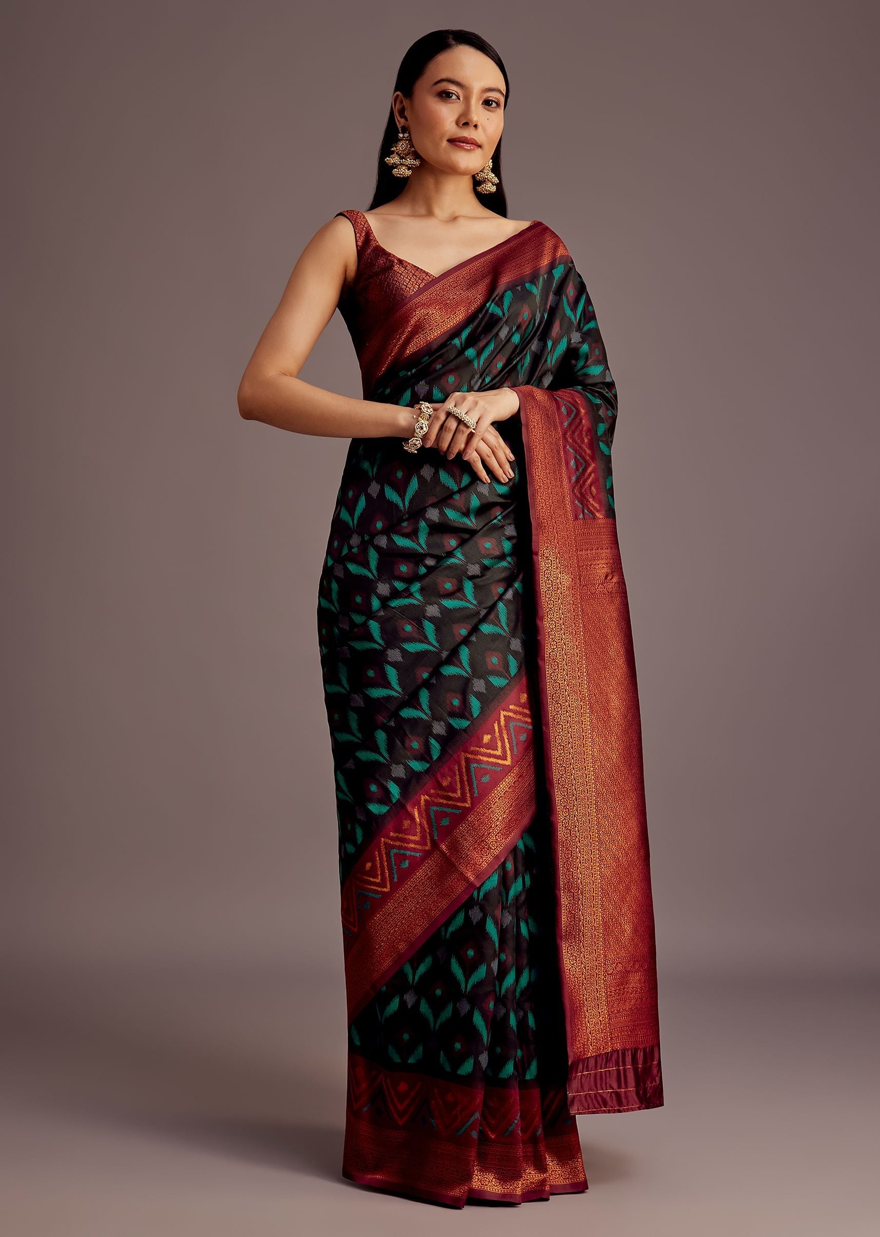 Exude timeless grace at weddings, receptions, and traditional celebrations with this black silk saree, featuring intricate zari weaving and a striking contrast border and pallu. The rich silk fabric and detailed craftsmanship make it an ideal choice for grand festive gatherings and cultural events. Its regal appeal ensures you stand out with sophistication and elegance. Awarded as the Most Trusted Brand, we're delivering styles you love, just as promised.