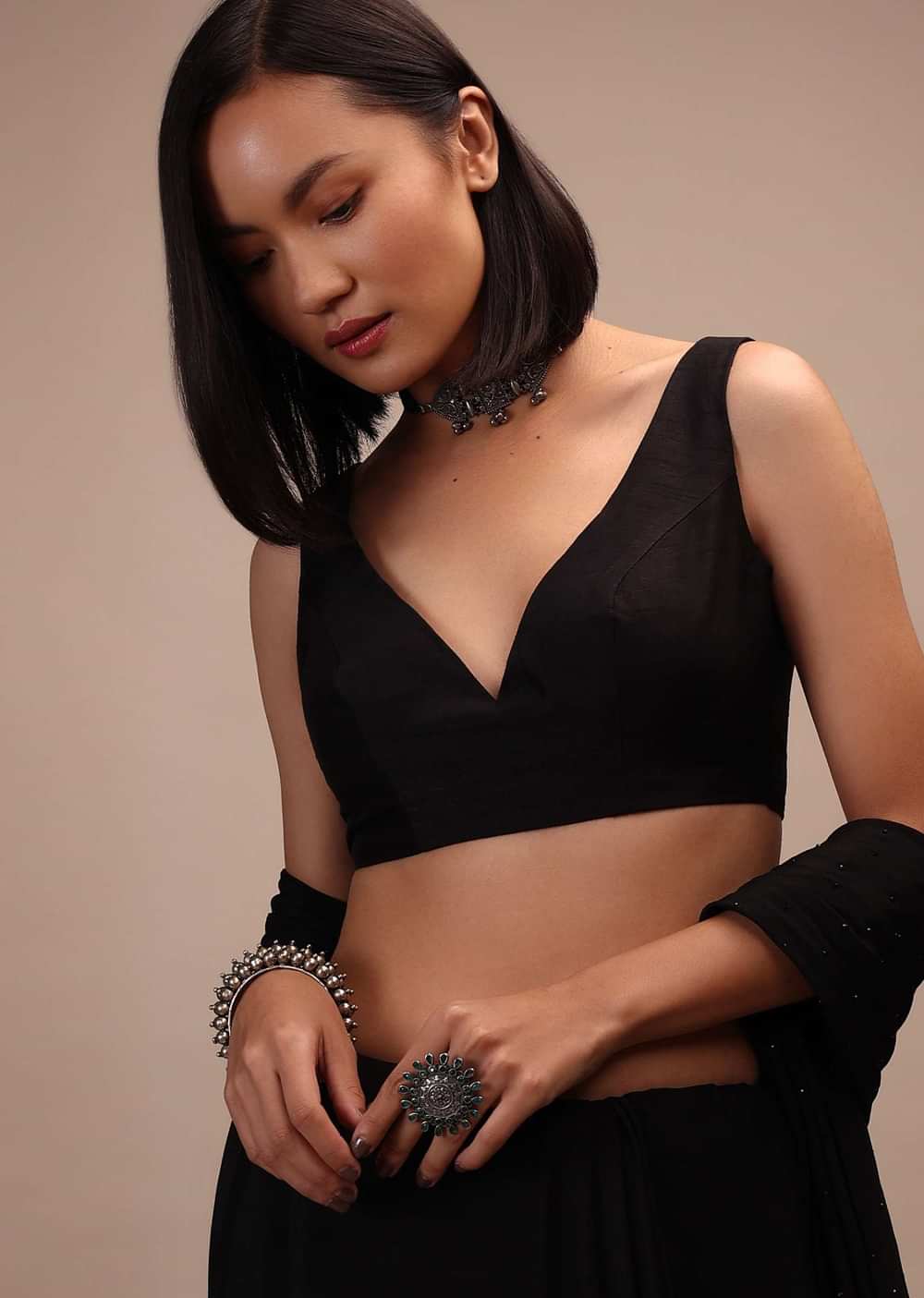 Black Sleeveless Blouse In A Sweetheart Neck Line Straight Hem Line With Back Zip Closure