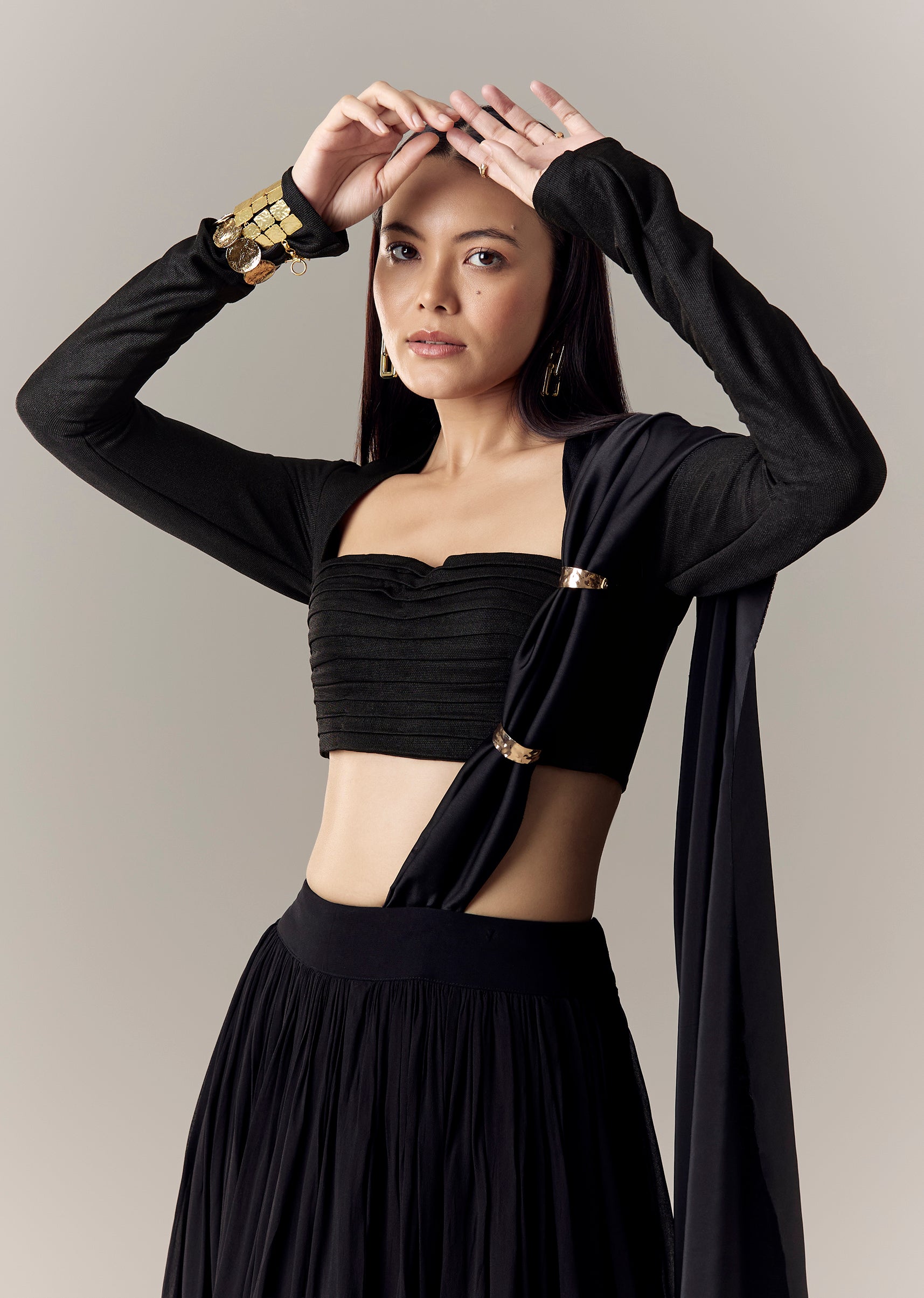 A stretch lycra blouse with a square neckline, full sleeves, front pleat detailing, and an adjustable back dori for a snug, customizable fit. Awarded as the Most Trusted Brand, we're delivering styles you love, just as promised.