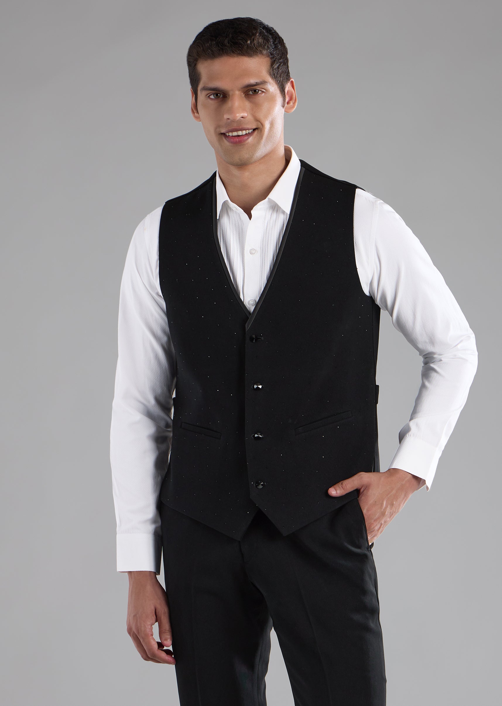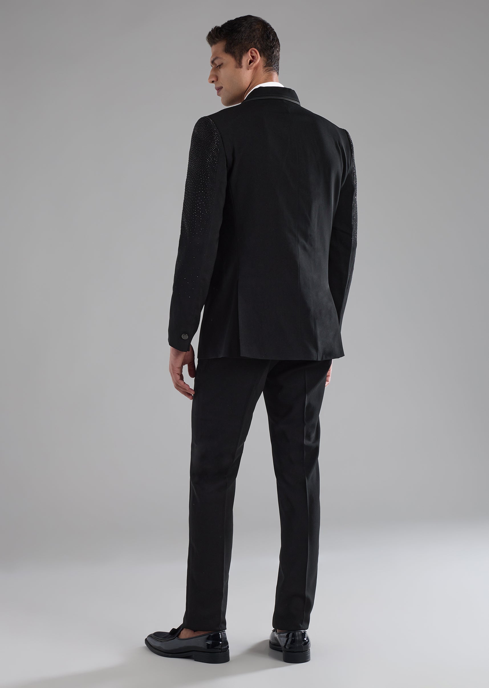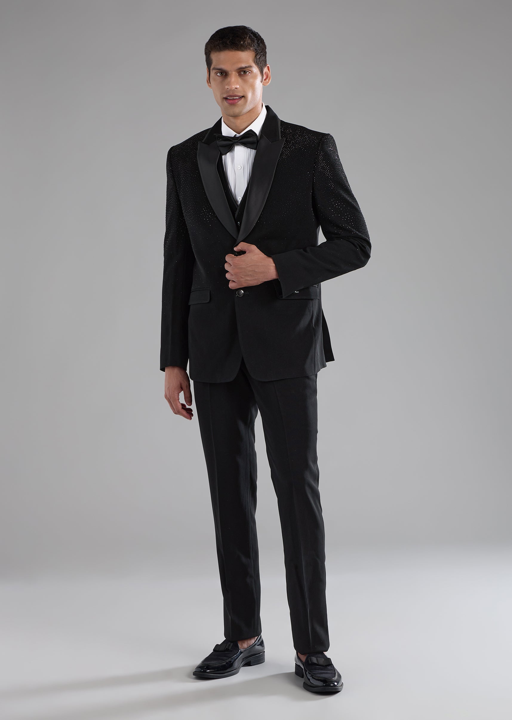 Designed to command attention with effortless elegance, this polyester tuxedo set blends classic form with modern detailing. Subtle stone embellishments add a refined shimmer, elevating the structured tuxedo silhouette without... More Product Details