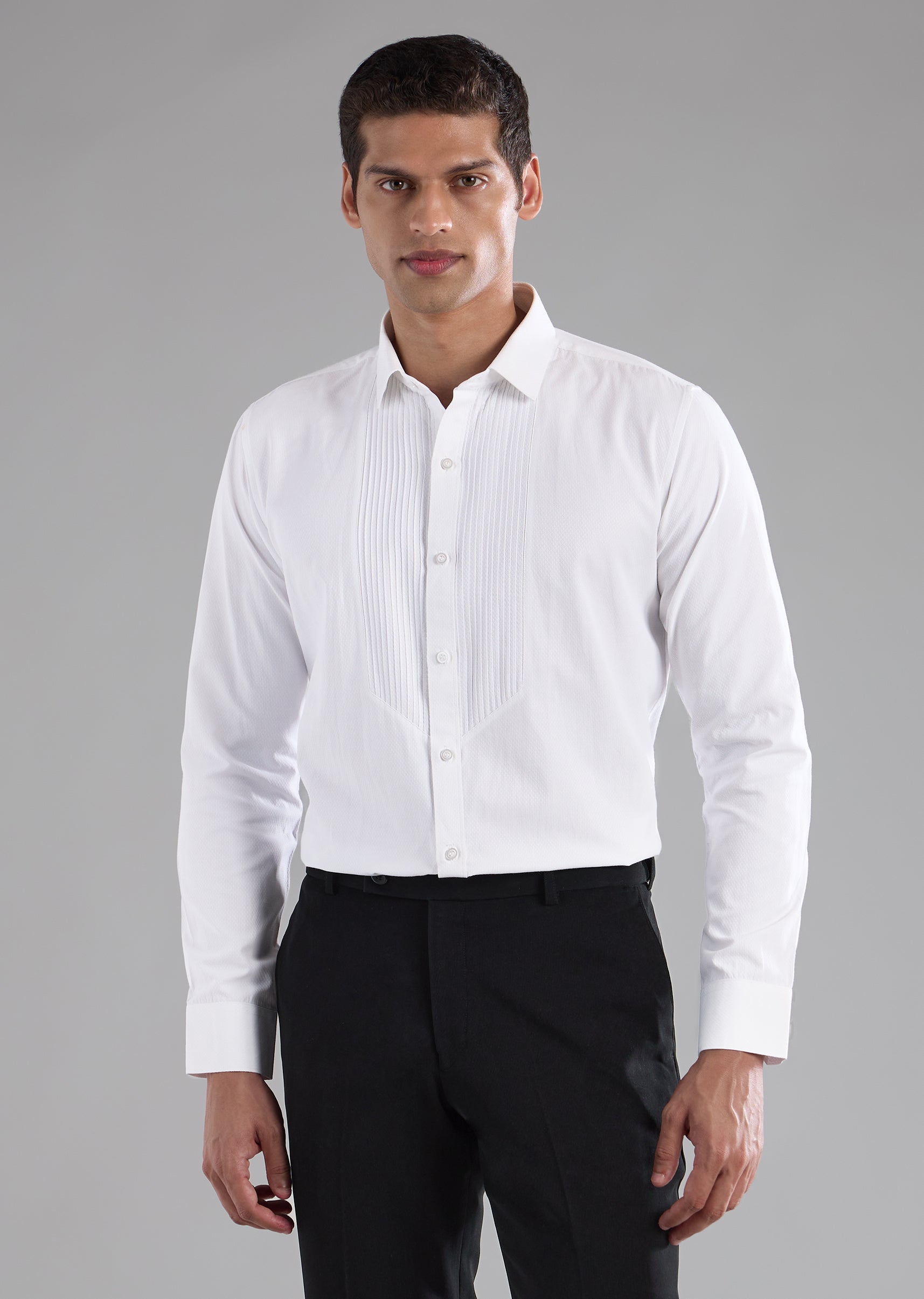 Opt for sleek formal shoes and a clean hairstyle to maintain a sharp, distinguished appearance.