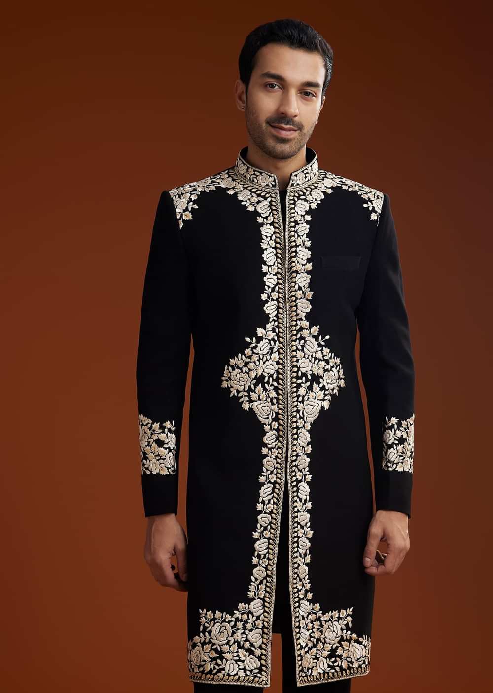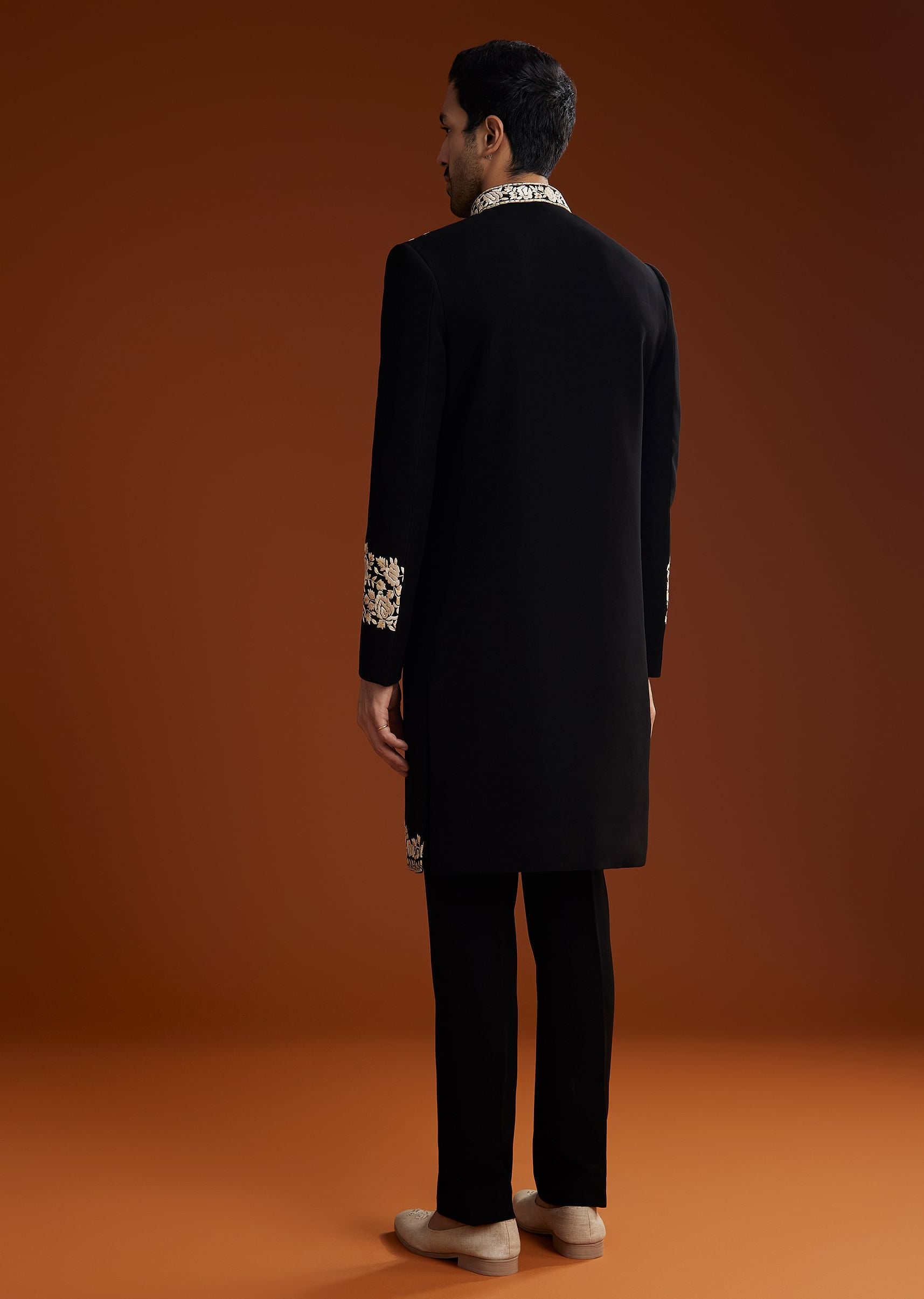 Black Suiting Indo Jacket Set With Floral Resham Embroidery