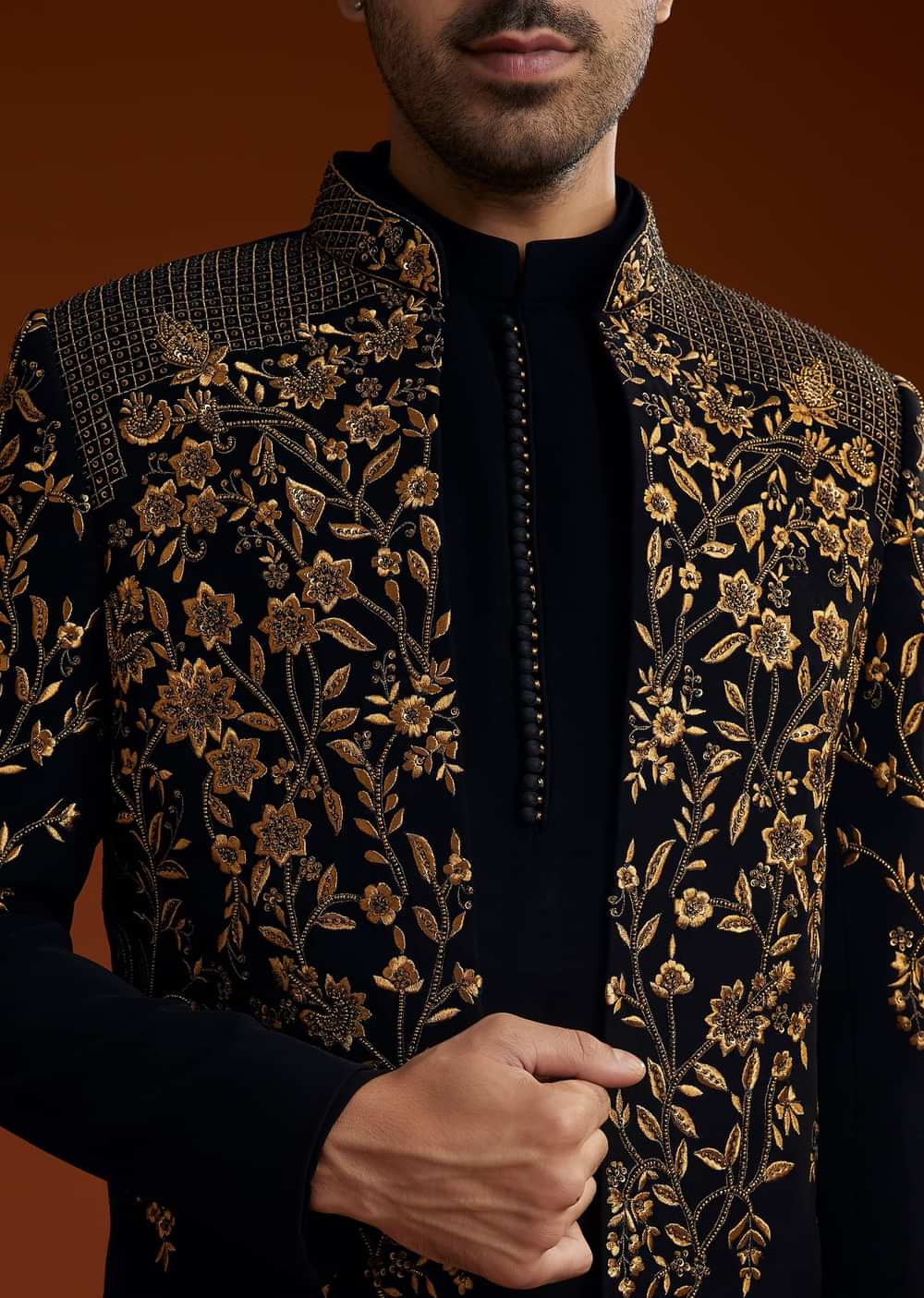 Black Suiting Indo Jacket Set With Zardosi Floral Embroidery
