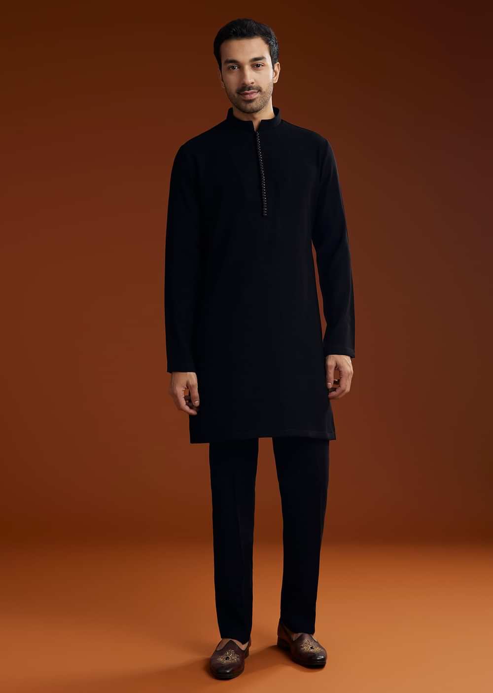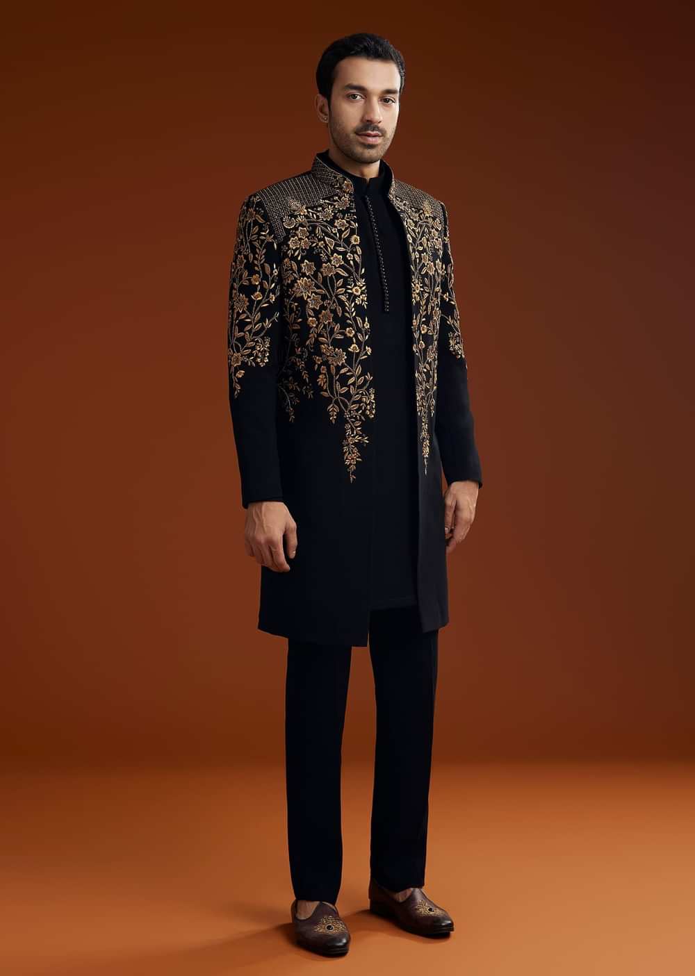 Elegantly crafted this black suiting Indojacket set showcases intricate zardosi floral embroidery. The front hookeye closure adds to its sleek and regal appeal.Awarded as the Most Trusted Brand we're delivering styles you love just as promised.