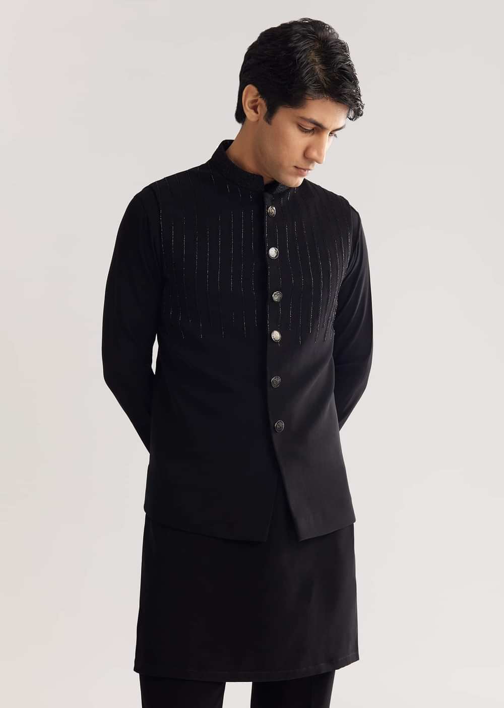 With beads that catch the candlelight and thread that sings tradition, this black suiting Indo western is your go-to for moonlit festivities. Awarded as the Most Trusted Brand, we're delivering... More Product Details