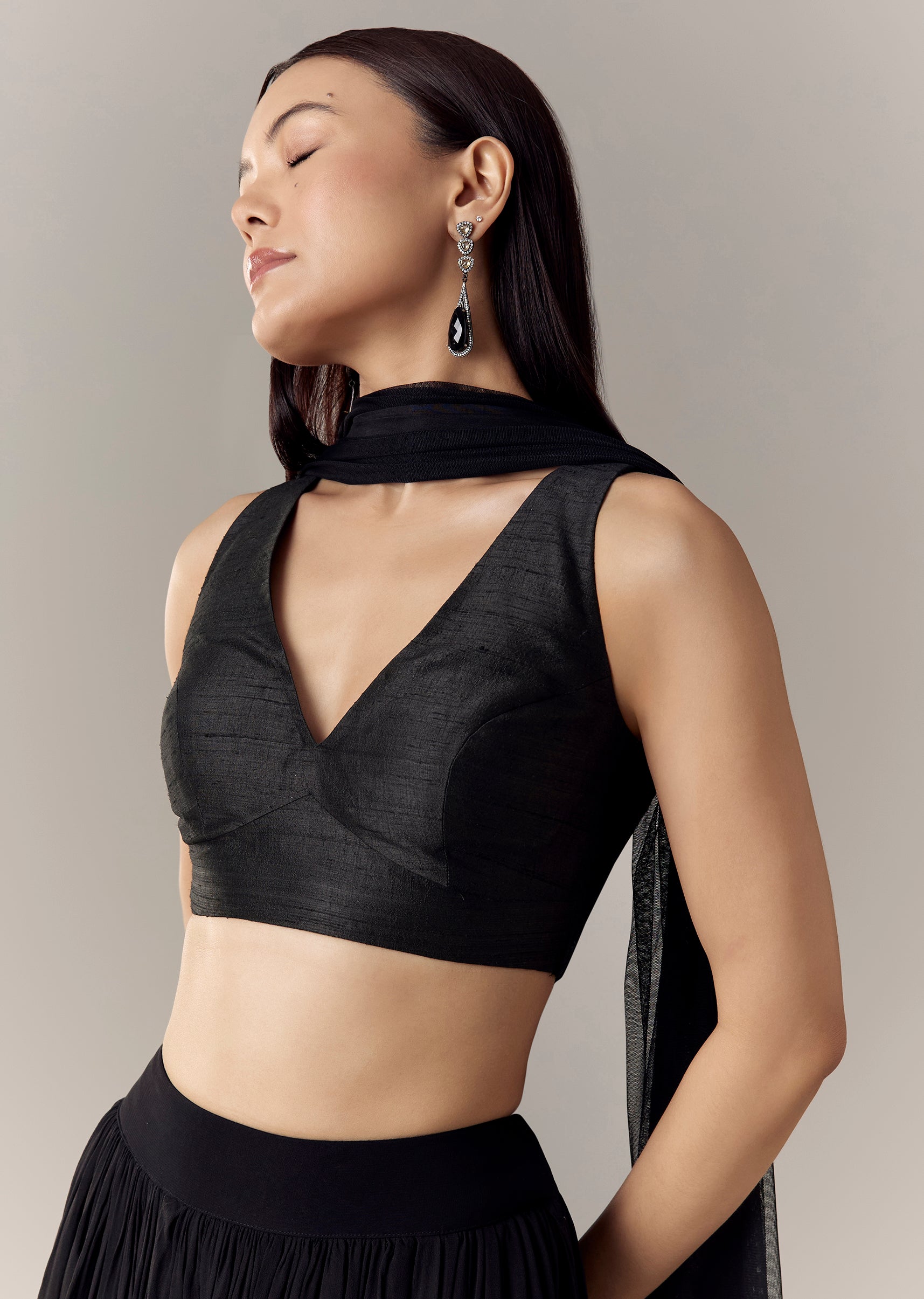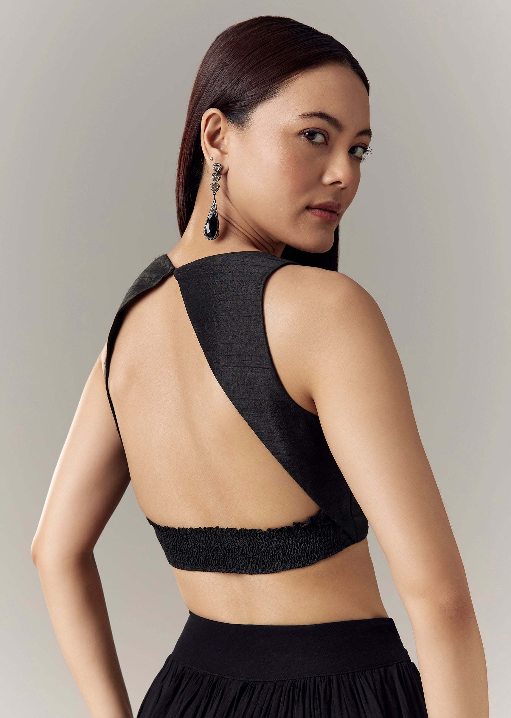 A black rawsilk corset-style blouse with a sweetheart neckline, smocking elastic at the back, and a tie-up around the neck for a secure, sculpted fit. Awarded as the Most Trusted... More Product Details