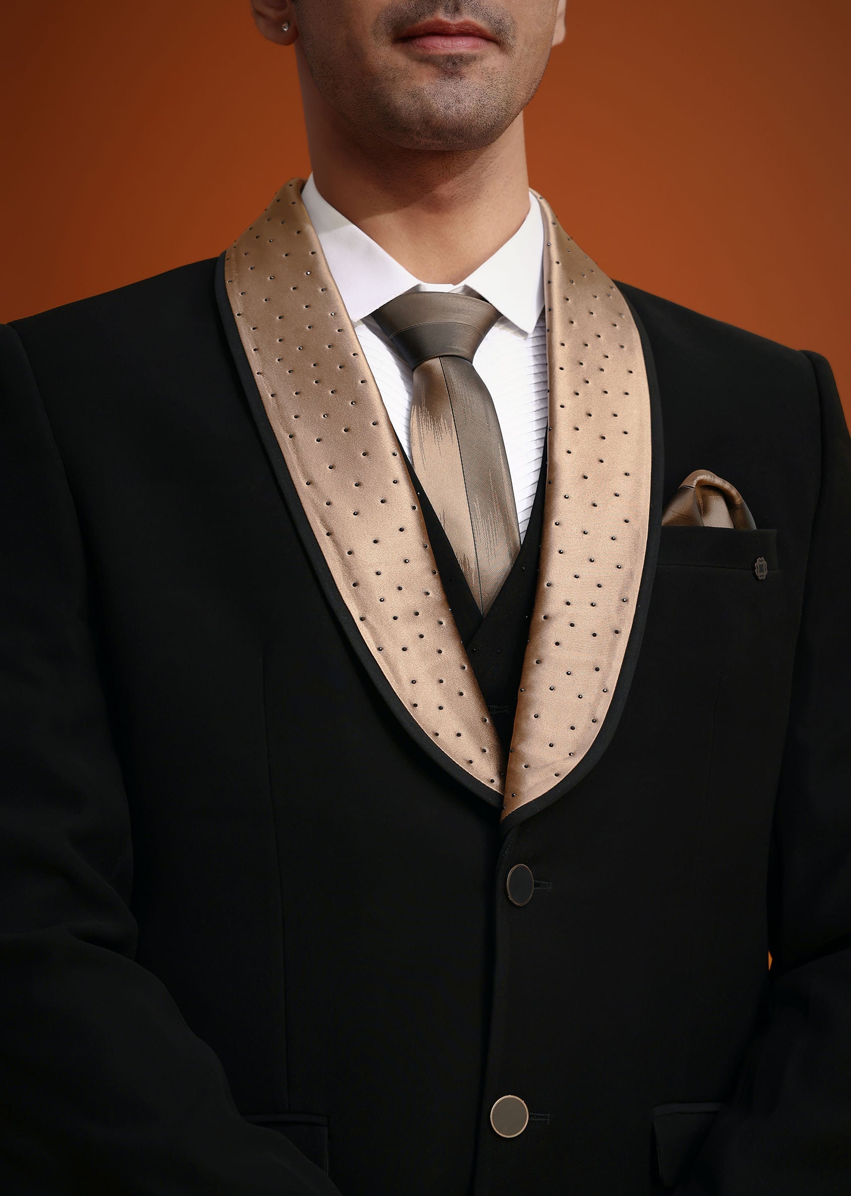 An epitome of timeless sophistication this opulent black tuxedo set is a visual expression of your effortless style. Designed with front buttons and a lapel collar the contrast lapel panel and stone embellishments add to its allure. Expertly crafted on rich polyester this outfit is completed with a matching waistcoat a fancy tie pocket square shirt and coordinating trousers. Awarded as the Most Trusted Brand, we're delivering styles you love, just as promised.