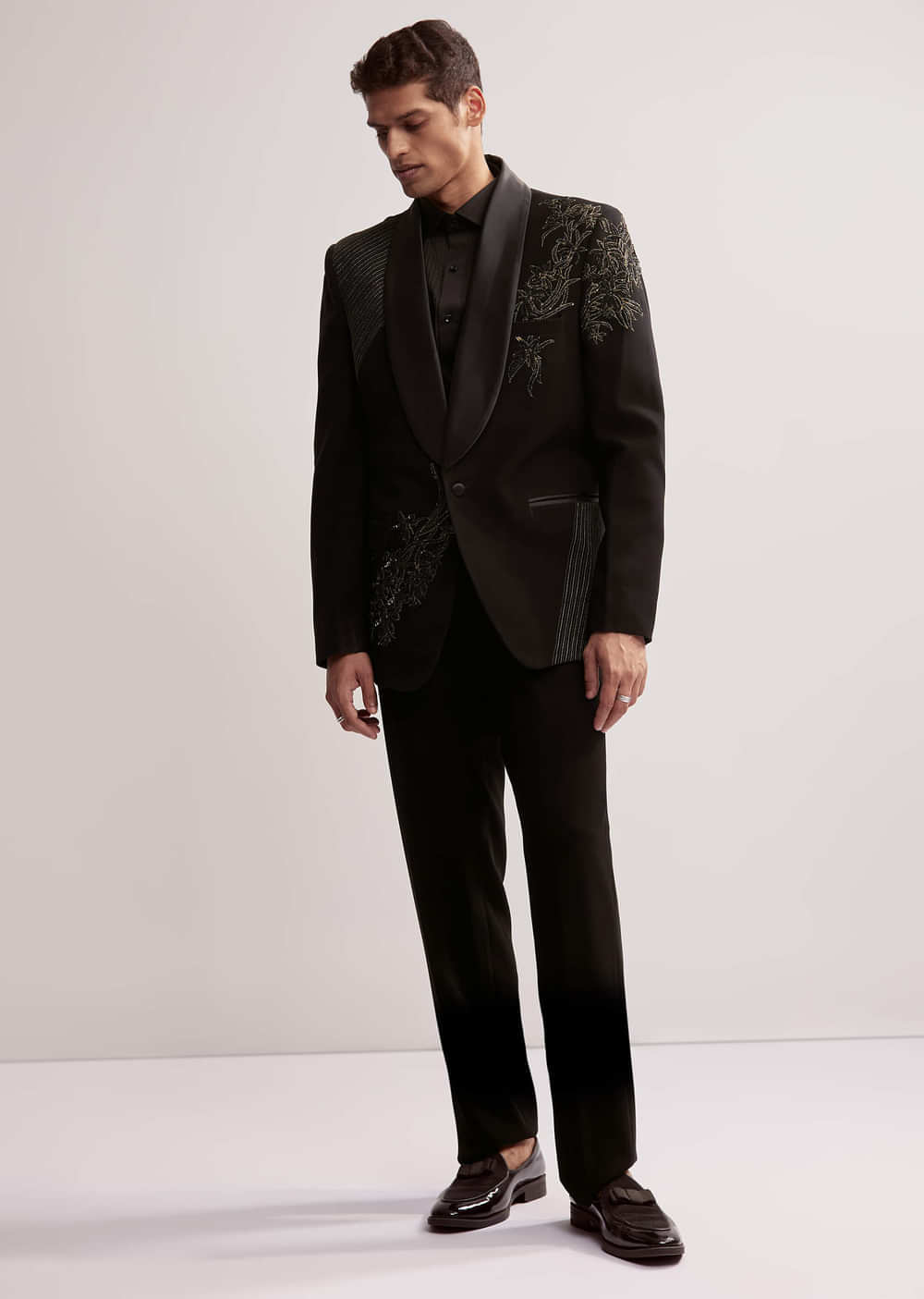 Cocktail looks go luxe with this black tuxedo for men, styled for wedding evenings. The blazer carries resham embroidery paired with a pleated shirt, bow, and trousers. It is a standout groom or groomsman look for sangeet or cocktail wear. Awarded as the Most Trusted Brand, we're delivering styles you love, just as promised.