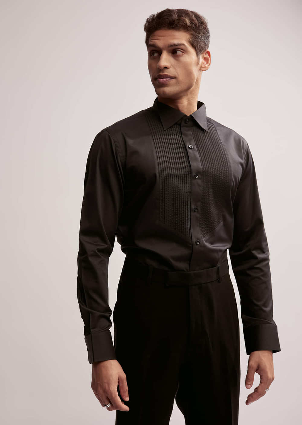 Style with patent shoes, a pocket square, and cufflinks, and keep hair sleek to match the modern finish.