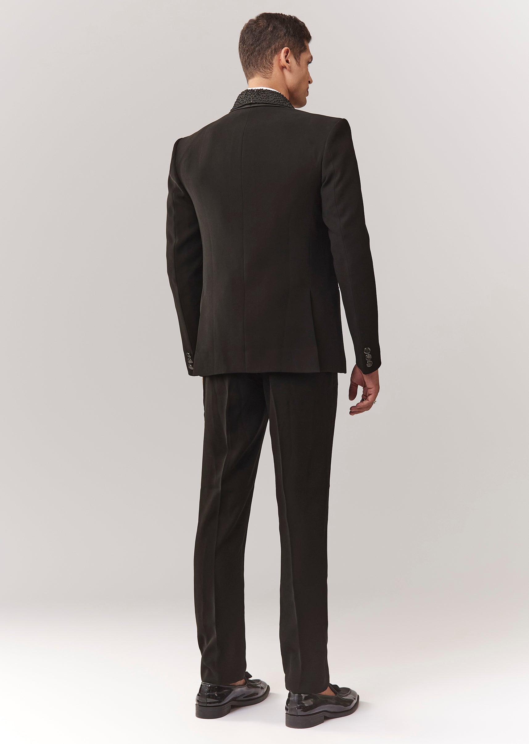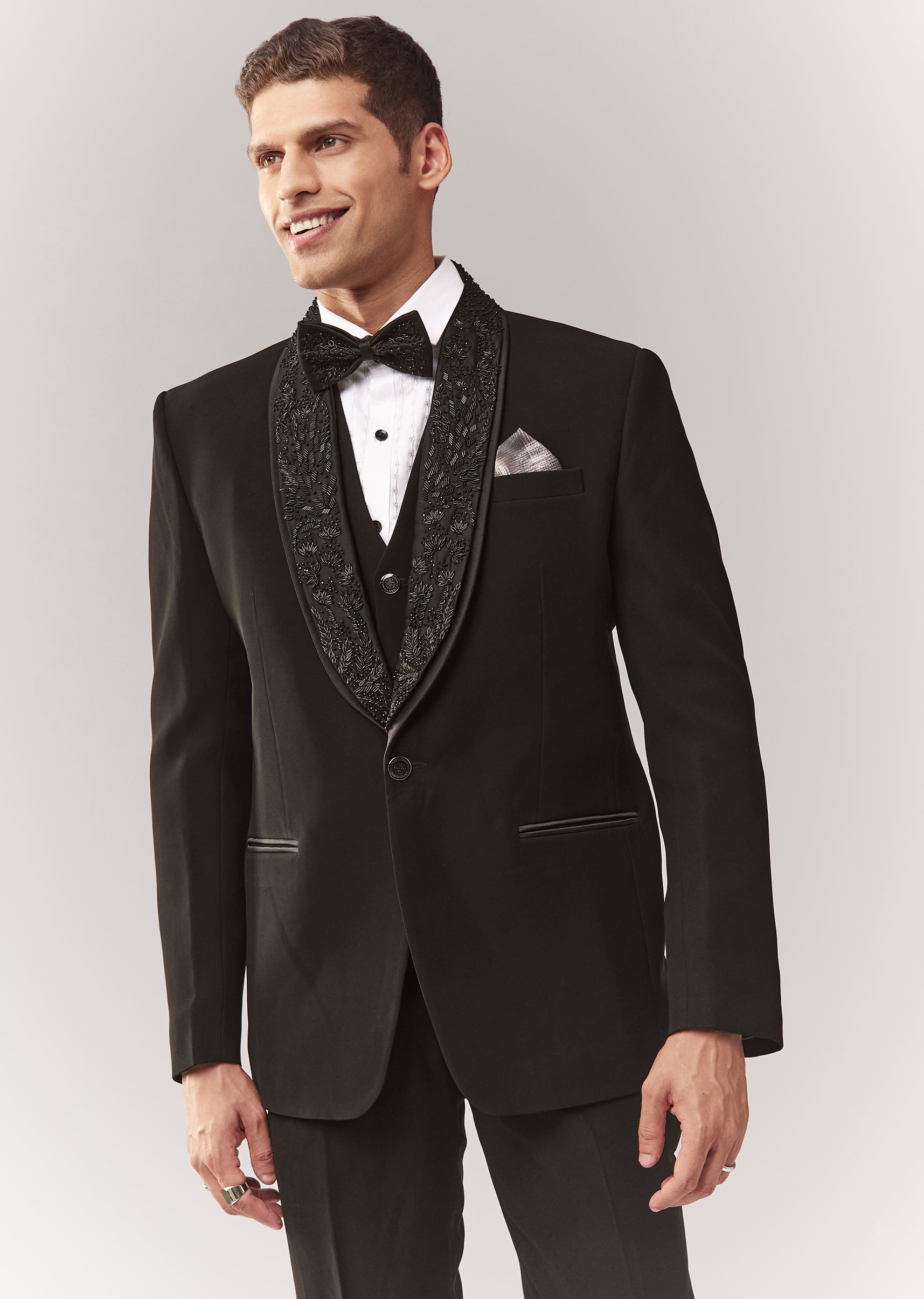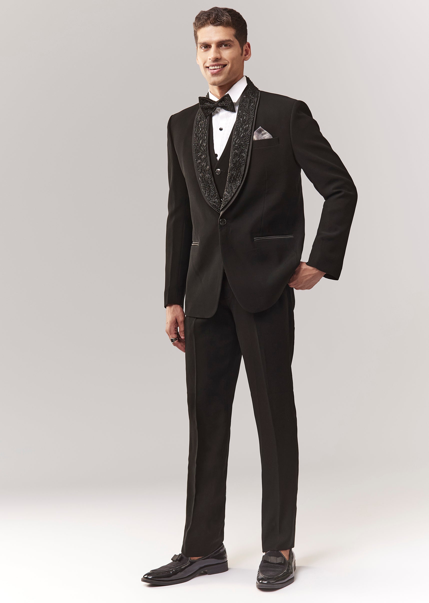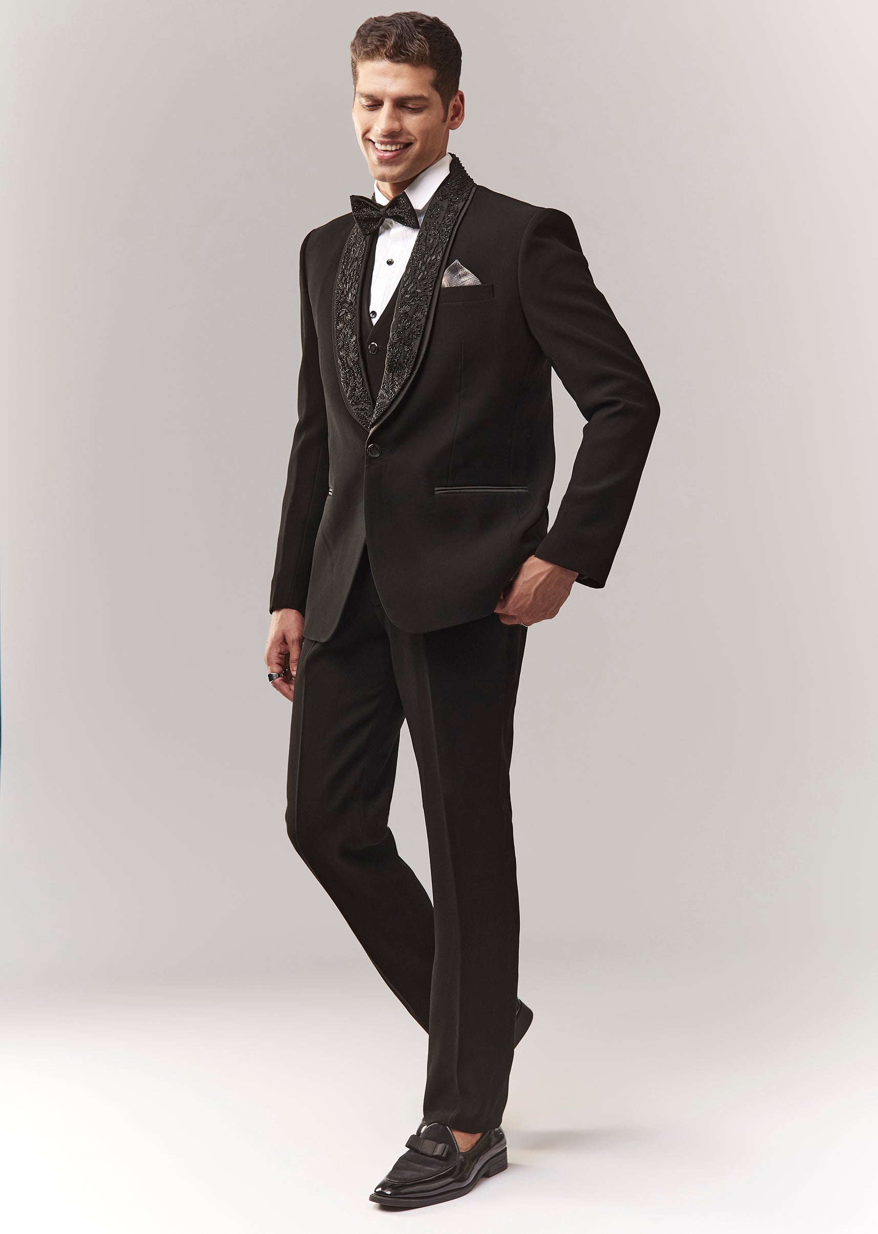 A formal tuxedo set featuring tuxedo + waistcoat + bow + shirt + trouser, highlighted with cutdana embellishment. Mandarin collar and structured front closures make it a reliable cocktail/reception option... More Product Details