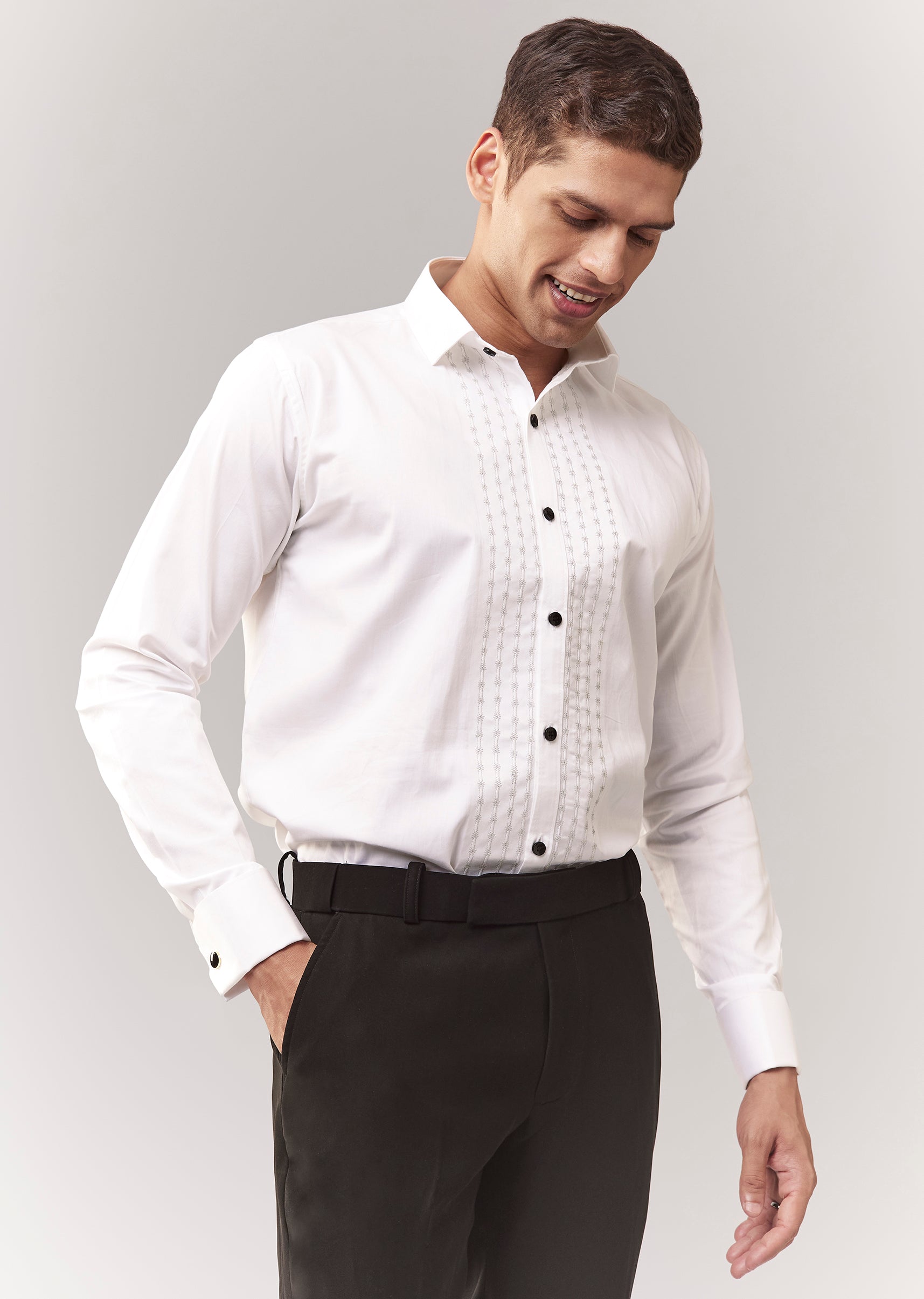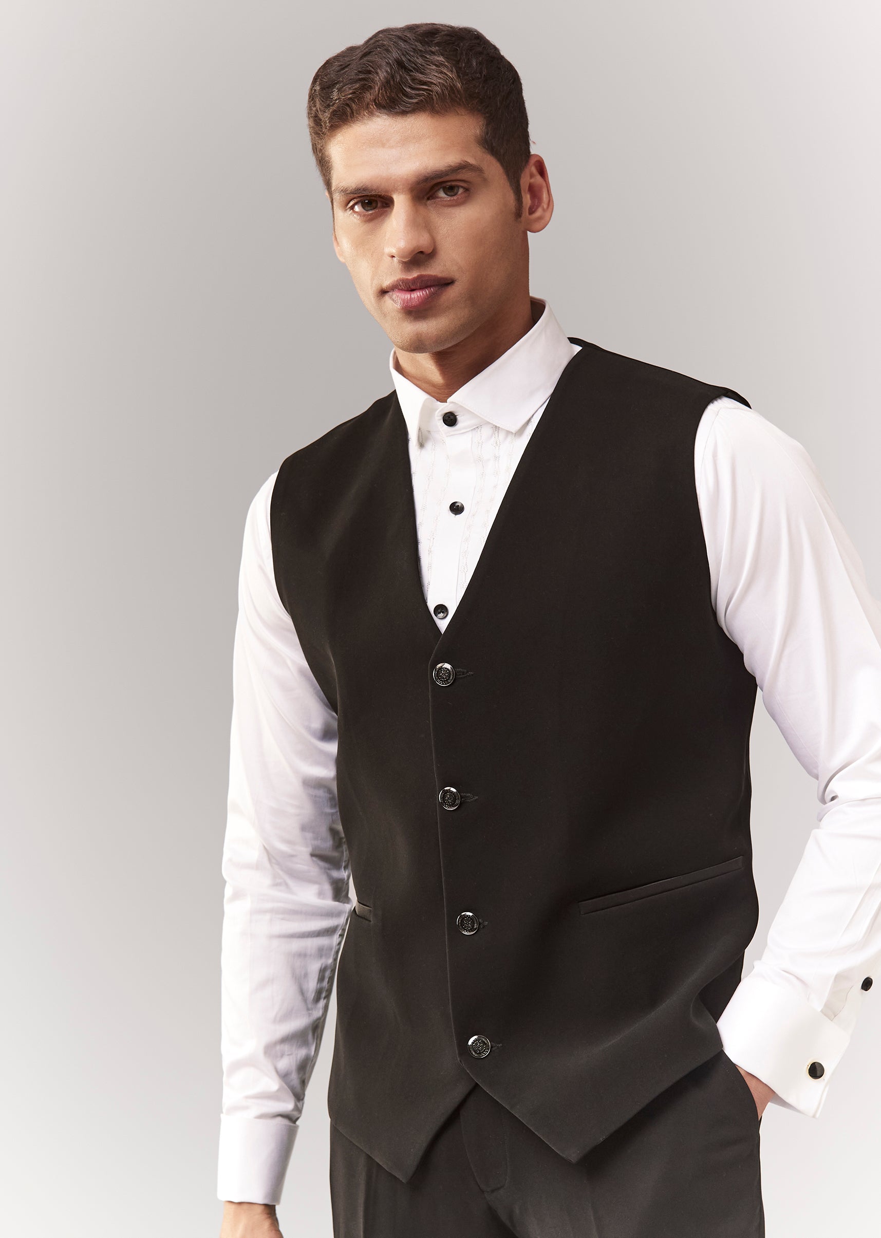 A formal tuxedo set featuring tuxedo + waistcoat + bow + shirt + trouser, highlighted with cutdana embellishment. Mandarin collar and structured front closures make it a reliable cocktail/reception option for groomsmen. Awarded as the Most Trusted Brand, we're delivering styles you love, just as promised.
