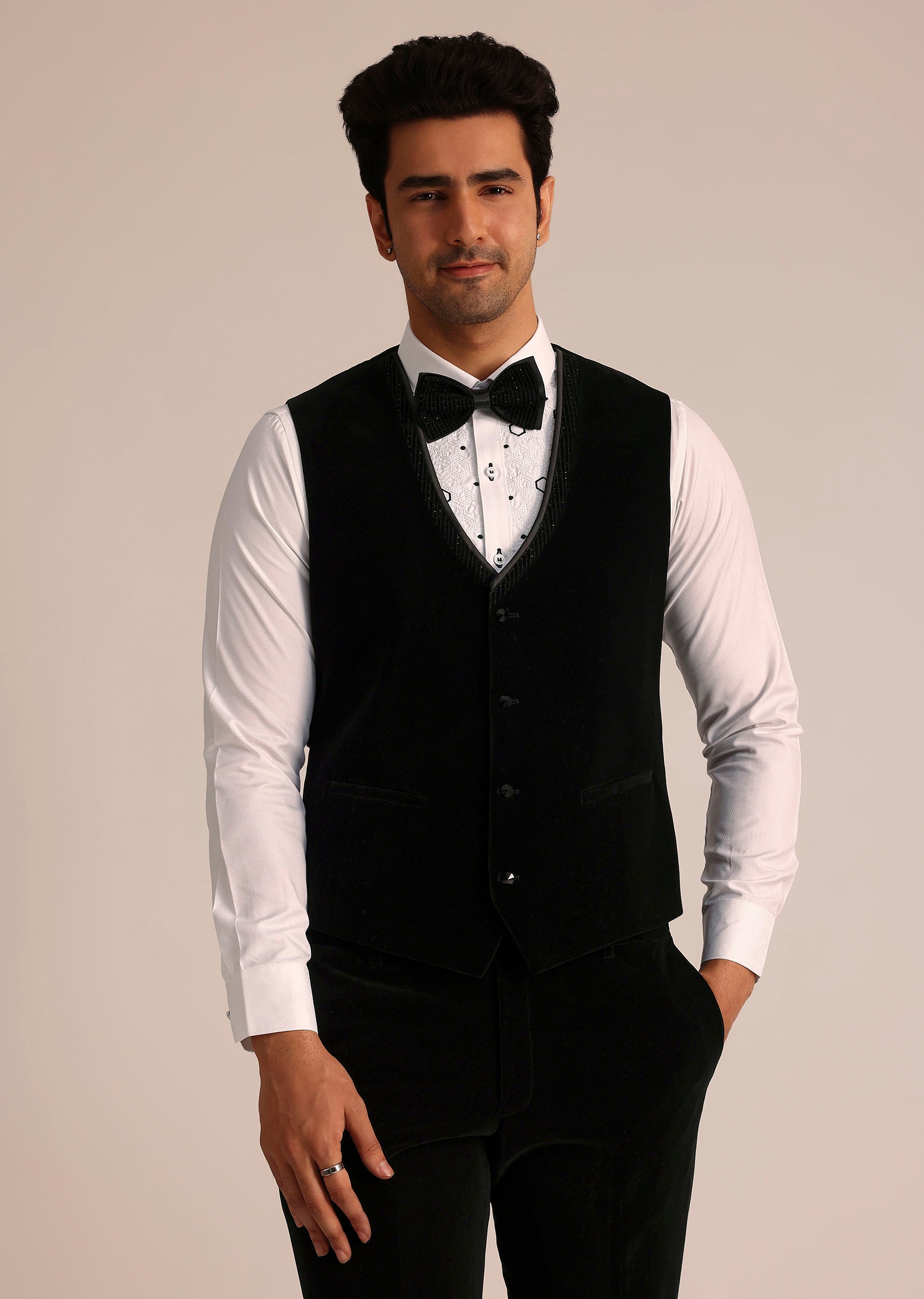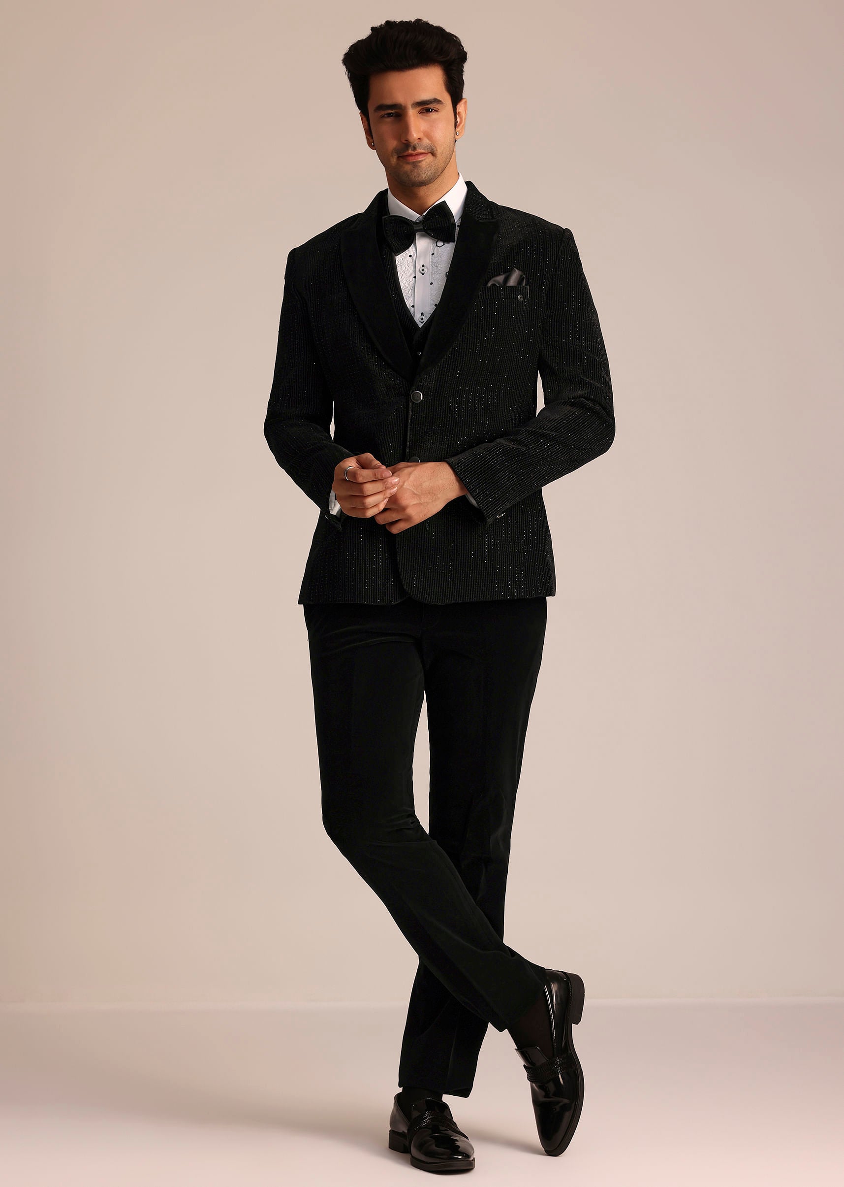 Step Into Timeless Sophistication With This Black Tuxedo Suit Featuring A Tailored Fit And Subtle Textured Detailing For An Elevated Look. Paired With A Crisp White Shirt And Classic Bow... More Product Details