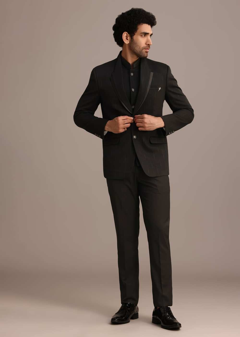 A resplendent choice for the minimalist fashion lover, this tonal black tuxedo set ensure a standout statement at cocktail parties and wedding celebrations. Showcasing a stylish shawl collar, the tuxedo... More Product Details