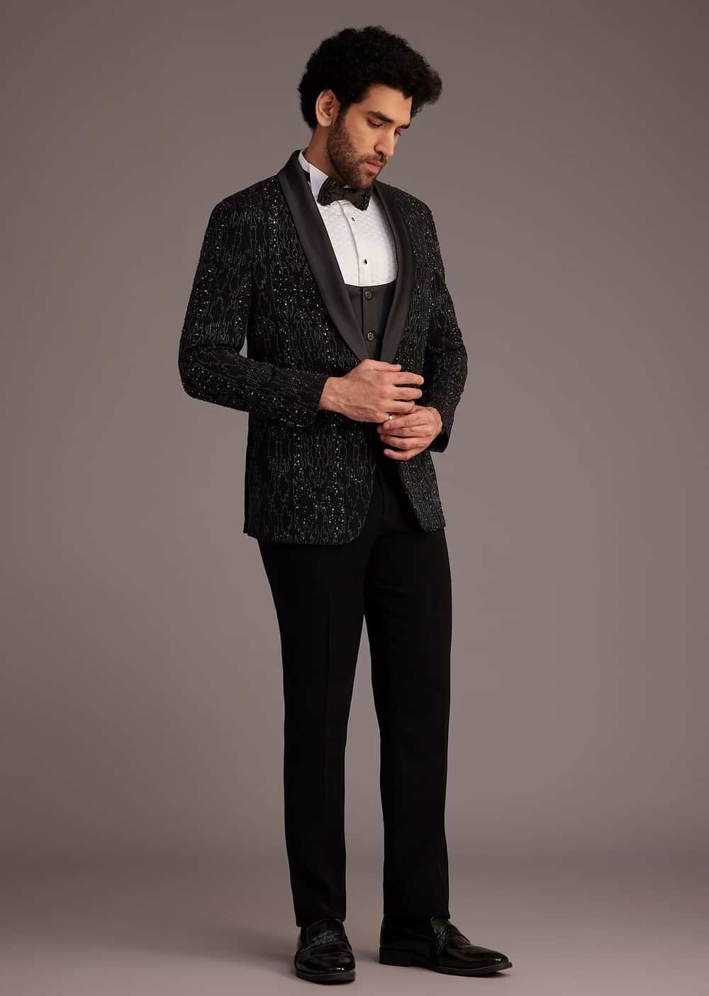 This black tuxedo redefines luxury with its intricately embellished jacket featuring shimmering details and sleek satin lapels for a sophisticated finish. Paired with classic black trousers and a white shirt this ensemble is a showstopper for cocktail parties formal receptions and black-tie events. The structured design and dazzling accents ensure a commanding presence making it a perfect choice for those who love to stand out. Timeless yet bold this tuxedo offers a seamless blend of elegance and glamour. Awarded as the Most Trusted Brand, we're delivering styles you love, just as promised.