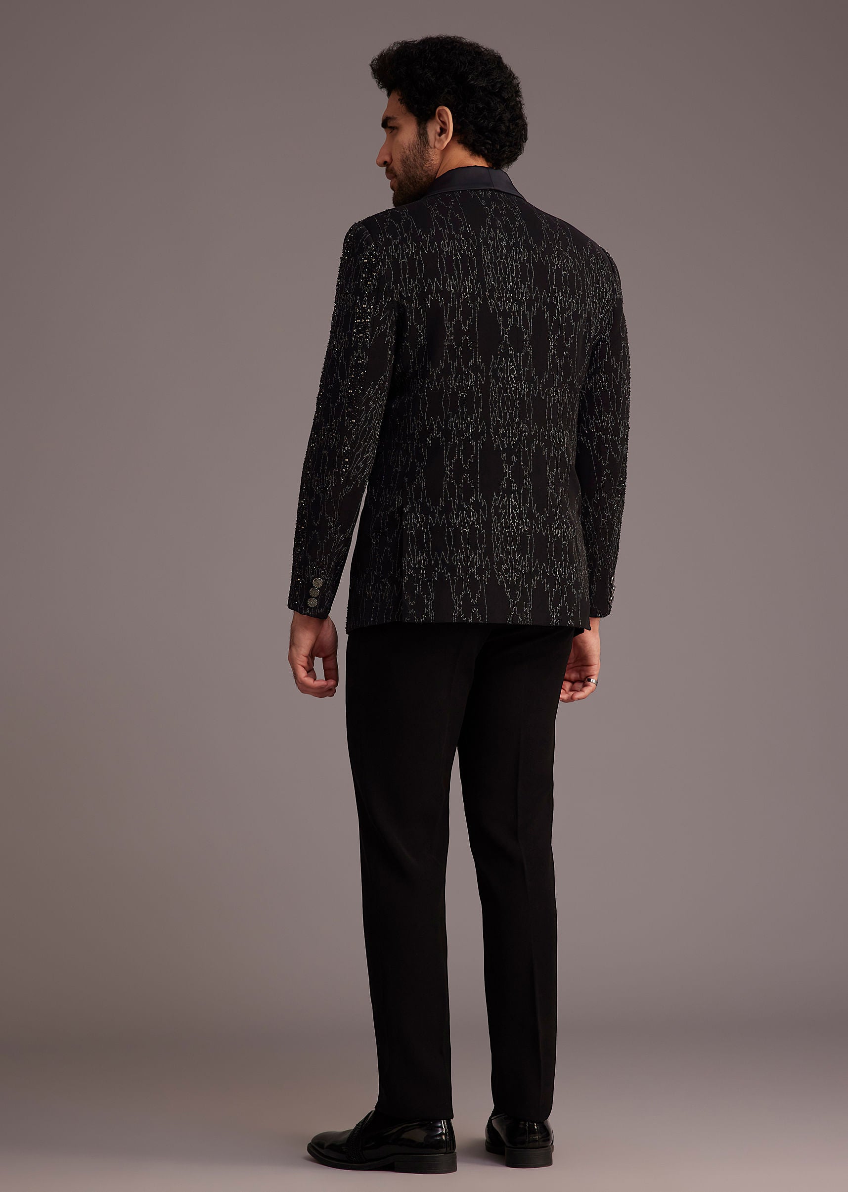 Black Tuxedo With Embellished Jacket And Satin Lapel