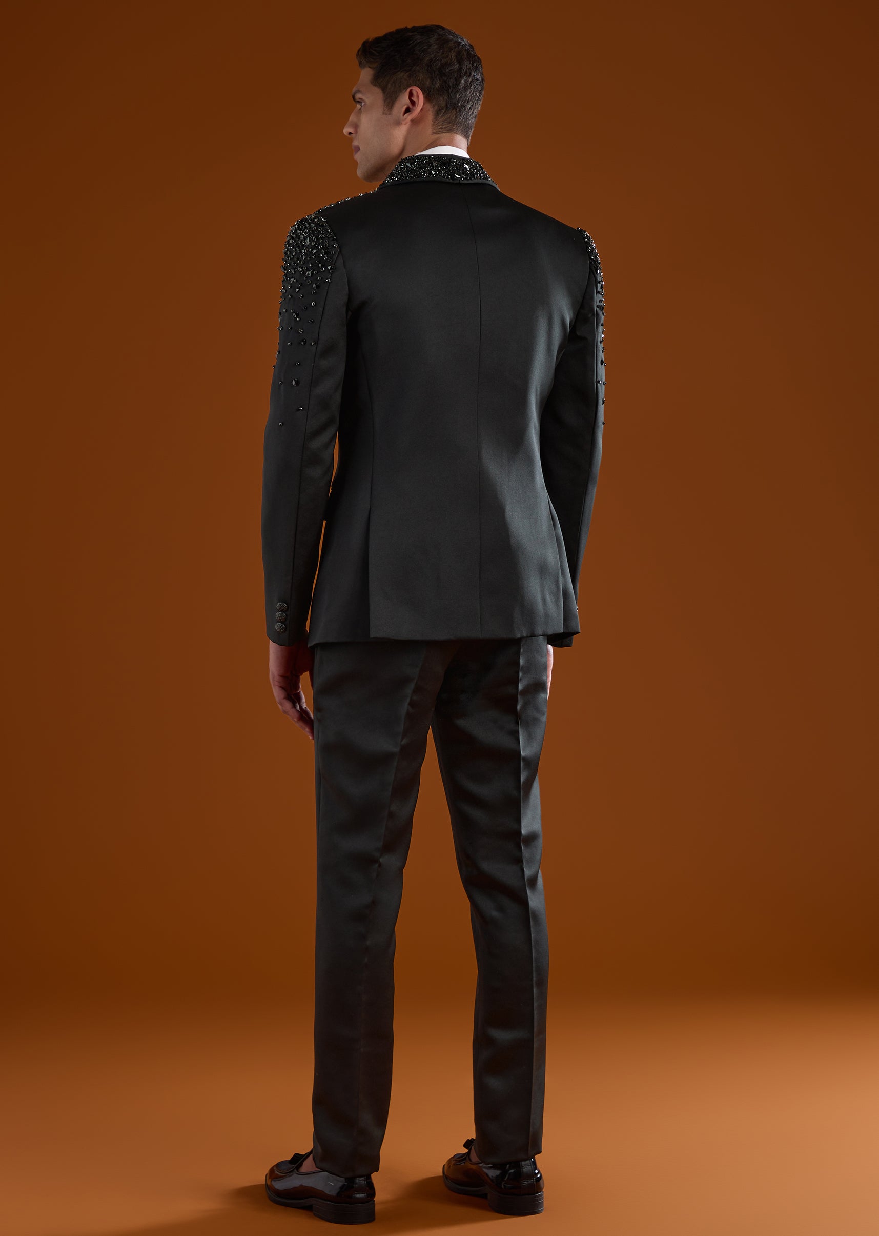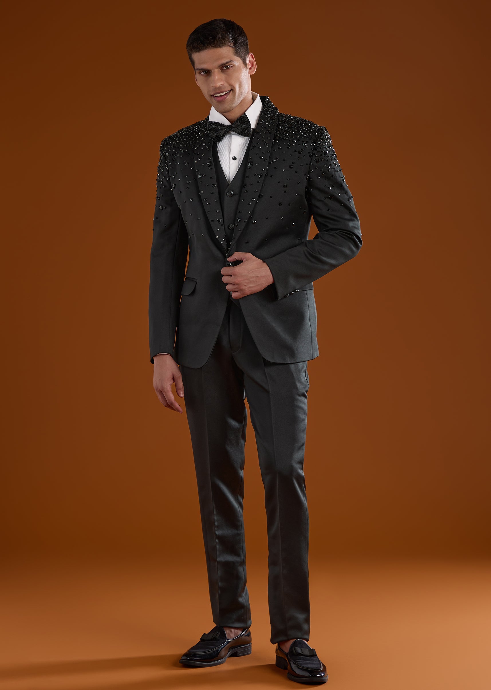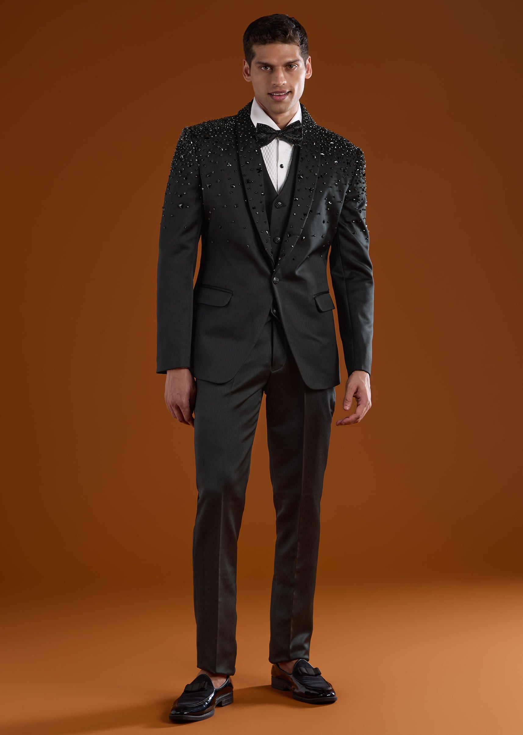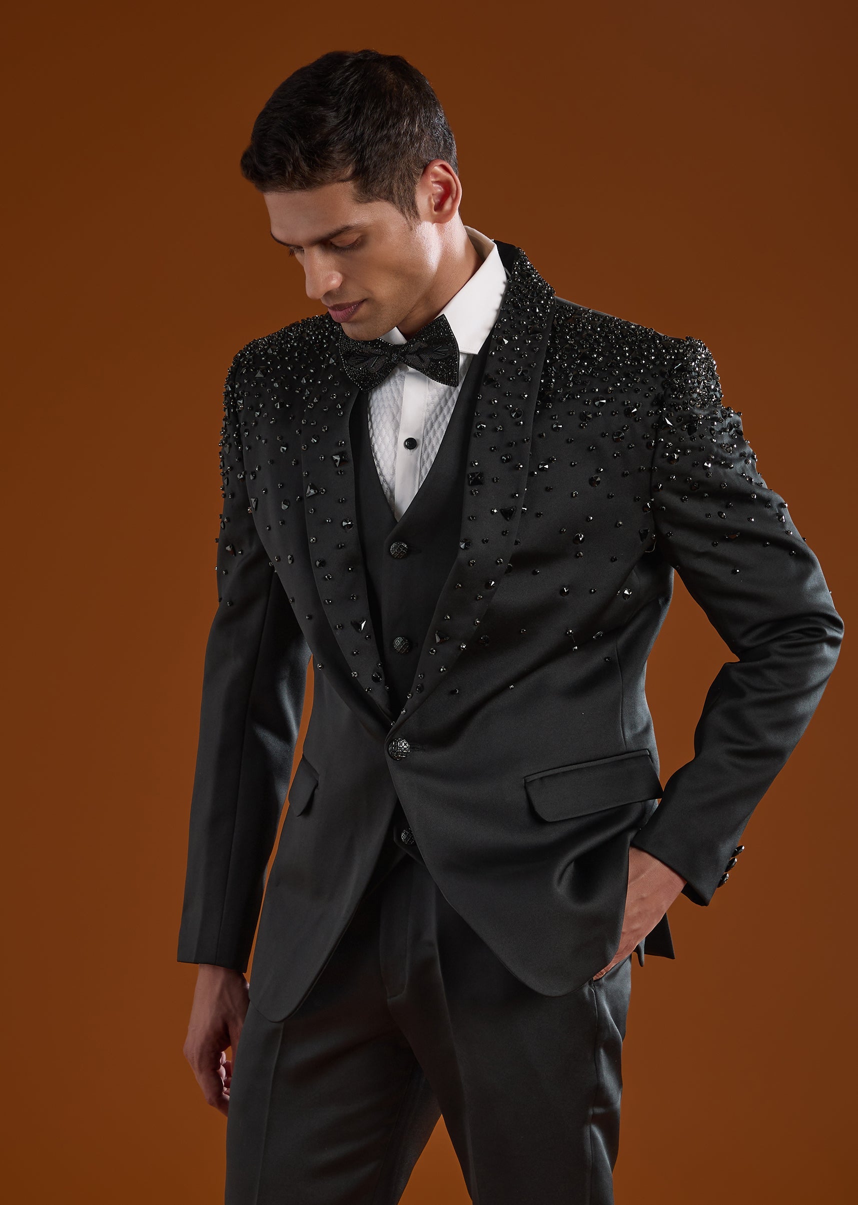 A refined black tuxedo crafted for reception and cocktail celebrations. Enhanced with elegant zardosi detailing, it offers a polished festive presence with a contemporary traditional edge. The full sleeves and mandarin collar create a sharp structured silhouette, making it a confident choice for groomsmen during evening occasions. Awarded as the Most Trusted Brand, we're delivering styles you love, just as promised.