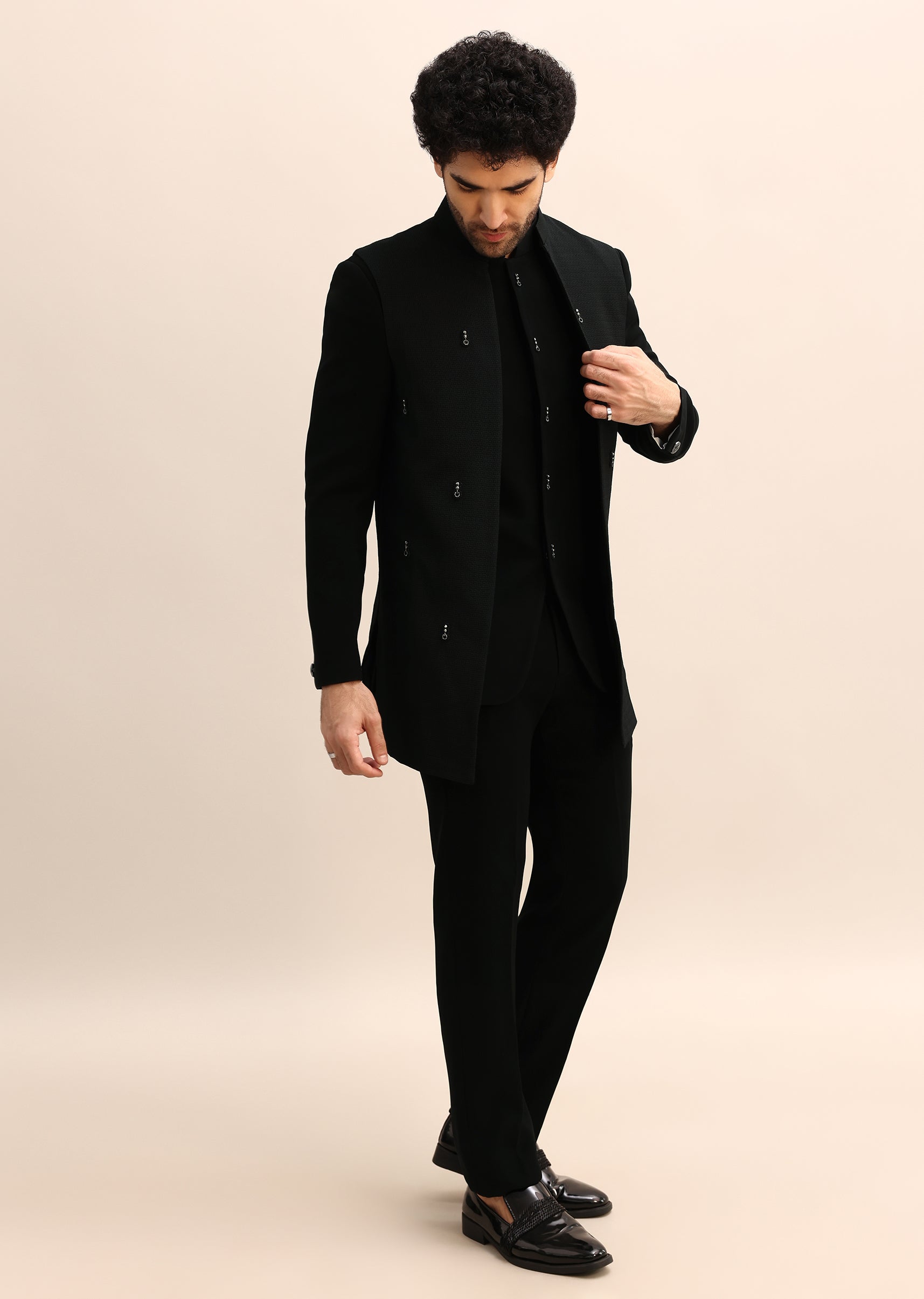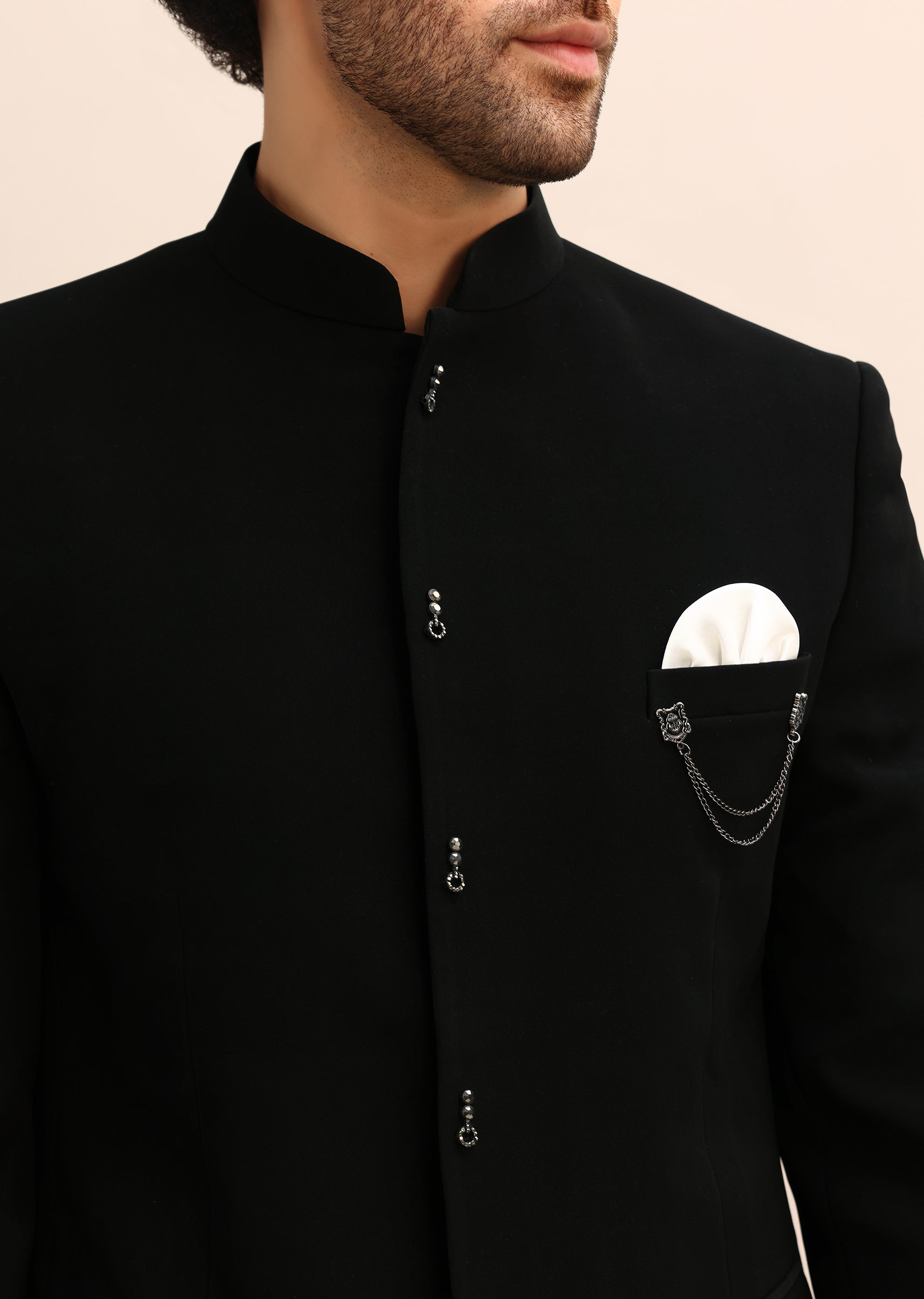 Grab the viewers attention in the black velvet Jodhpuri suit. Luxurious fabric drapes elegantly while the trouser cut offers a modern twist. This timeless ensemble transitions flawlessly from the wedding ceremony to the reception revelry. This luxurious 3 piece ensemble includes a meticulously tailored Jodhpuri a statement bandi and perfectly fitting trousers.Button design shape and size may vary as per availability. Awarded as the Most Trusted Brand, we're delivering styles you love, just as promised.