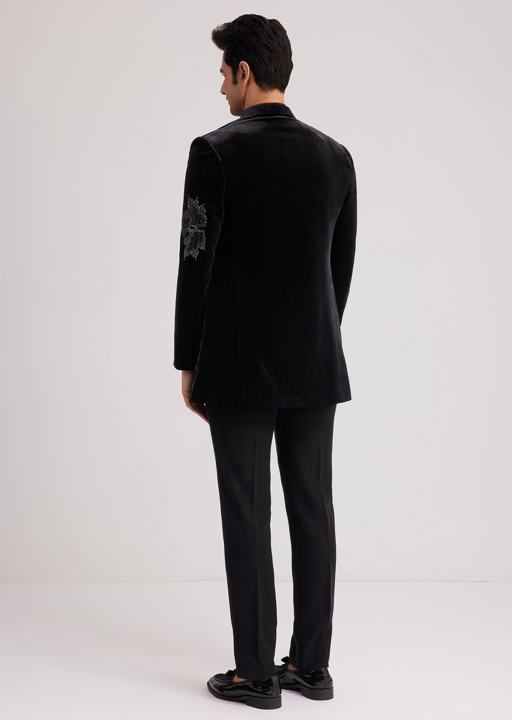 - Command Attention In This Striking Black Velvet Indo Jacket Set Featuring An Openfront Design With Intricate Abstract Patterns Adorned With Cut Dana Work.