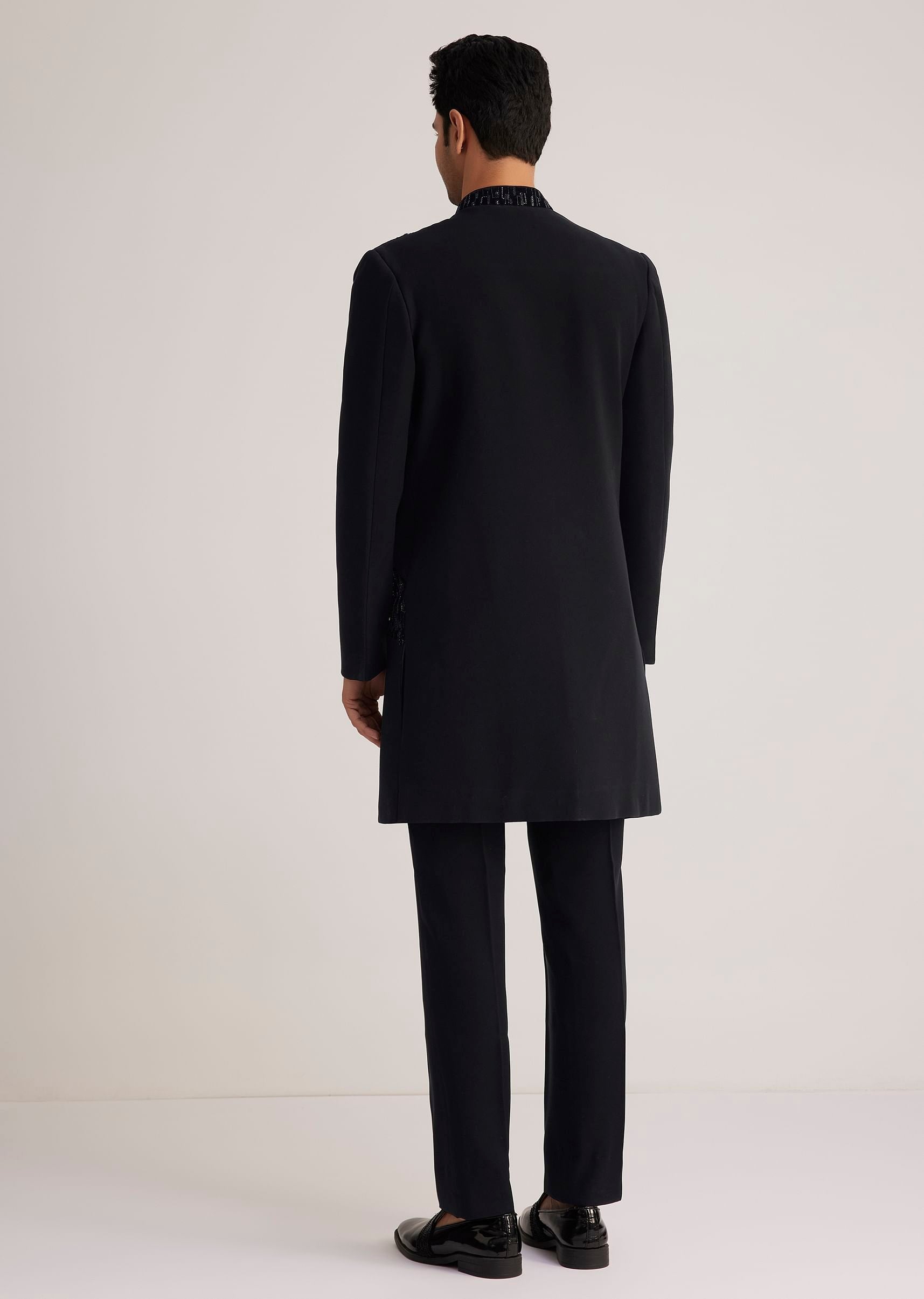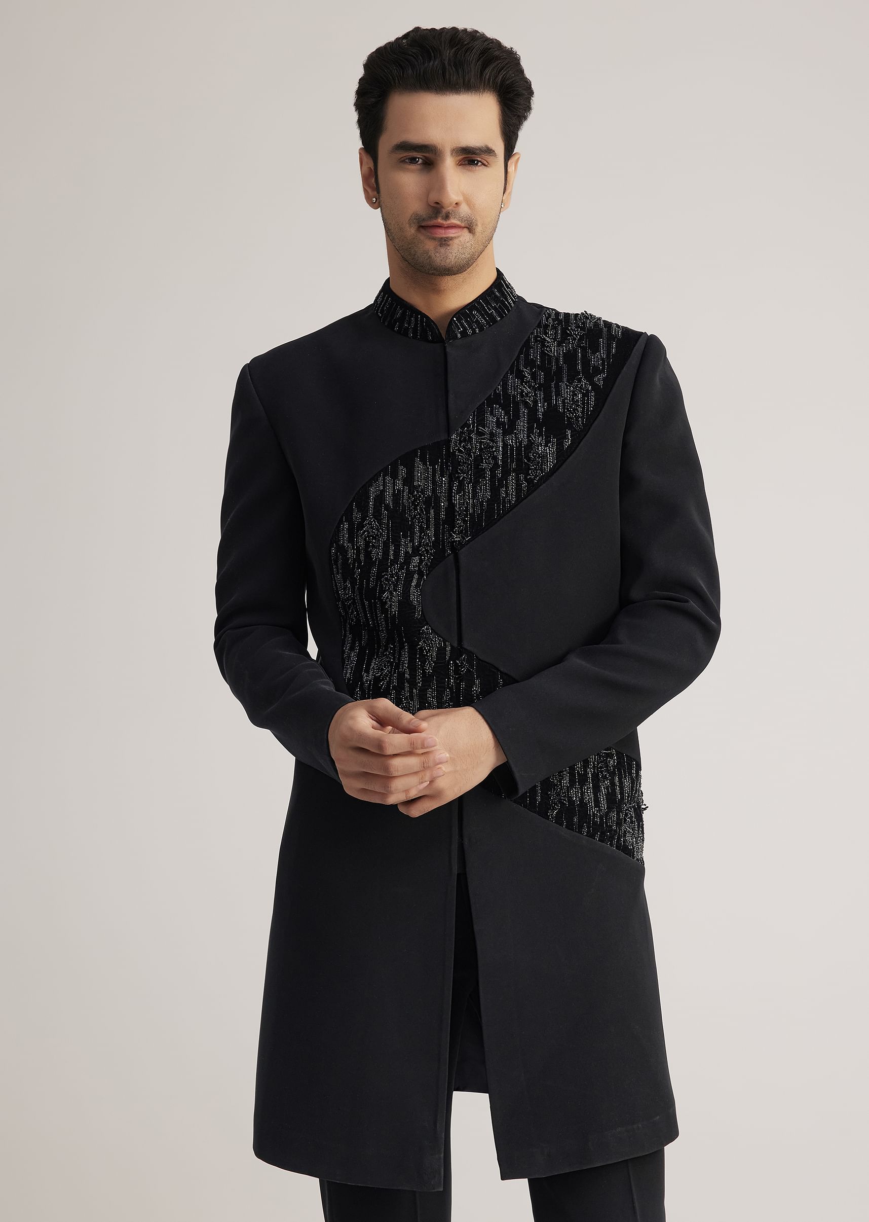 This Black Velvet Indowestern Is A Modern Take On Traditional Elegance Featuring Intricate Salli Cut Dana Pearl Bead Work That Adds A Touch Of Luxury. The Sleek Silhouette And Contemporary Design Make It A Perfect Choice For Evening Galas Cocktail Parties And Formal Events Offering A Blend Of Style And Sophistication. The Tailored Trouser Complements The Sharp Cut Of The Indowestern Ensuring You Stand Out With Confidence And Class At Any HighProfile Gathering.Awarded as the Most Trusted Brand, we're delivering styles you love, just as promised.