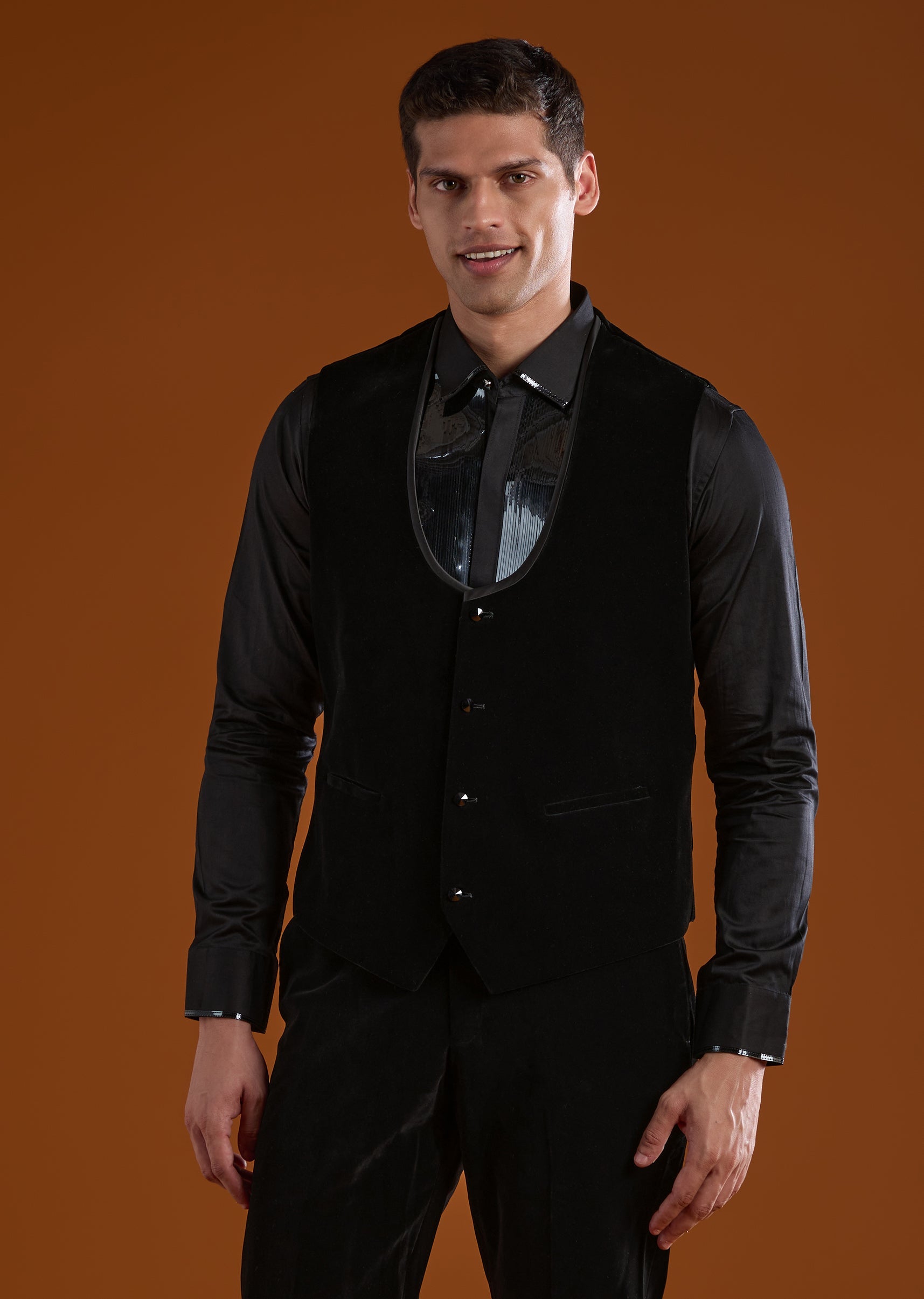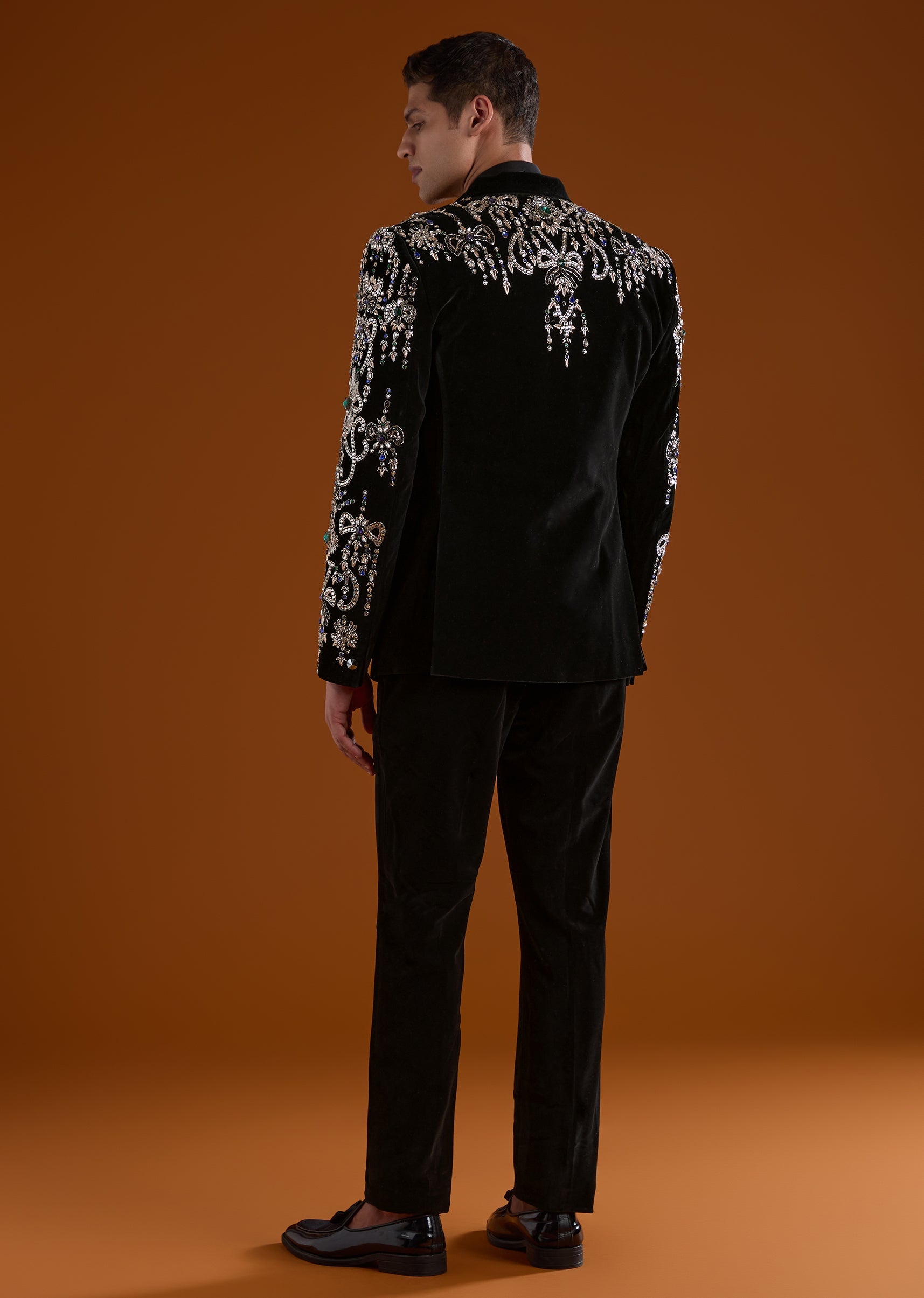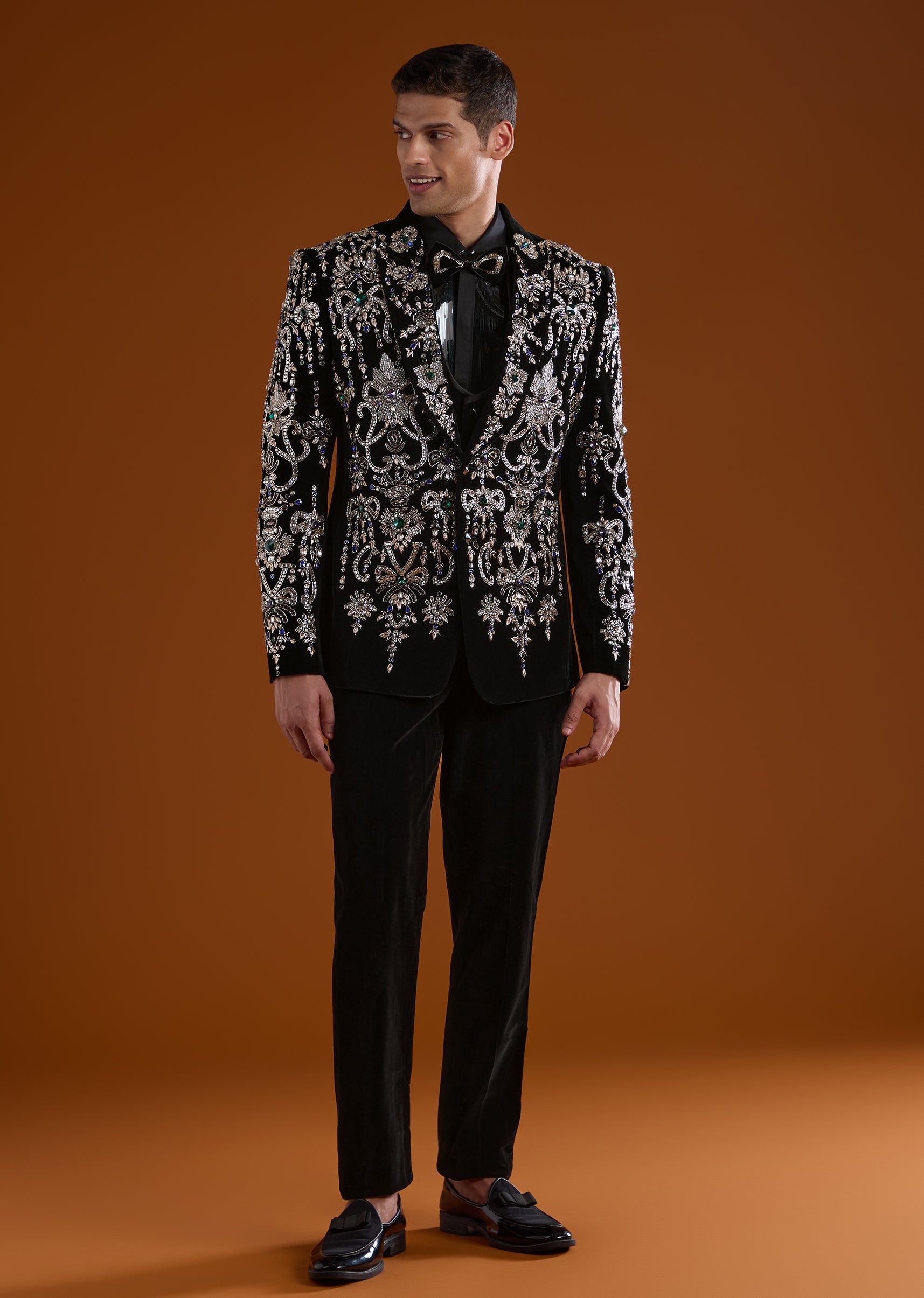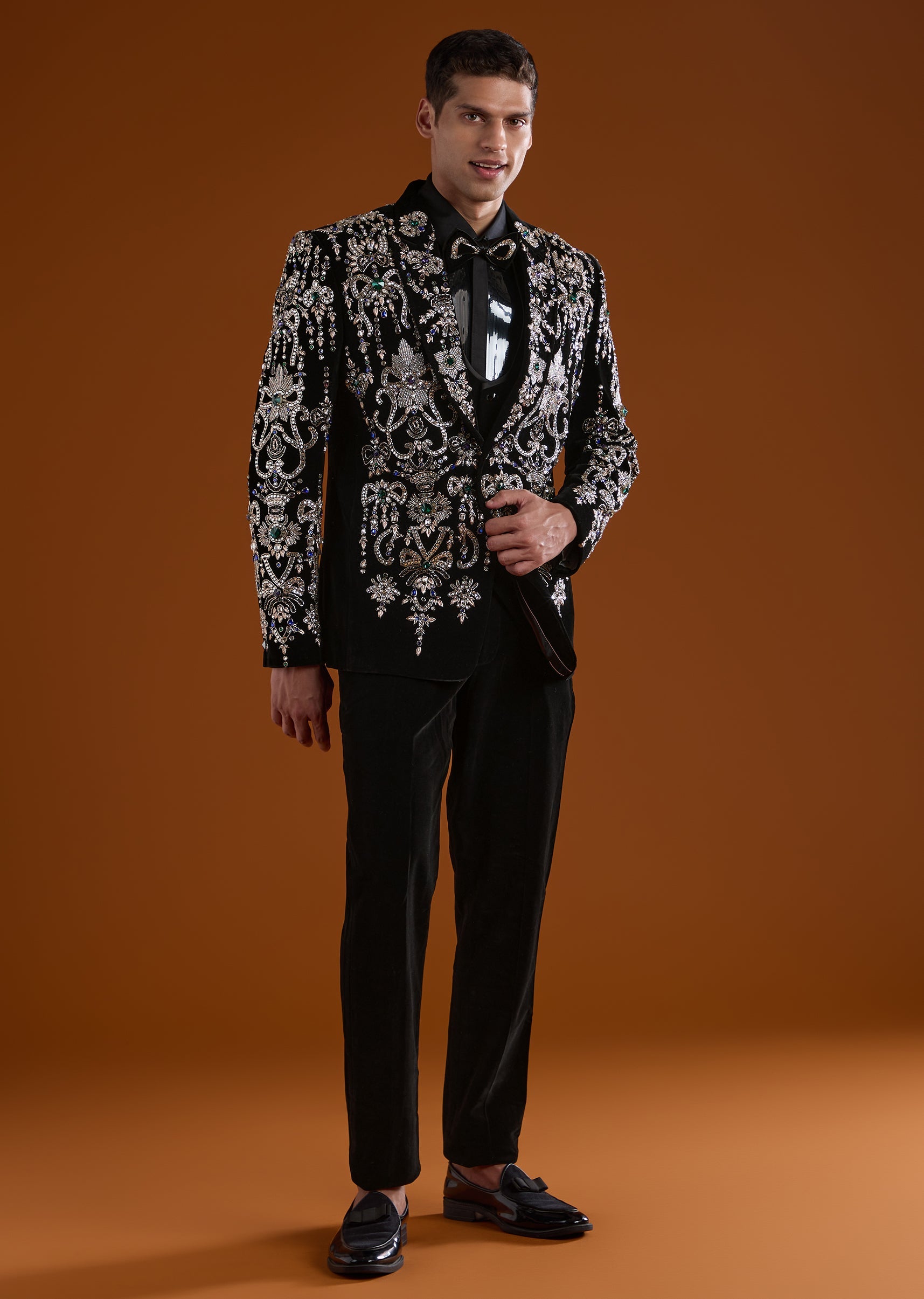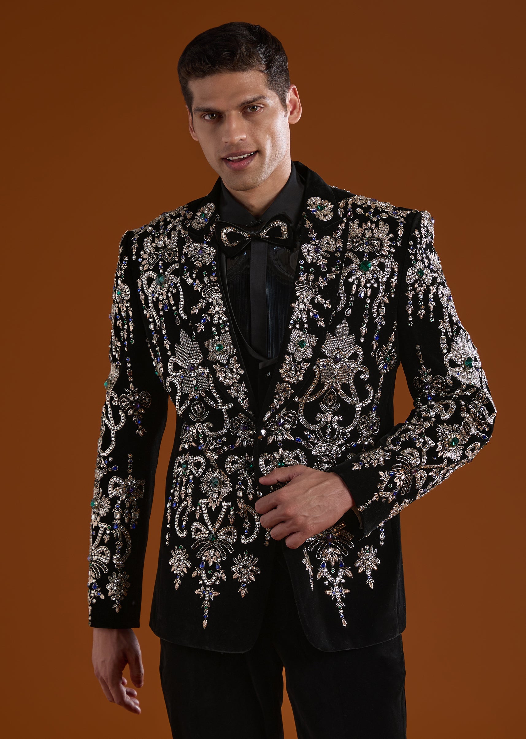 Black Velvet Mens Tuxedo With Stone Zari Cut Dana And Thread Work