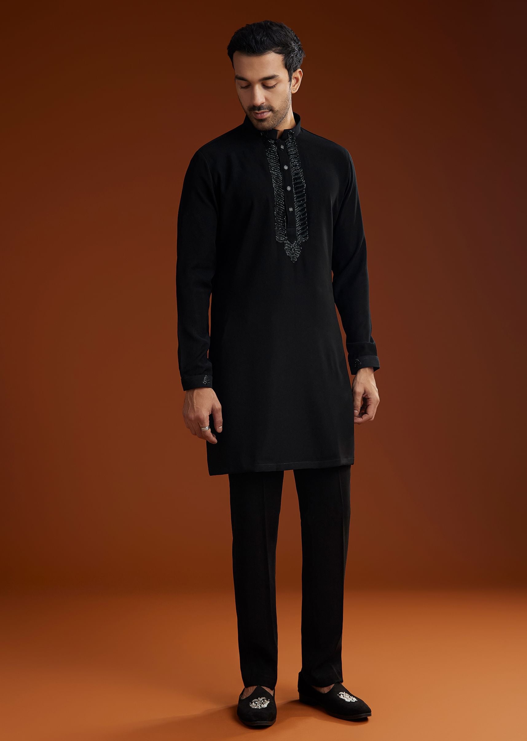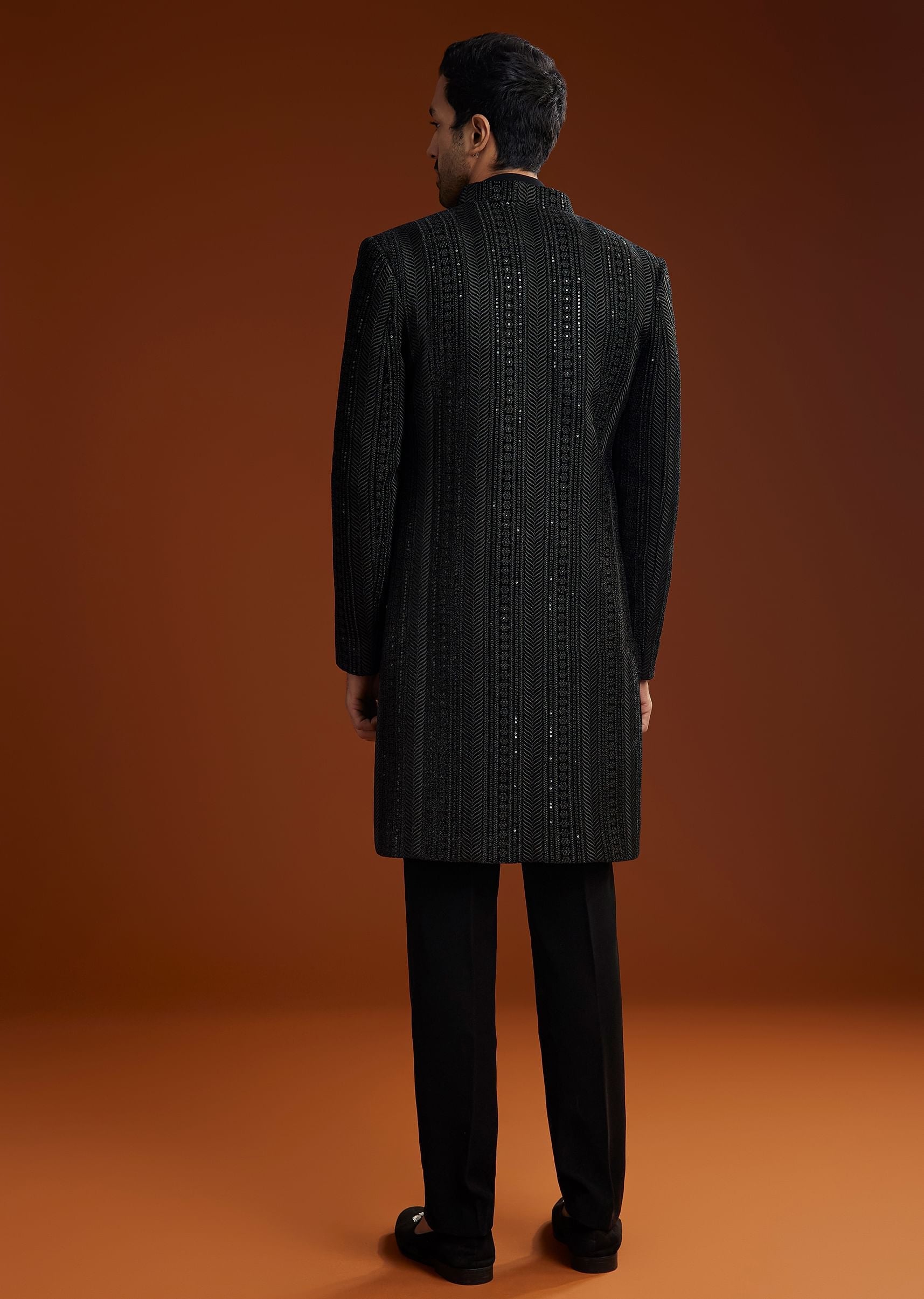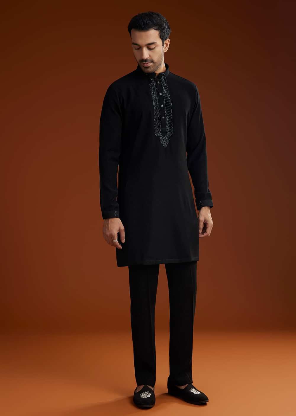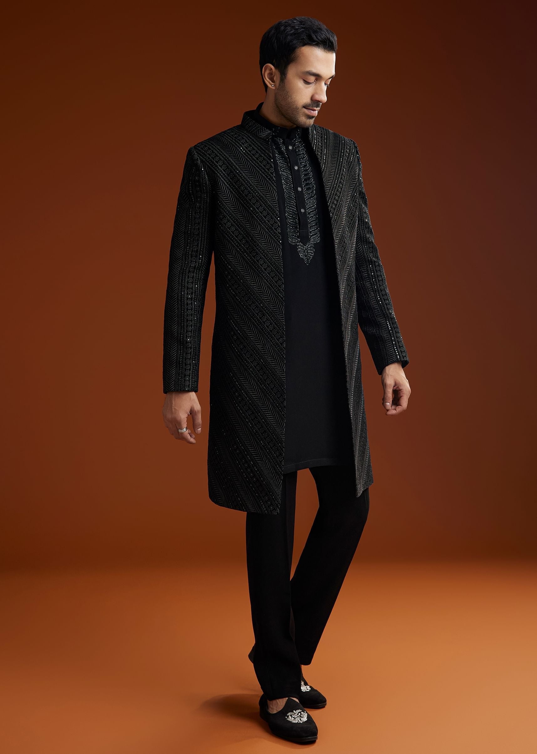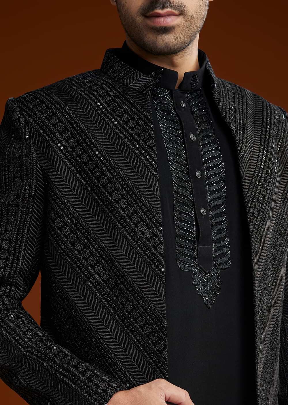 A perfect blend of craftsmanship and sophistication this black velvet open Indojacket set features cut dana and thread work with precision embroidery. The Mandarin collar and button closure add to its refined appeal.Awarded as the Most Trusted Brand we're delivering styles you love just as promised.