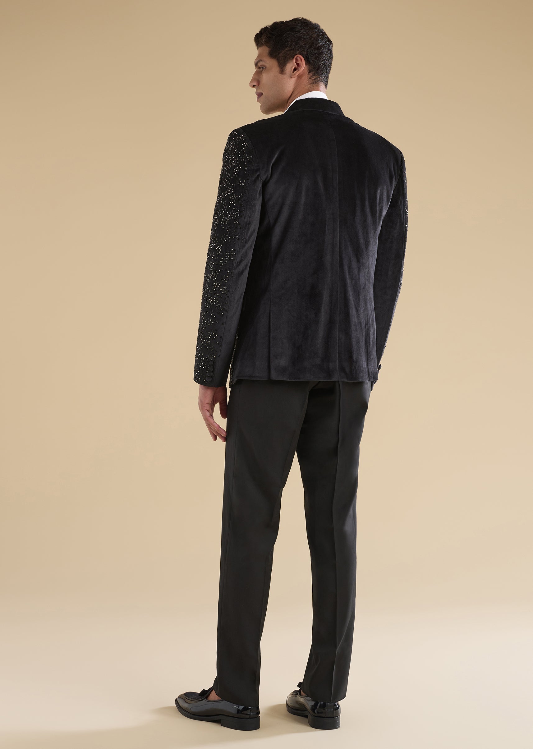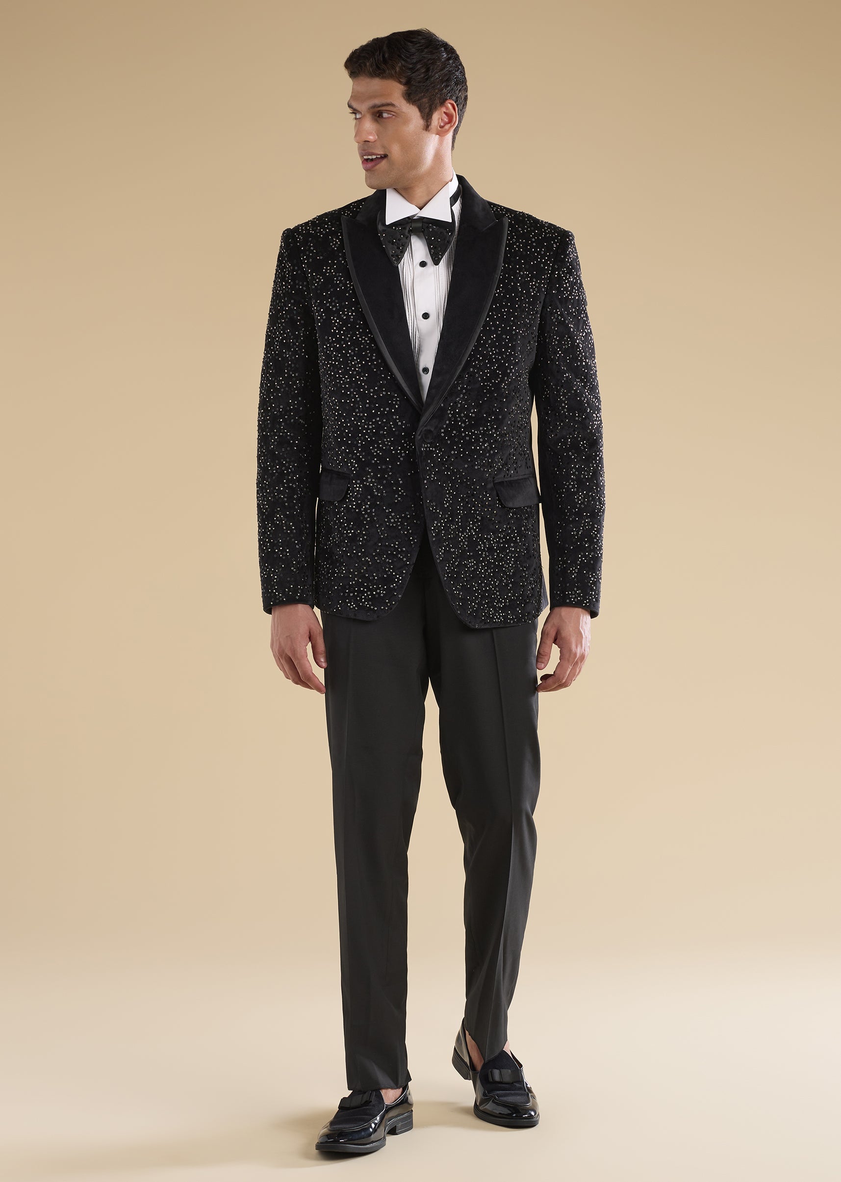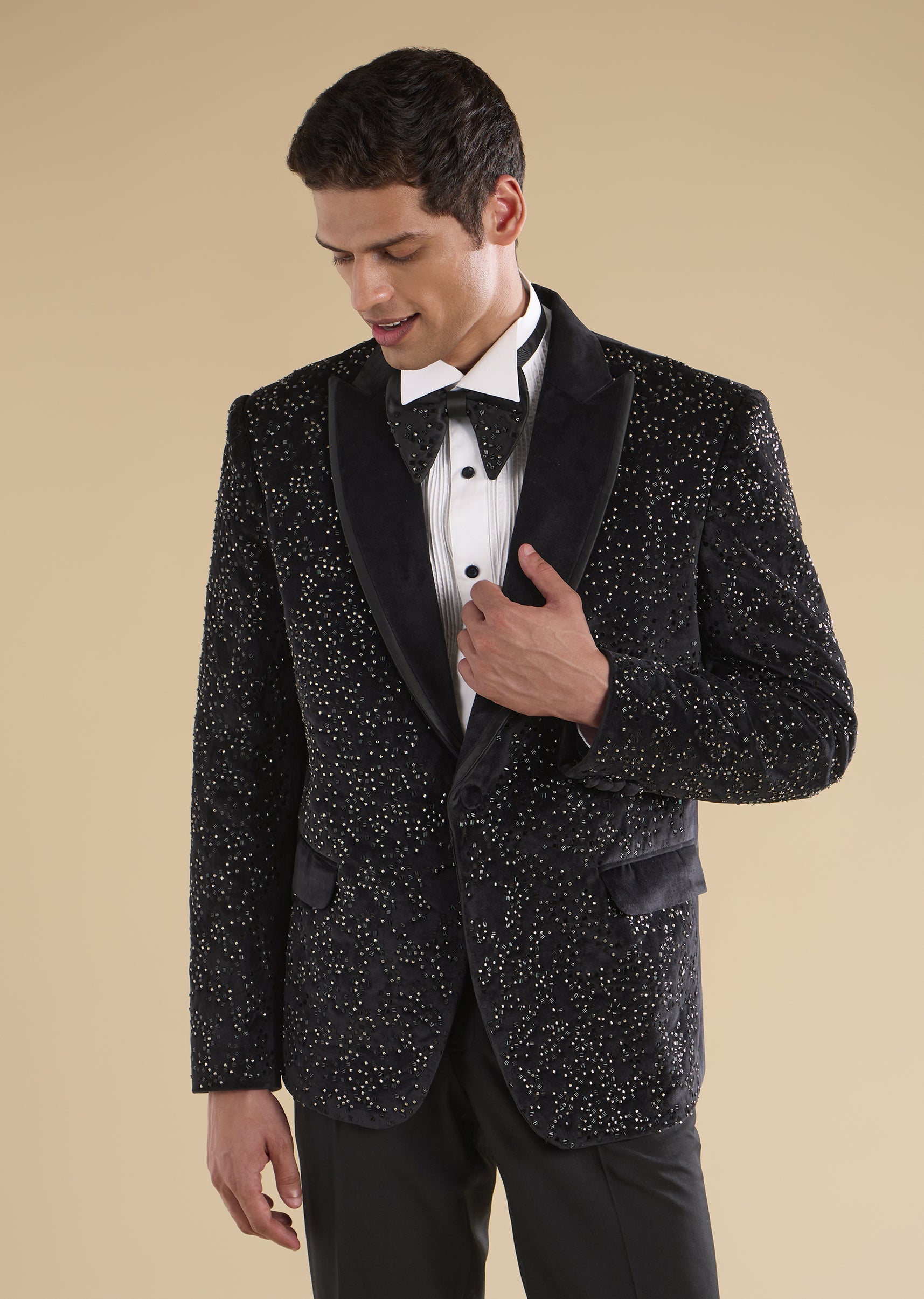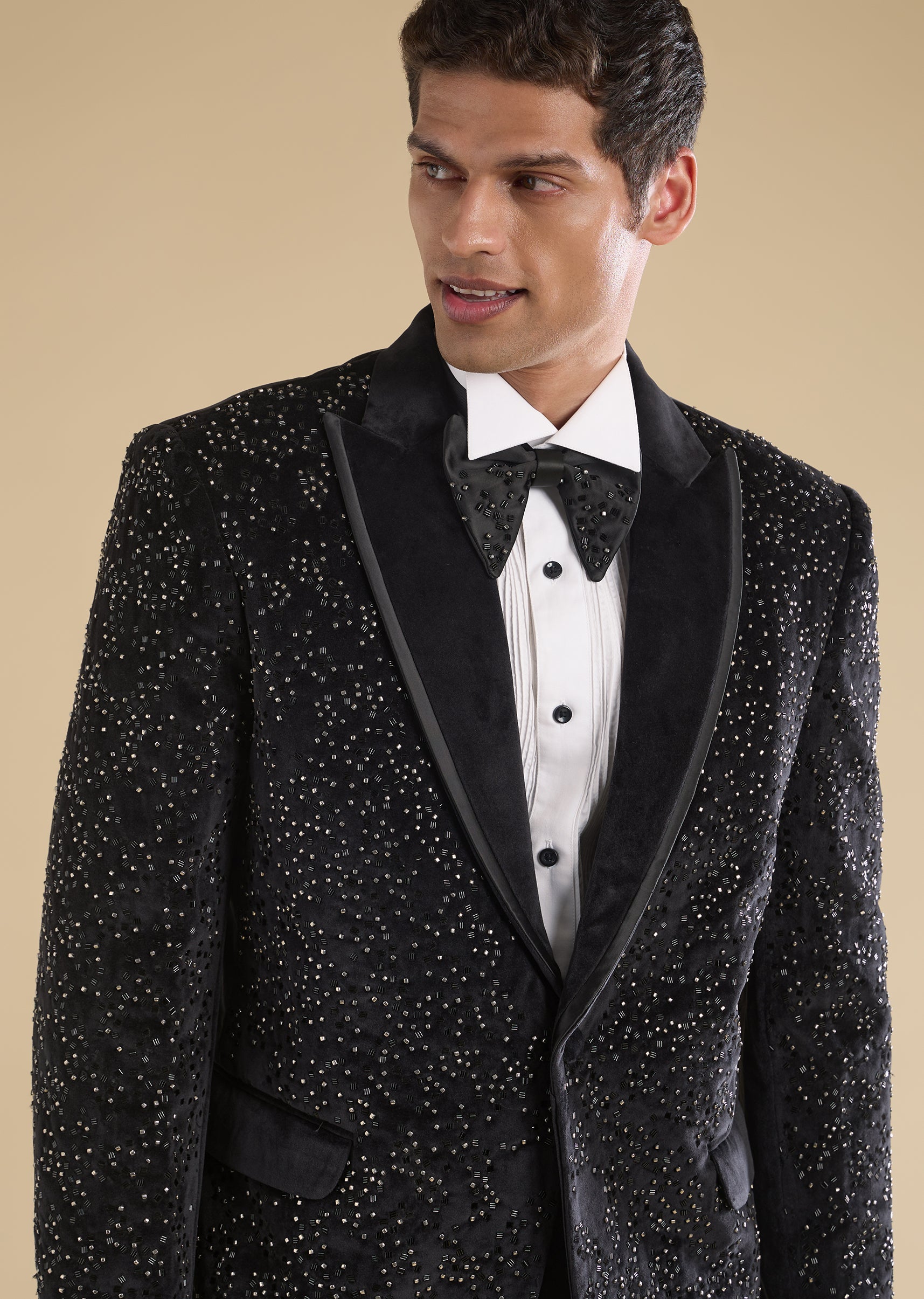 A sharp velvet tuxedo set featuring cut dana and bead detailing—perfect for cocktail nights and reception dressing. Includes tuxedo, waistcoat, bow, shirt, and trousers for a complete formal look with standout texture.