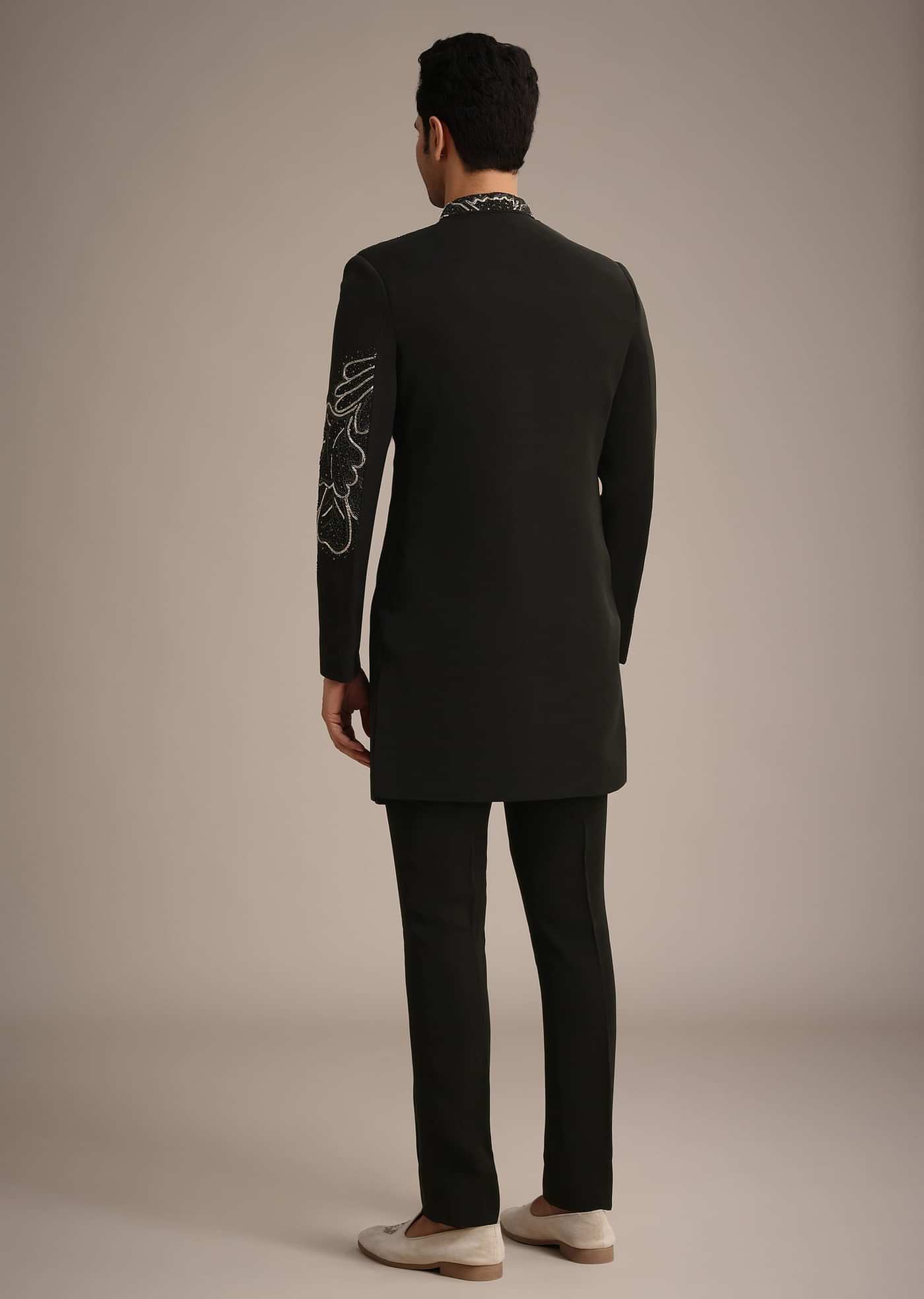 A sdazzling choice for special occasions, festive celebrations and grand weddings is this black jacket kurta set. Made from premium fabric, the jacket is accentuated with a mandarin collar, and... More Product Details