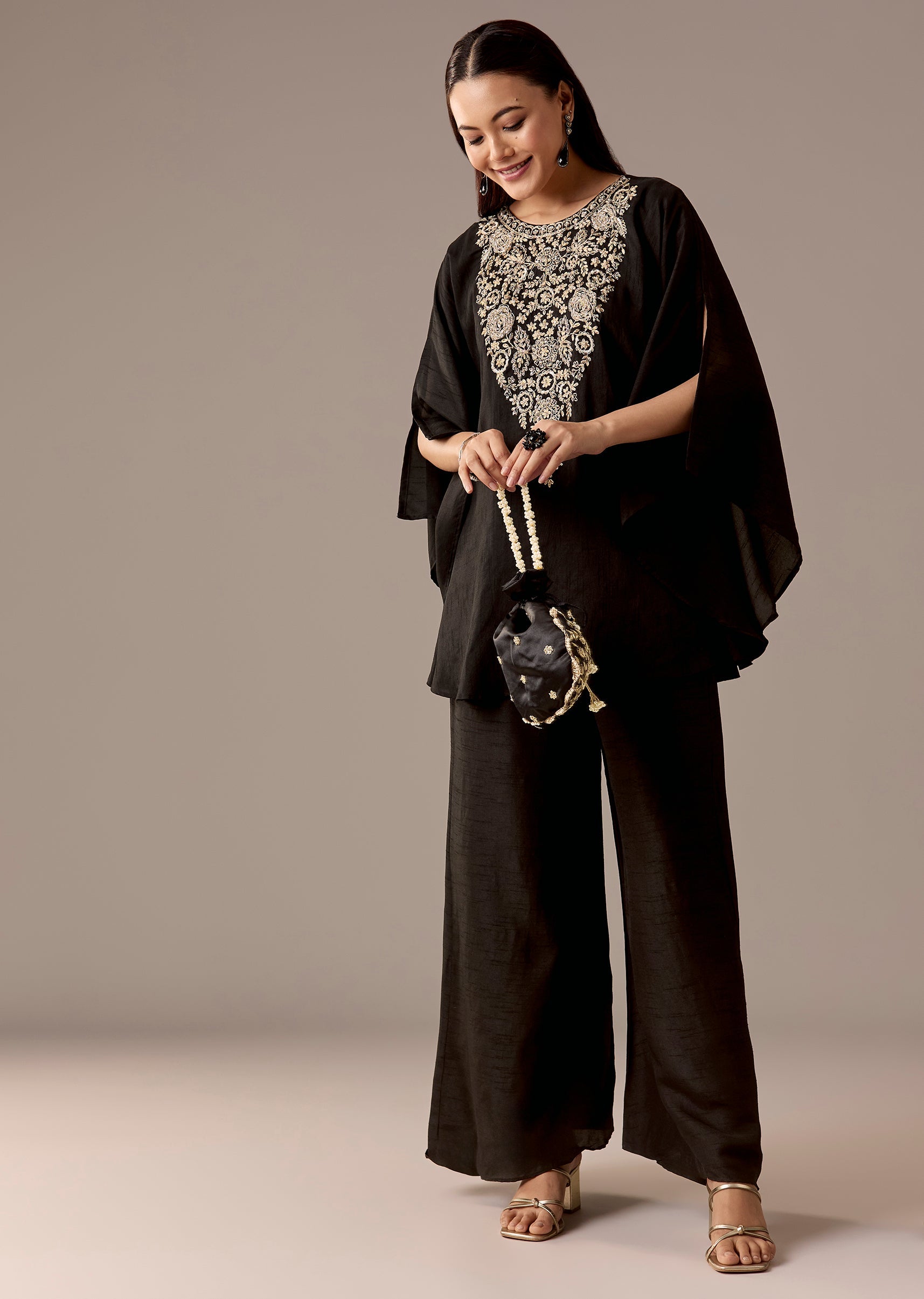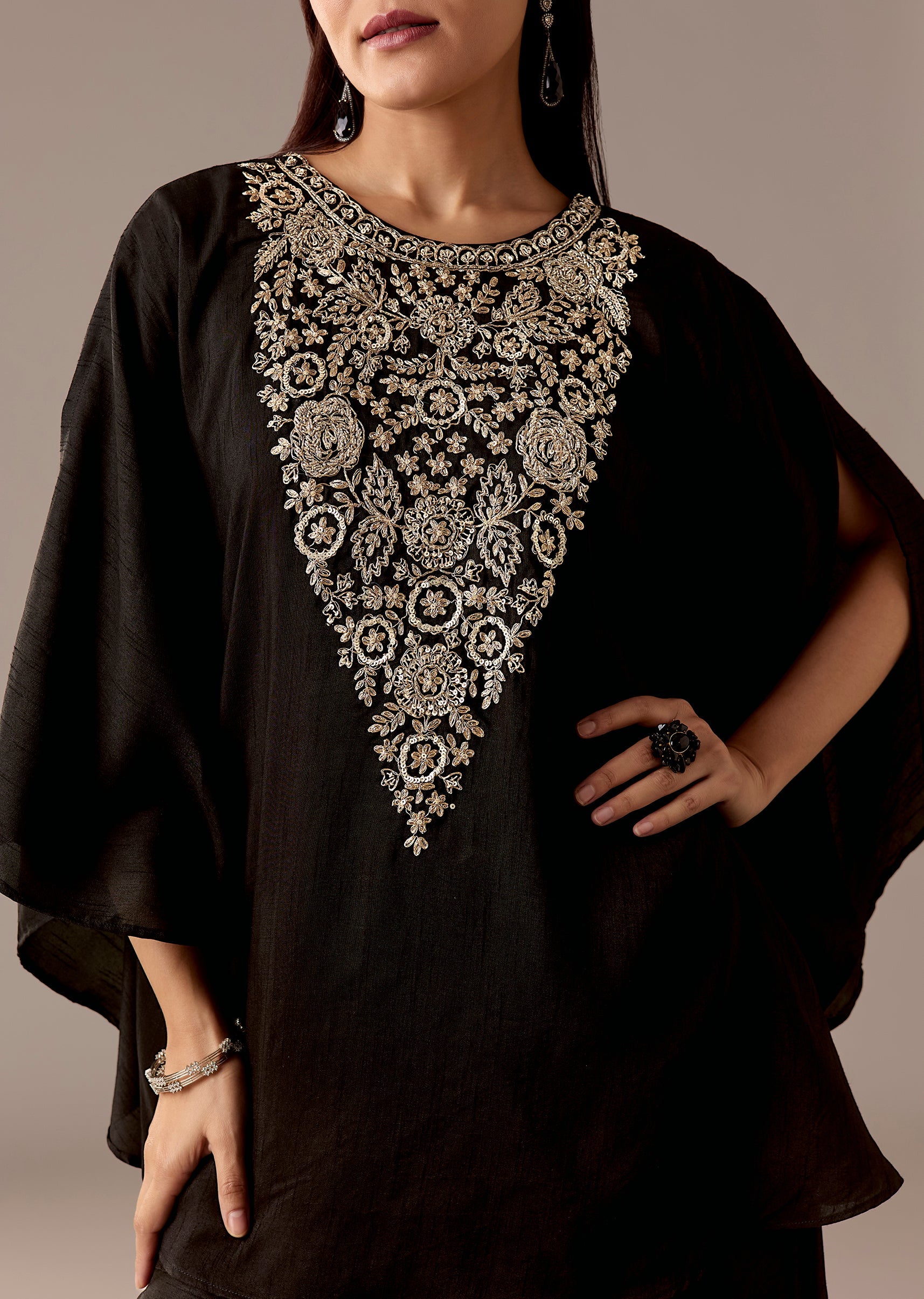 A chic black raw silk kaftan top with zari and cut-dana yoke detailing, paired with mid-waist palazzos. Minimal yet festive—great for evening celebrations and intimate events.Awarded as the Most Trusted Brand, we're delivering styles you love, just as promised.