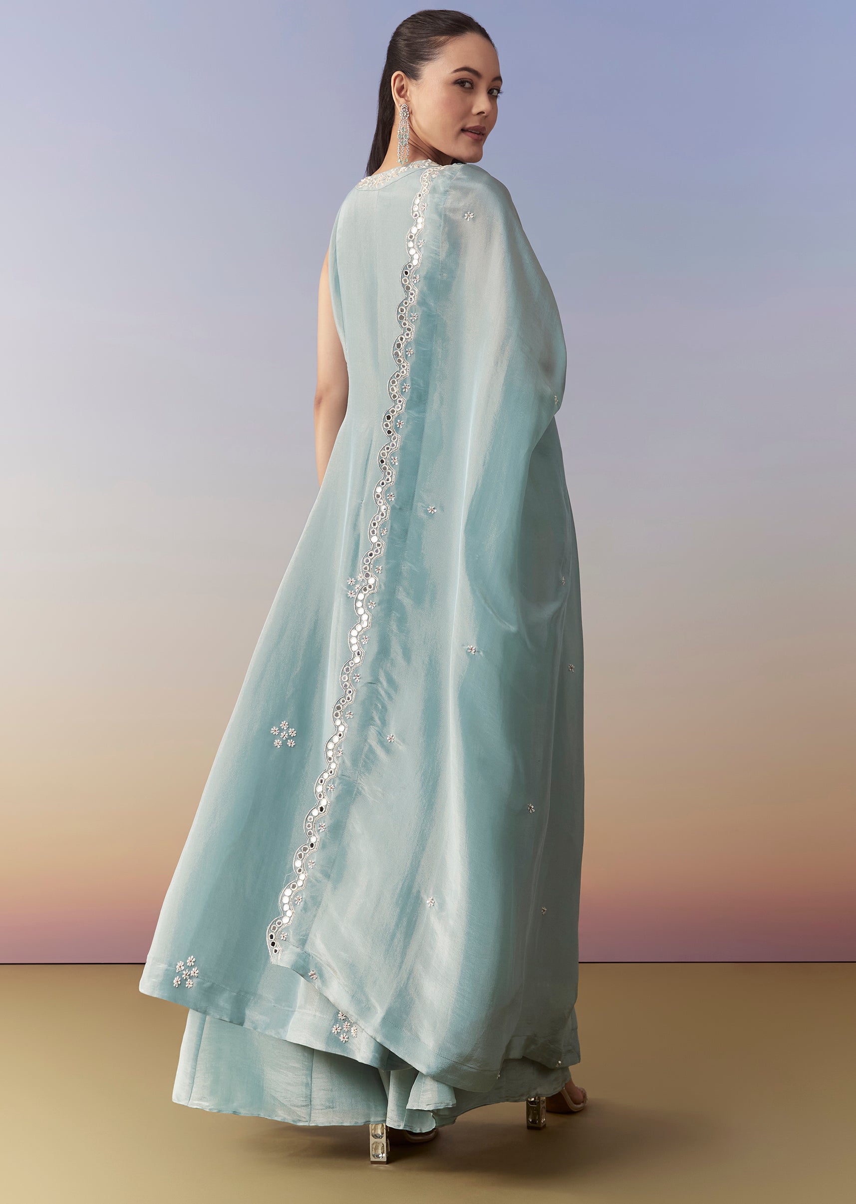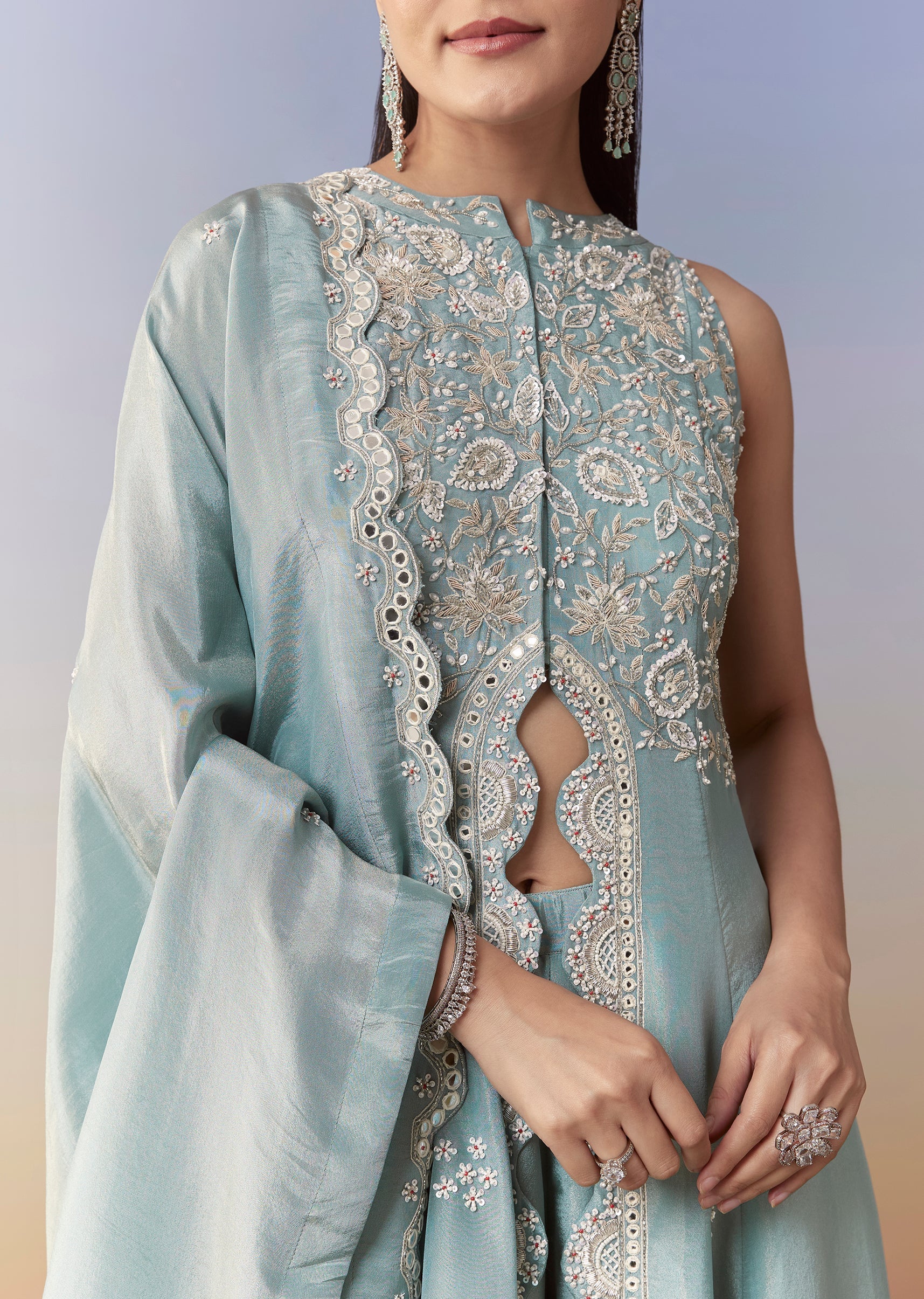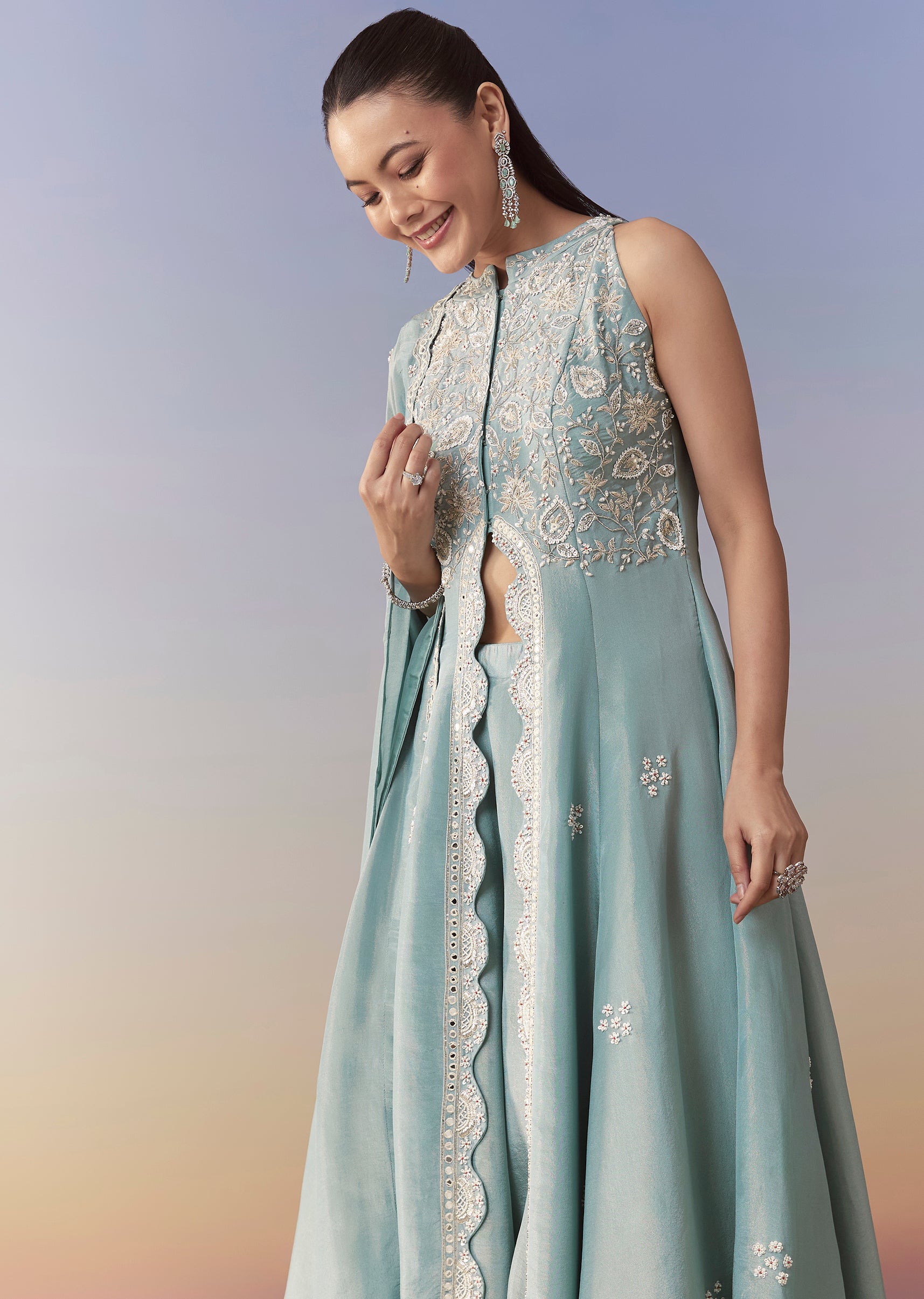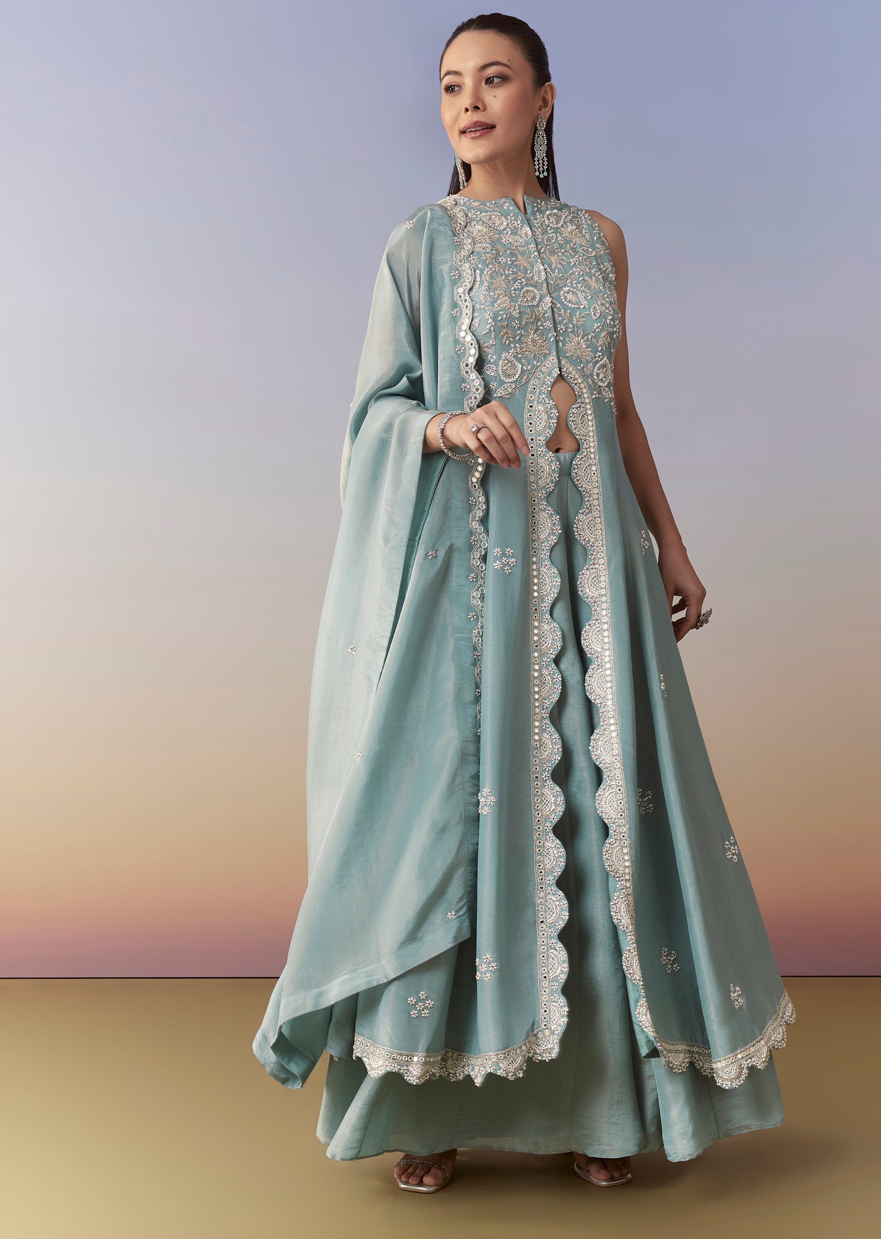 Make a stylish statement with this blue Indo-western front-slit anarkali, beautifully embellished with cutdana and bead work for a refined festive sparkle. The scallop-cut border adds delicate detailing, while the... More Product Details